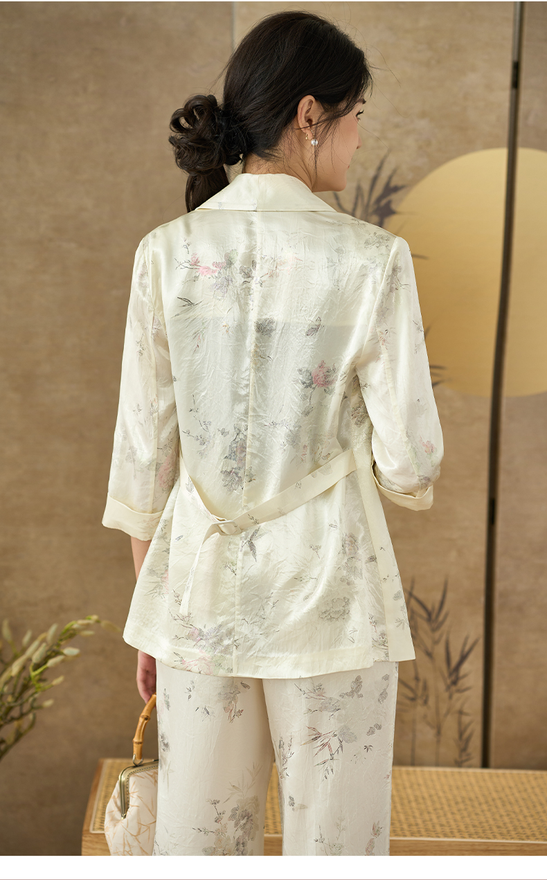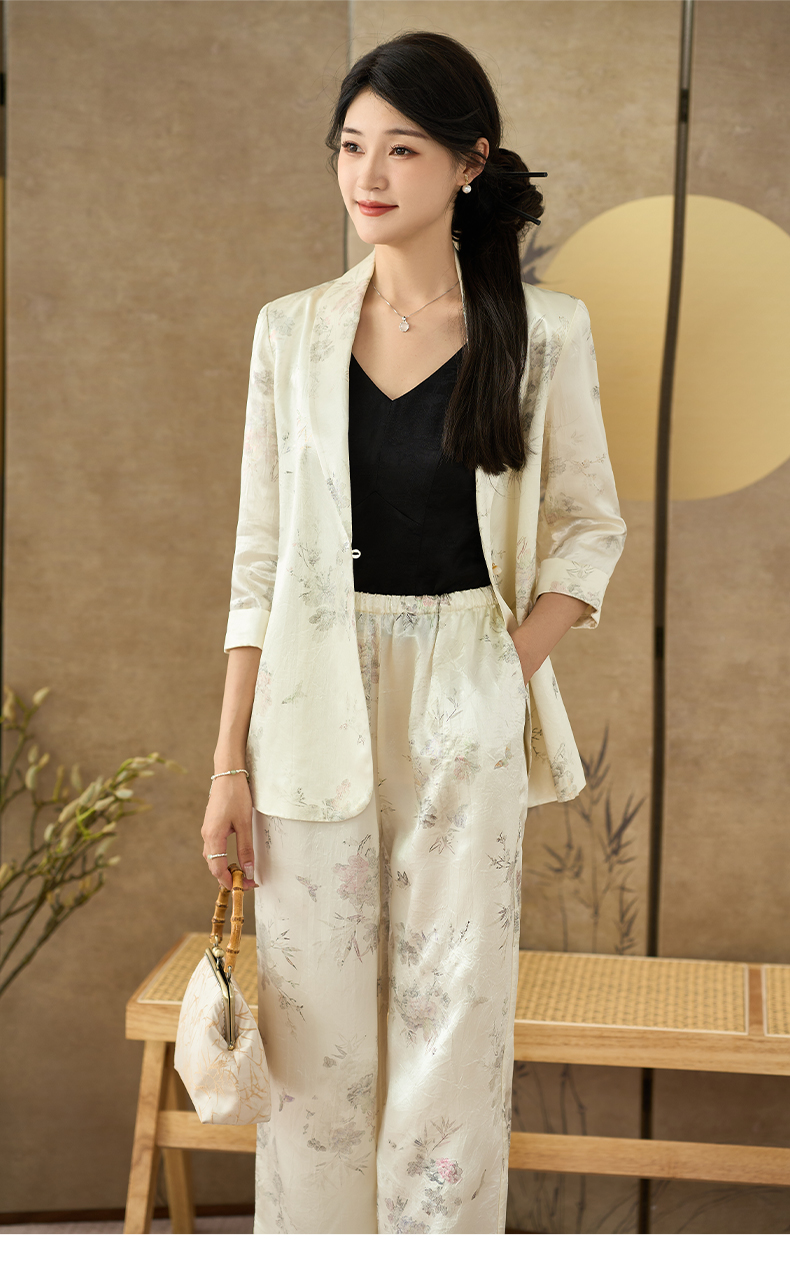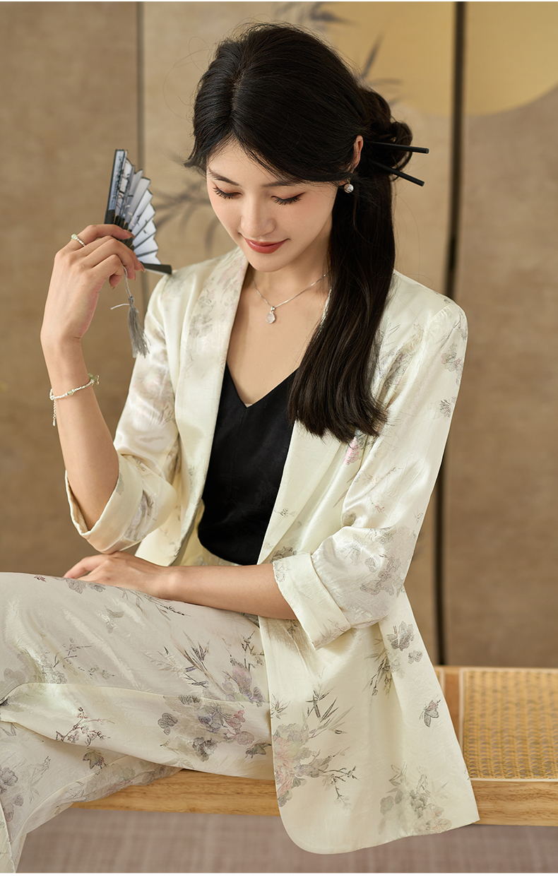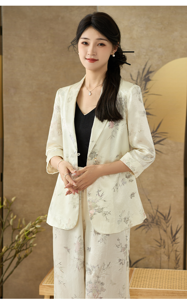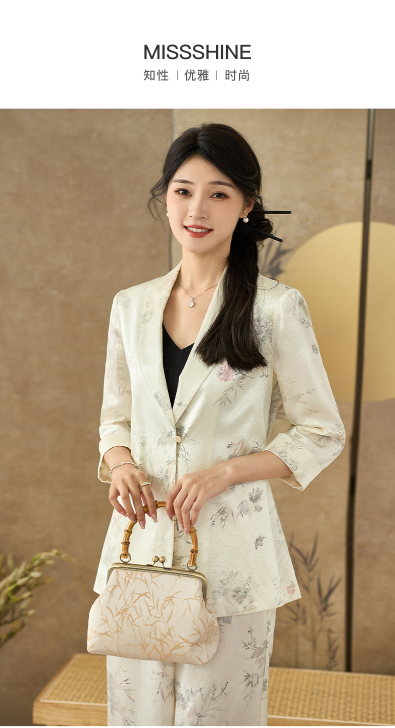 剩S/M 米思阳 夏季新款提花醋酸新中式西装一粒扣百搭七分袖上衣2689