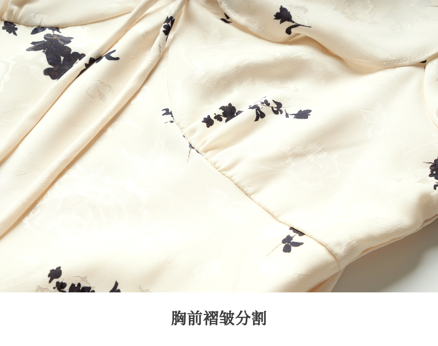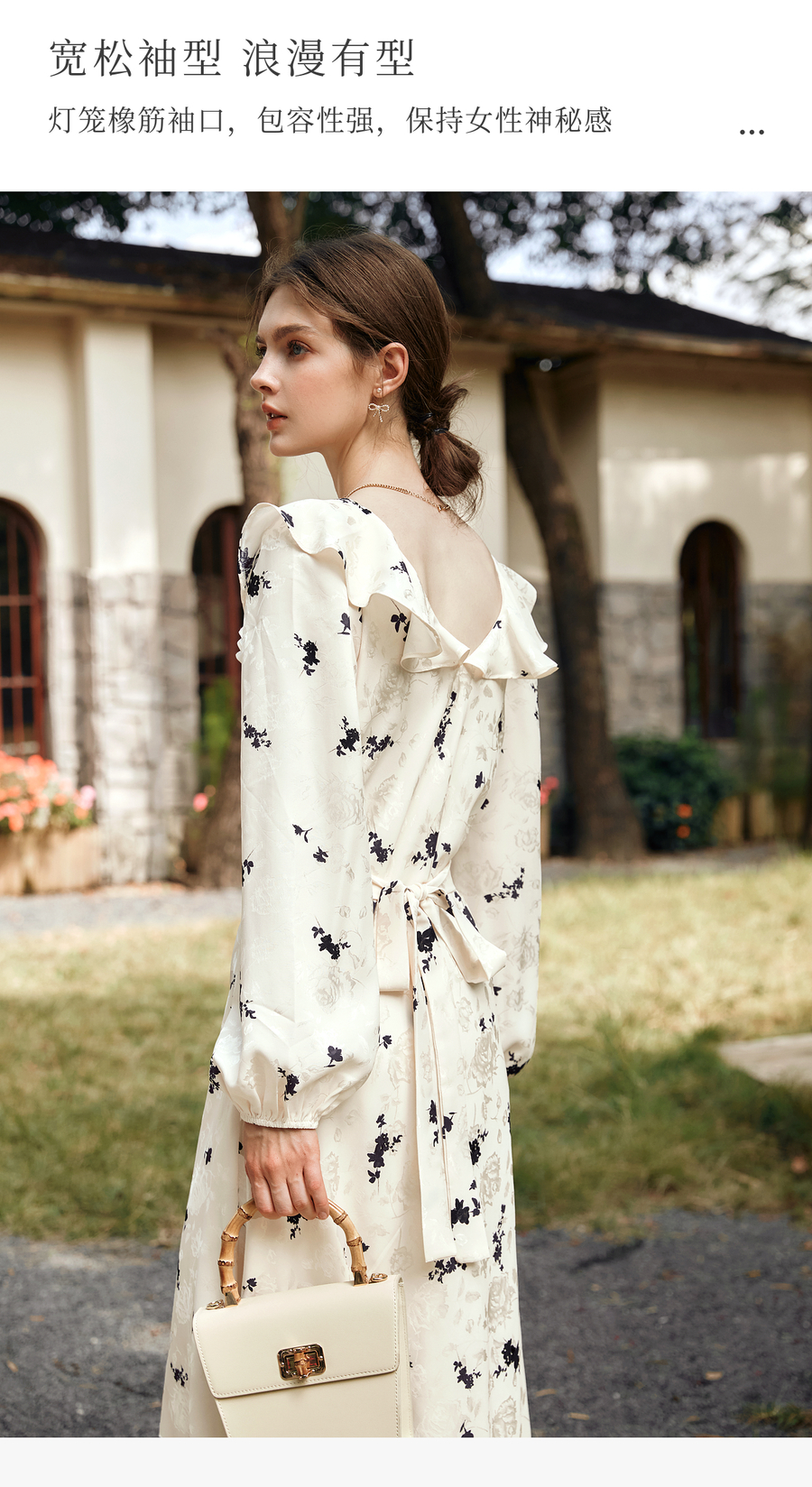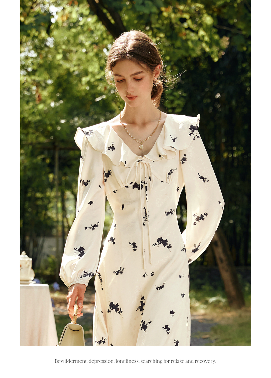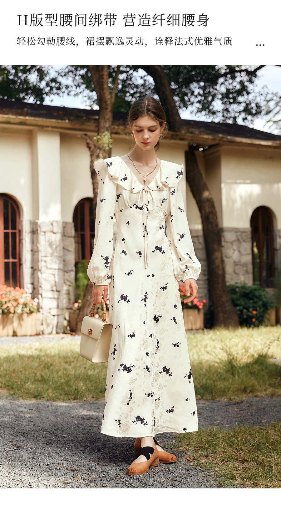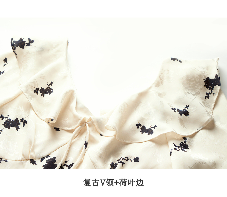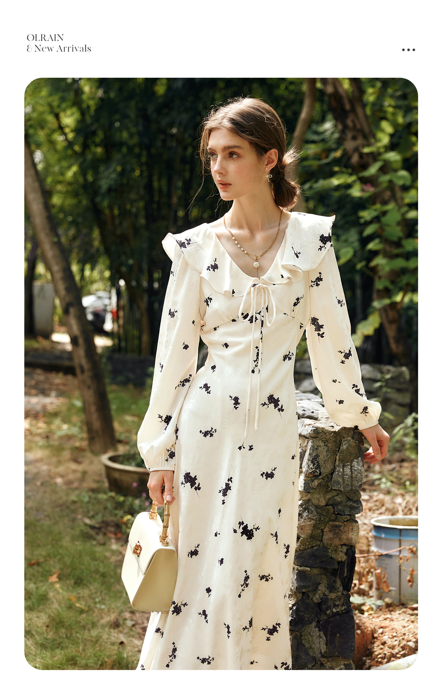 OLrain欧芮儿法式杏色连衣裙女春季2025年新款V领荷叶边碎花裙