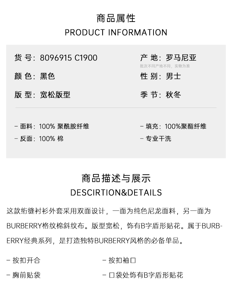 【一】BURBERRY 巴宝莉 男士 B 字盾徽标刺绣双面绗缝尼龙棉服 黑色 8096915 C1900