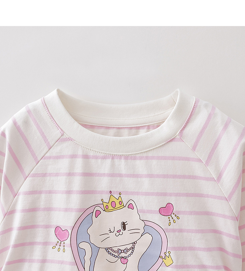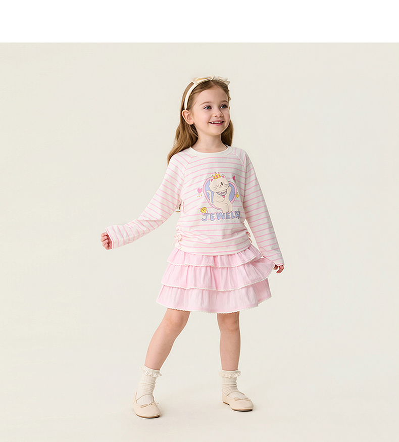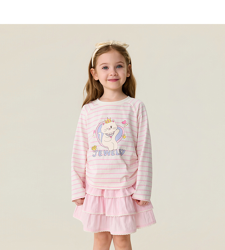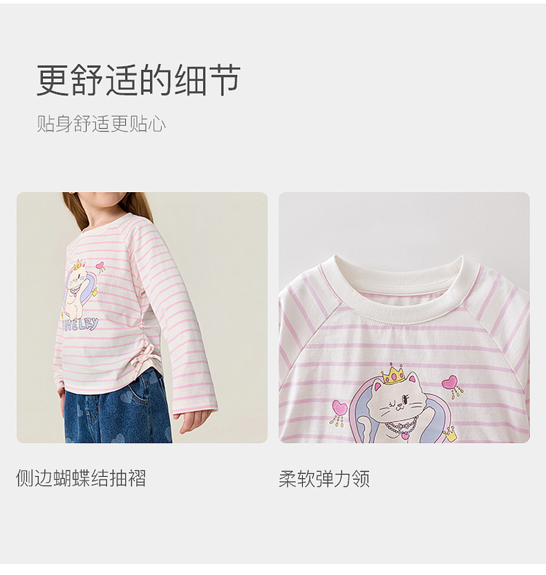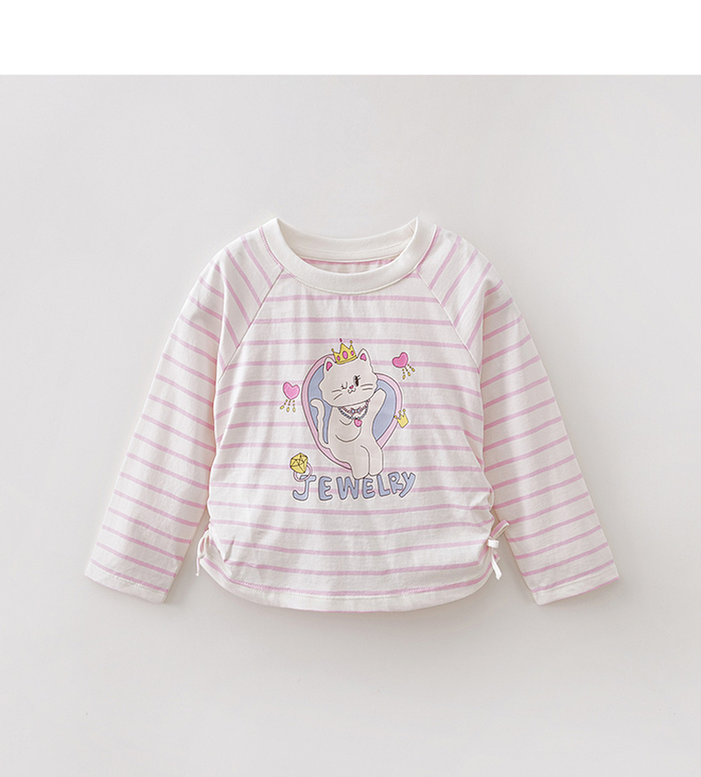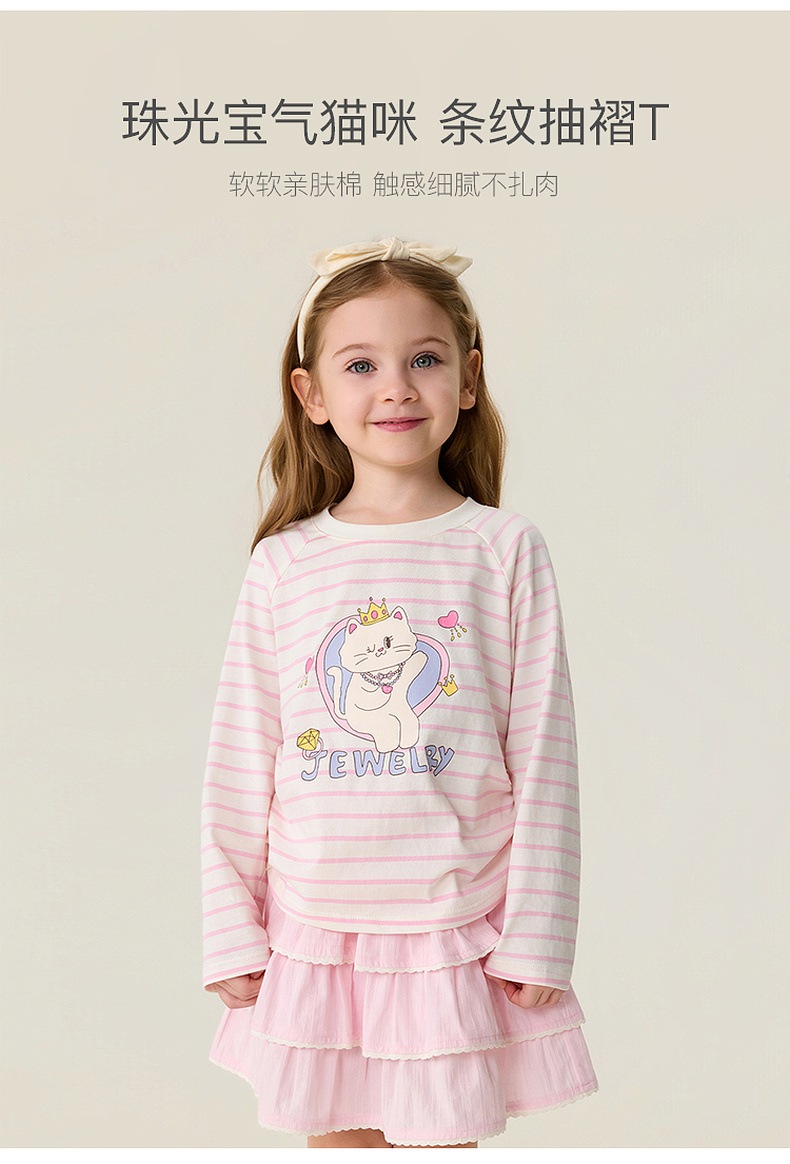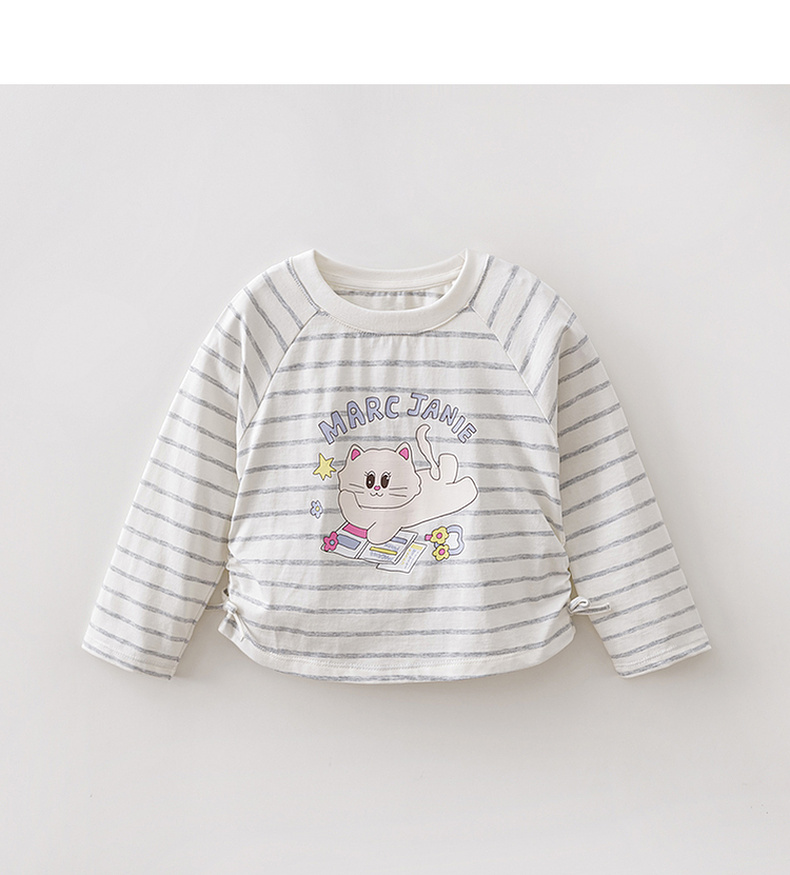 马克珍妮珠光宝气猫咪女童纯棉条纹抽褶T恤2026年春装新款560082