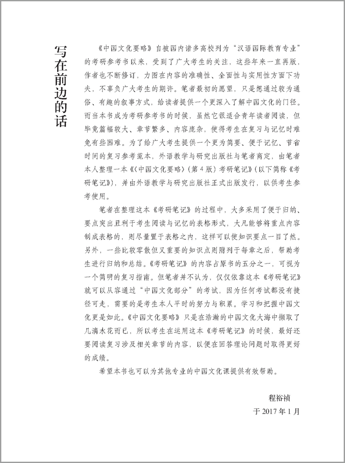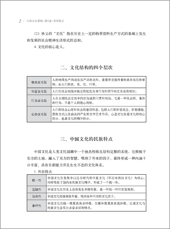 《中国文化要略》是一本全面介绍中国文化知识的普及性读物,全面系统地讲述了中国文化的主要内容和核心精神。《中国文化要略(第4版)考研笔记》由程裕祯老师亲自整理,为广大考生提供了一个要点鲜明、便于记忆的复习参考范本。书中多以表格形式总结出《中国文化要略(第4版)》中的重要知识点,还补充了很多相关的拓展知识,都是研究生业务课考试中的必考点和重难点。两本书搭配使用,先前面掌握内容,再识记知识点,*后查缺补漏,能够有效提高复习和备考效率。
