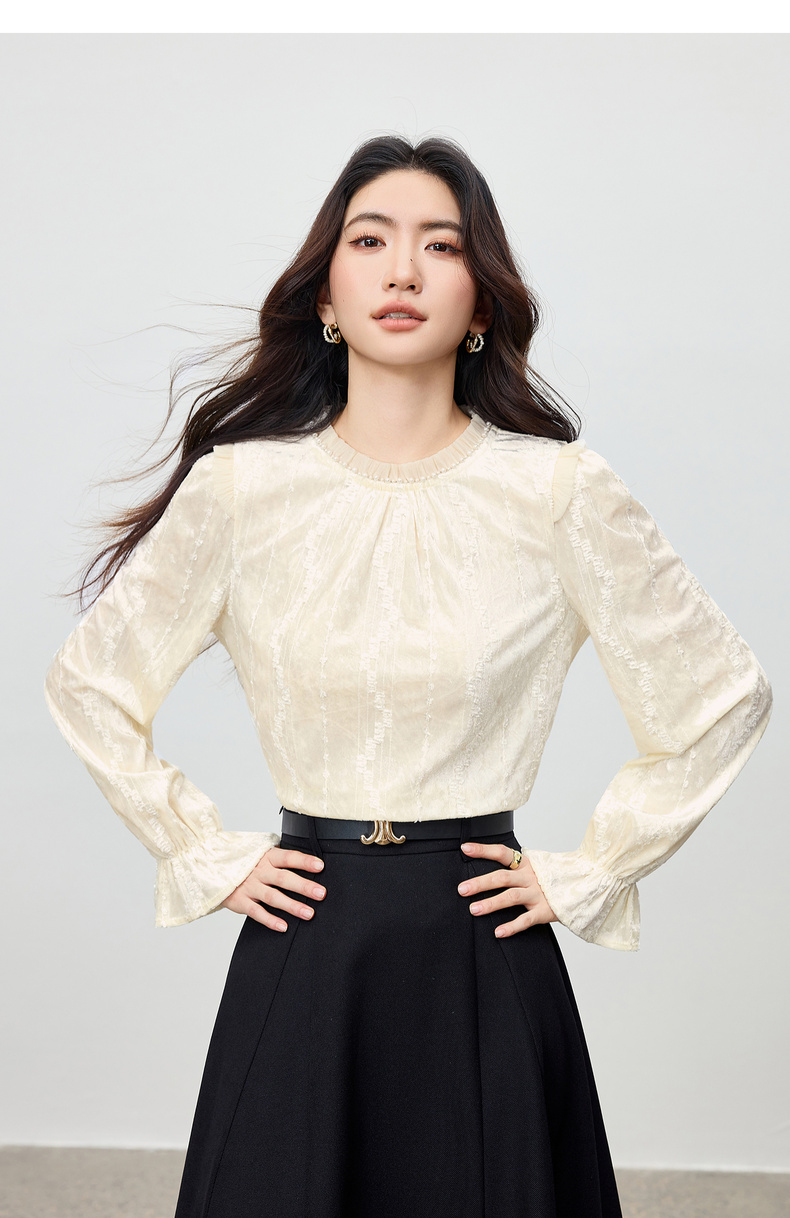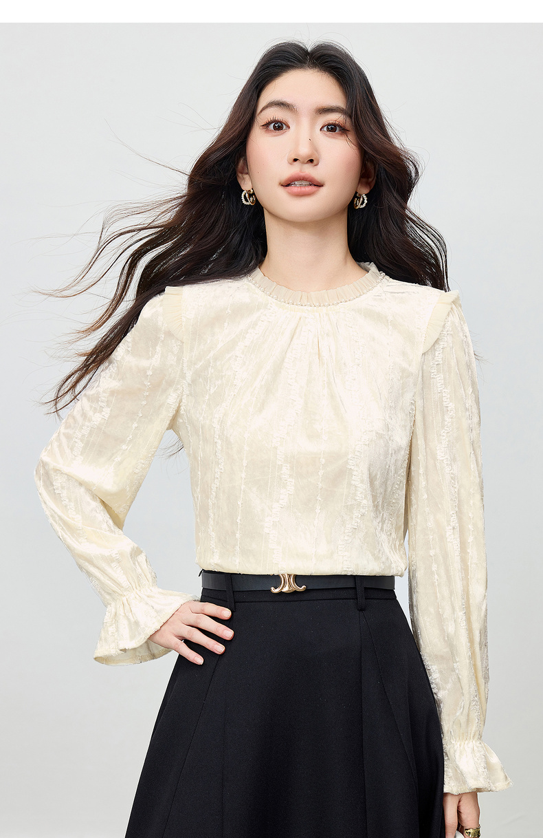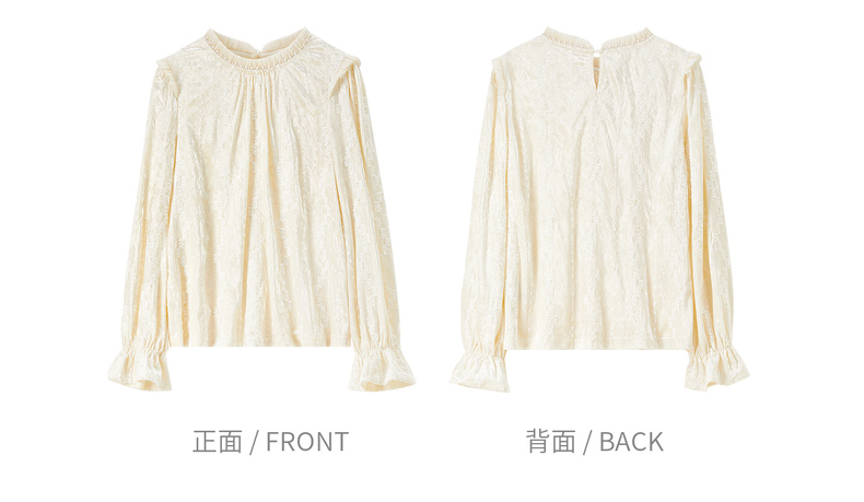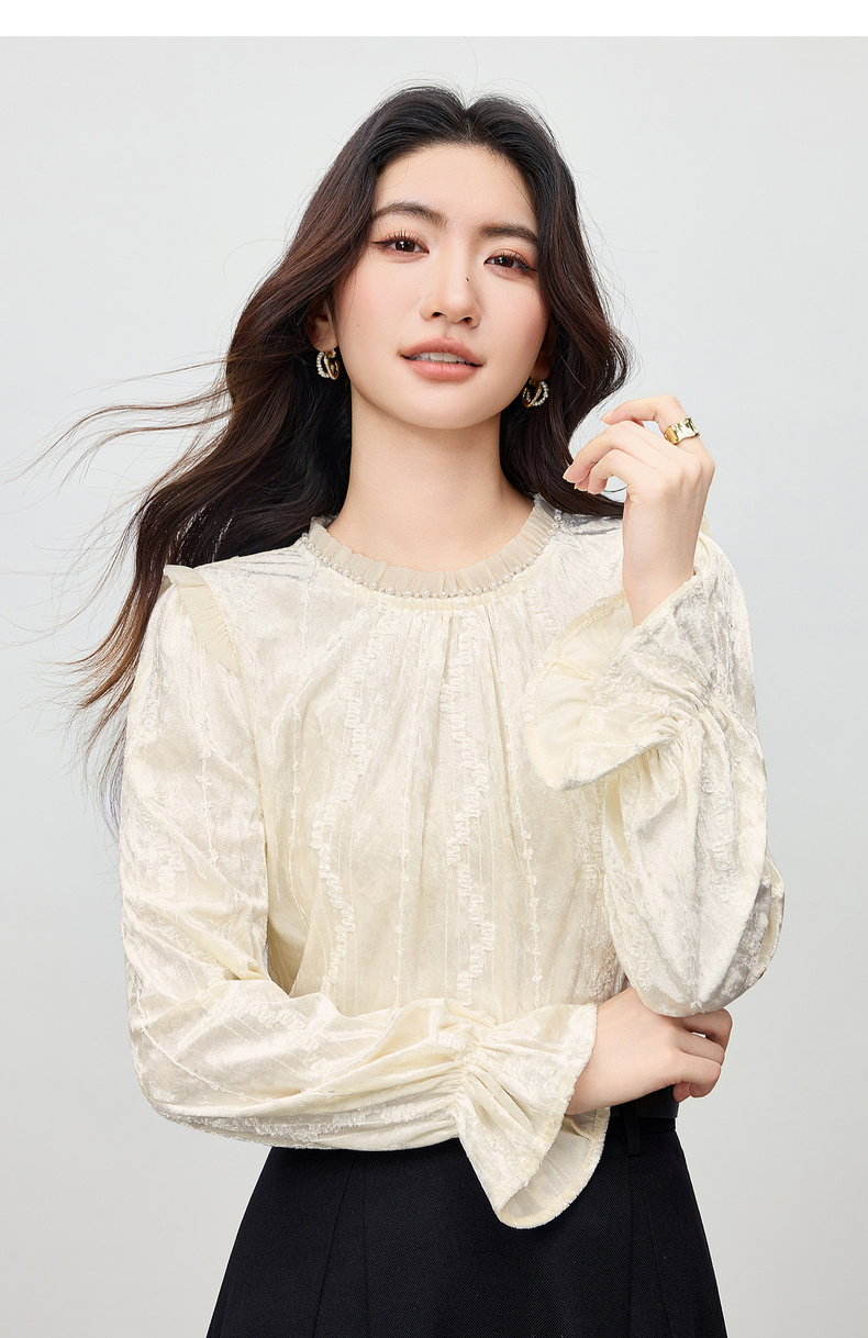 【内购】【珍珠花边】荷叶领泡泡喇叭袖流苏肌理丝绒外穿内搭打底衫-154SF3898