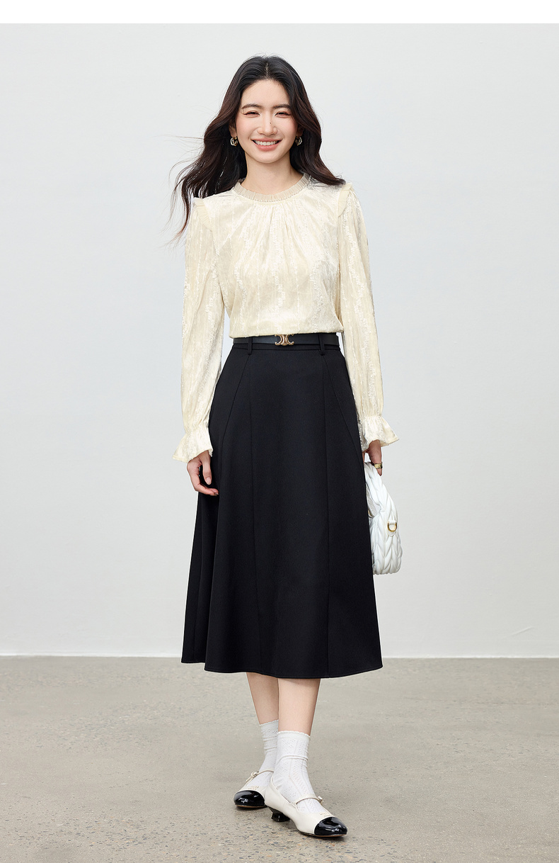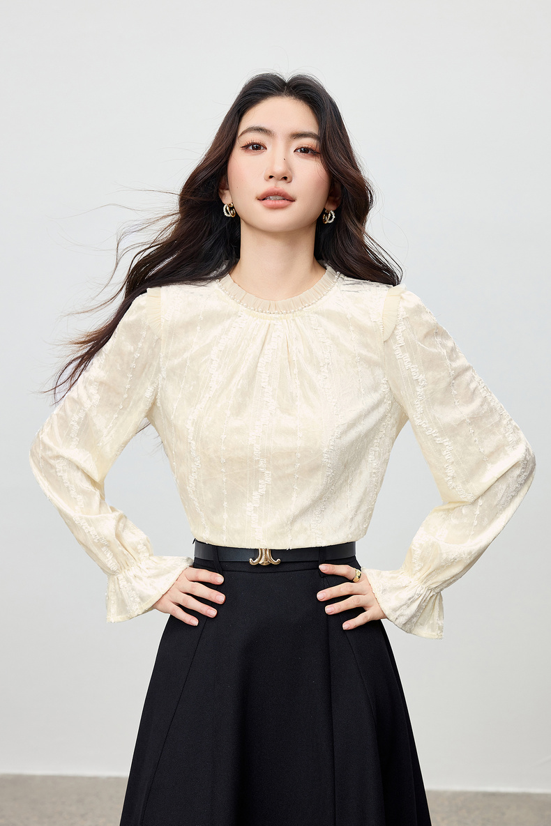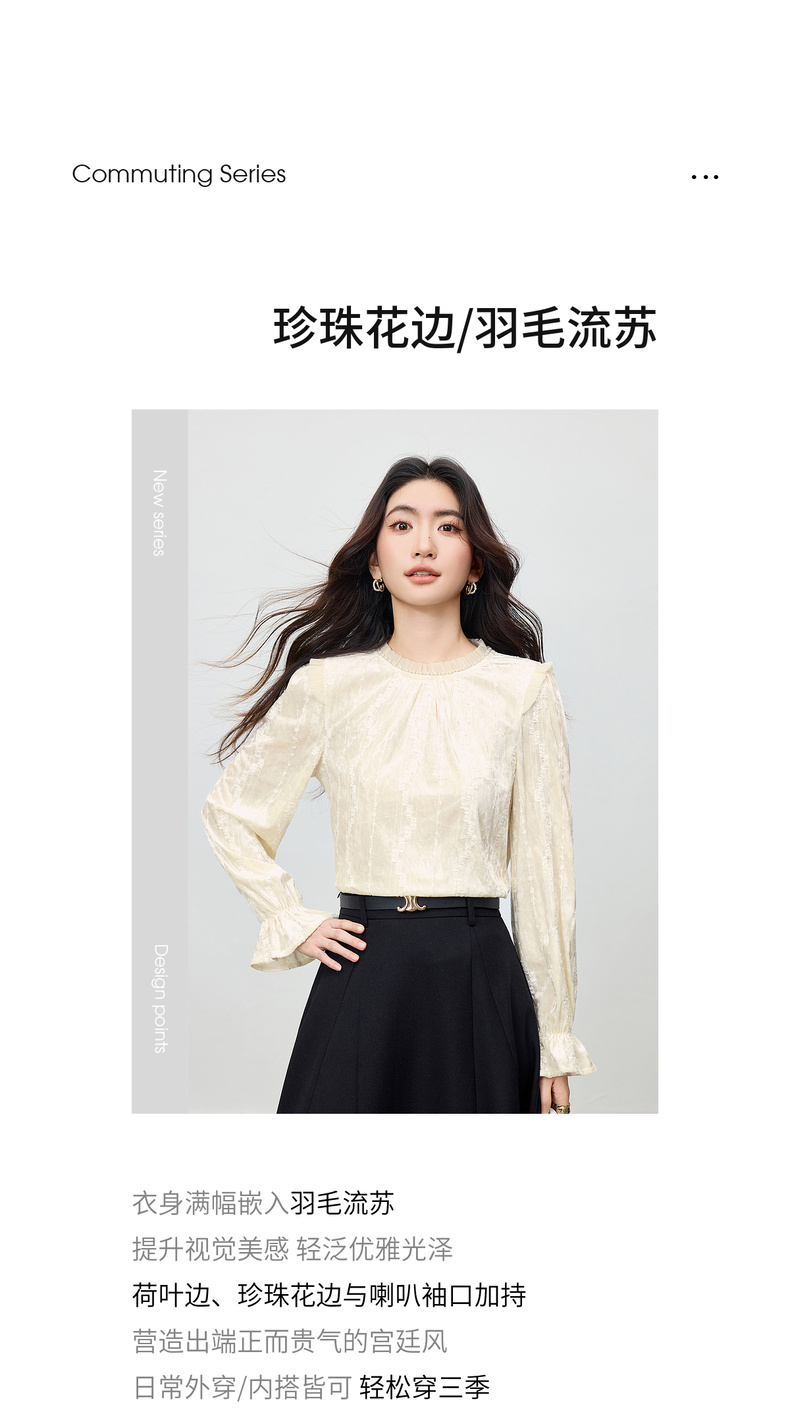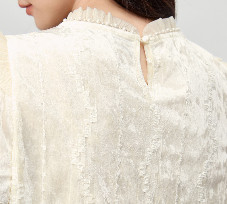 【内购】【珍珠花边】荷叶领泡泡喇叭袖流苏肌理丝绒外穿内搭打底衫-154SF3898