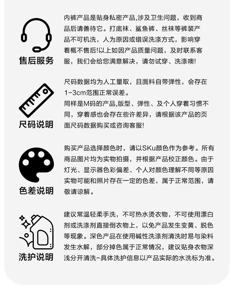 ☆售后政策:不影响二次销售,支持7天无理由退换货,超时不予处理!【内衣裤不支持试穿/有特殊情况需要退换的请保持干净整齐】