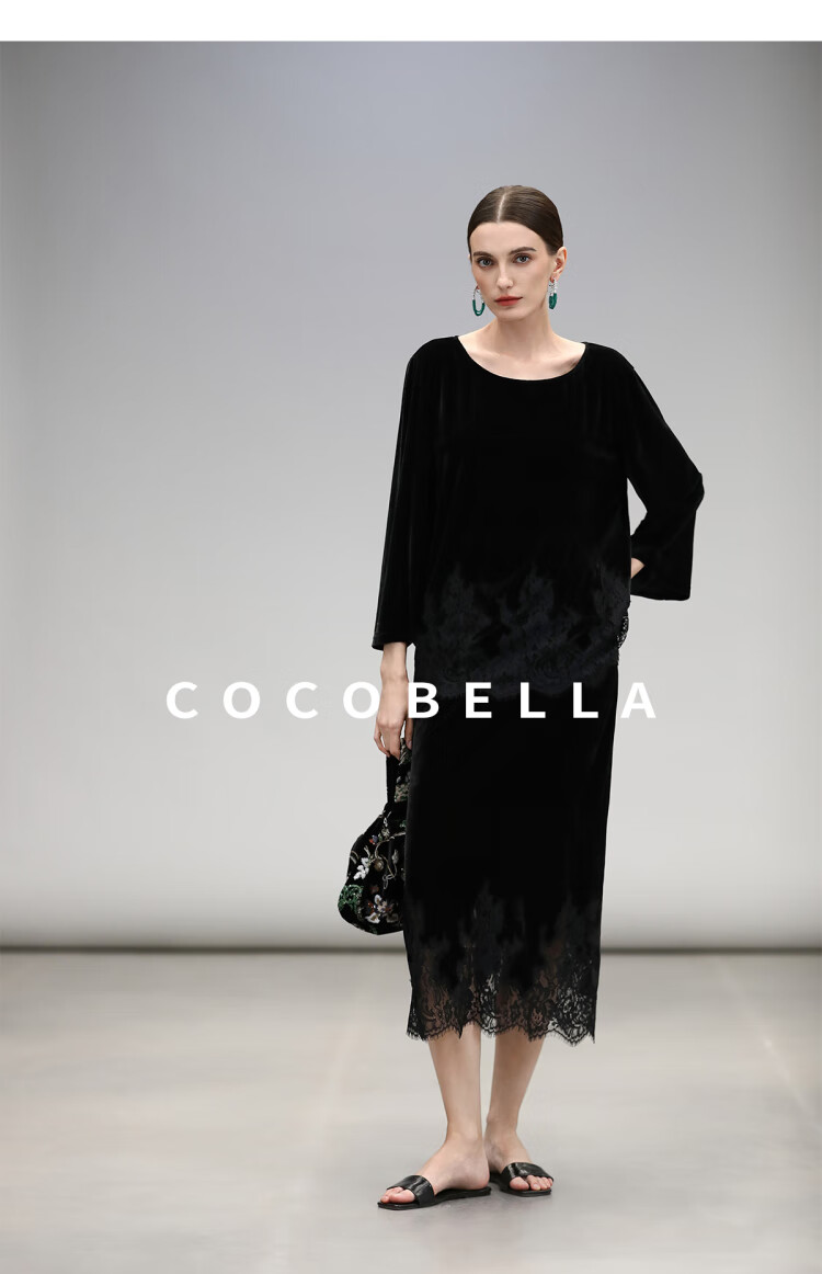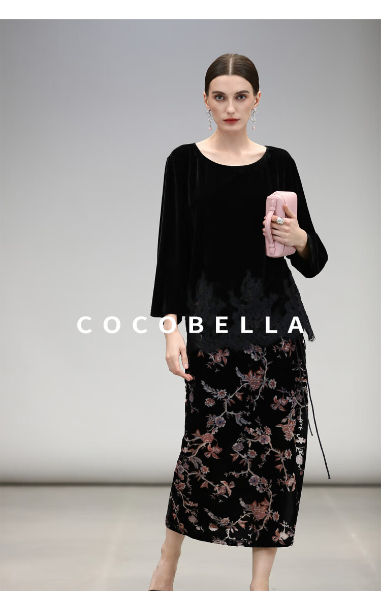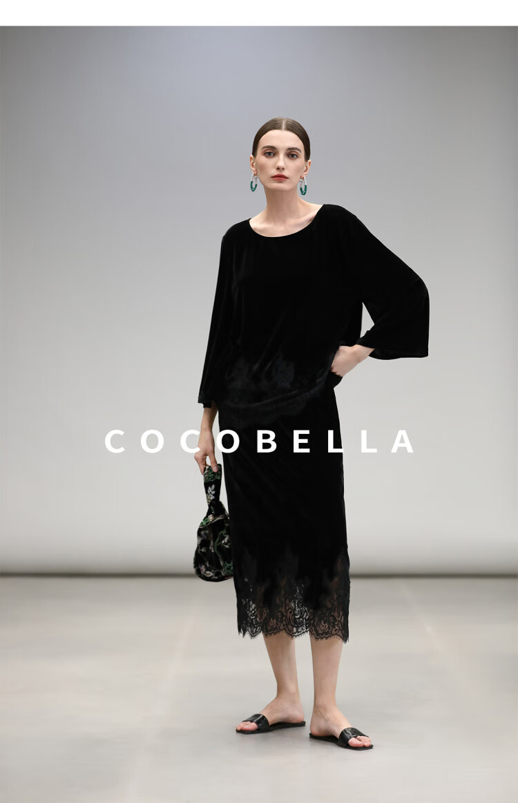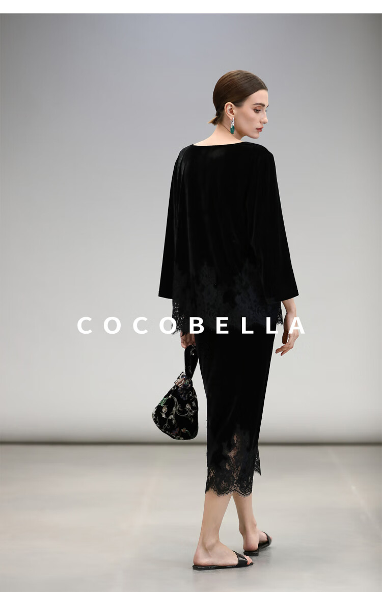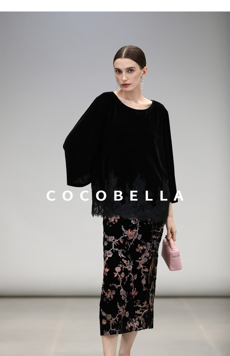 COCOBELLA静奢风丝绒上衣女不规则蕾丝拼接优雅通勤T恤TS3038