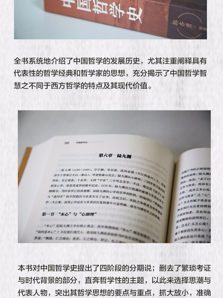本书中国哲学史提出了四阶段的分期说,删去了繁琐考证与时代背景的部分,直奔哲学性的主题,以此来选择思潮与代表人物,突出其哲学思想的要点与重点,抓大放小,准确把握有关范畴与命题,客观地评述各家各派的贡献与局限。
