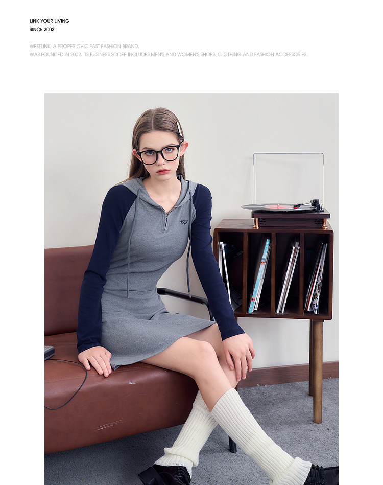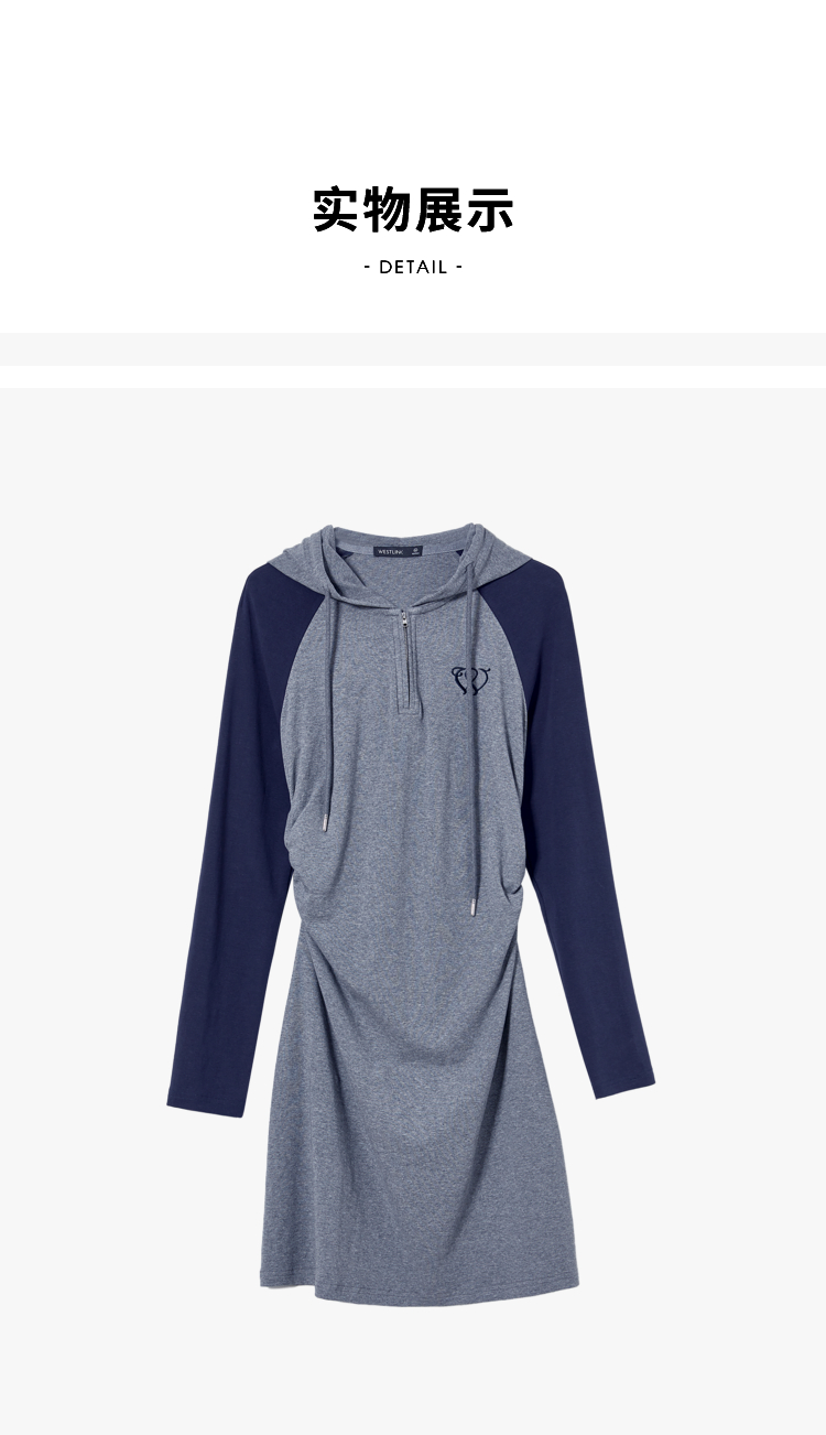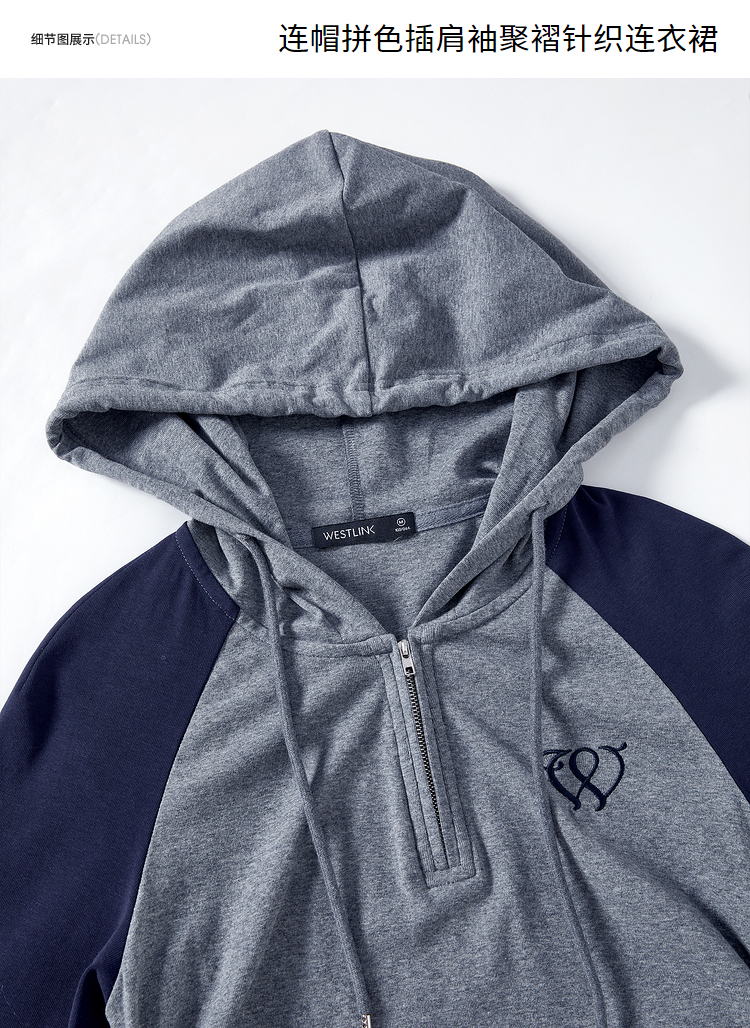 西遇连帽插肩撞色女新款修身显瘦灰色长袖针织连衣裙D1838163