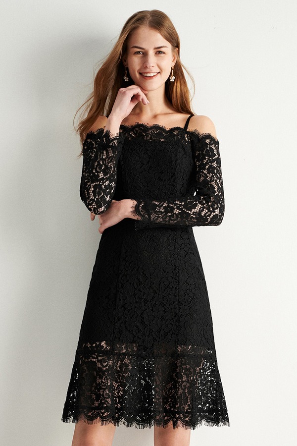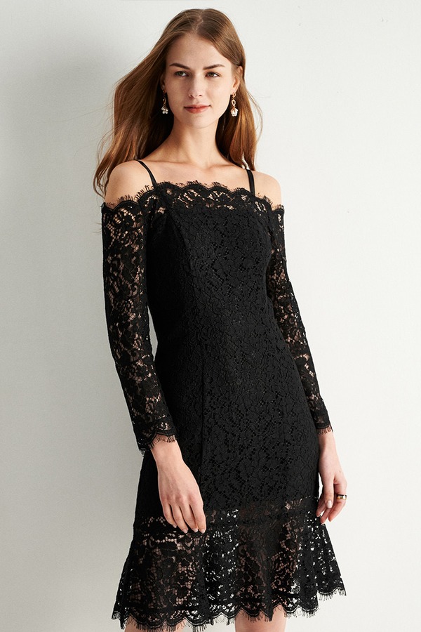 Eifini伊芙丽 优雅黑蕾丝吊带一字肩连衣裙 9731