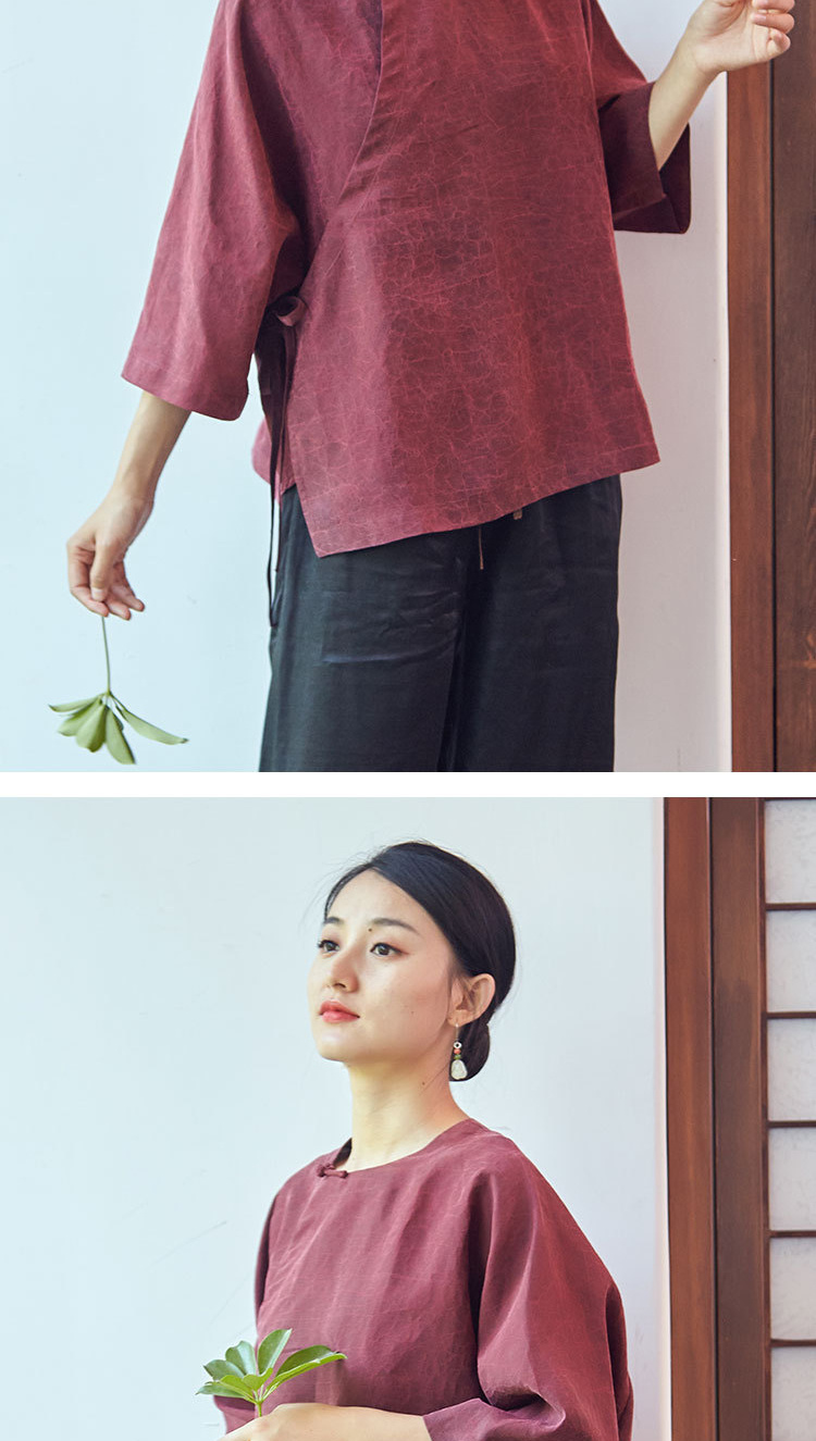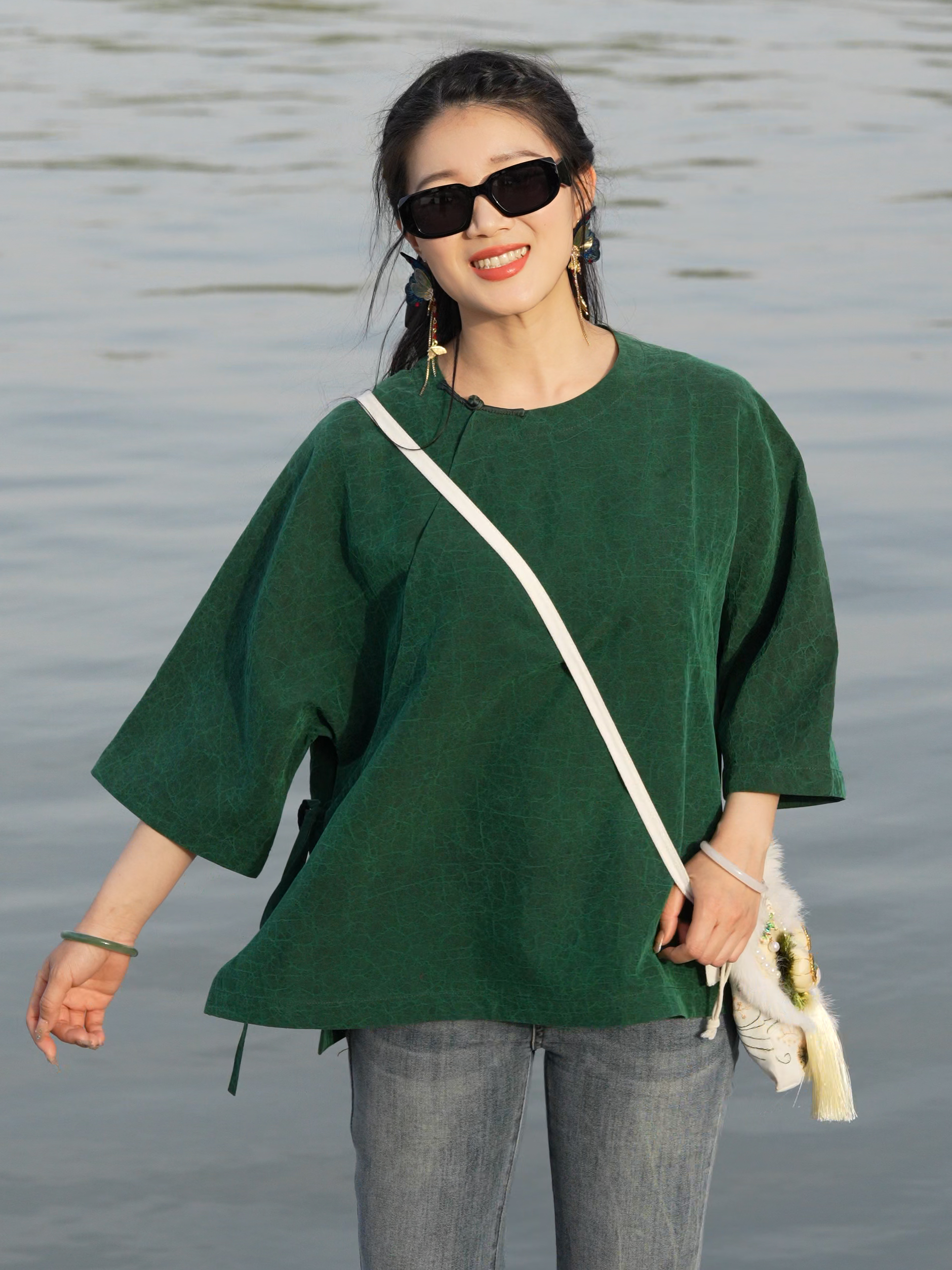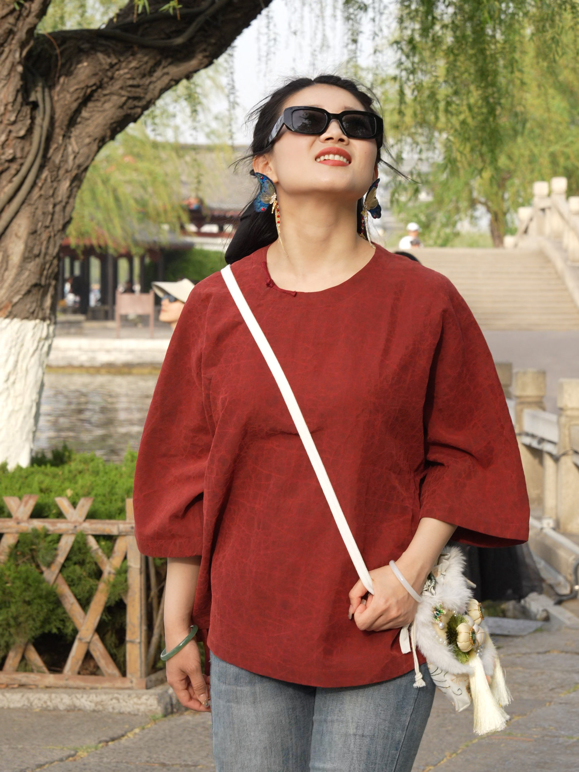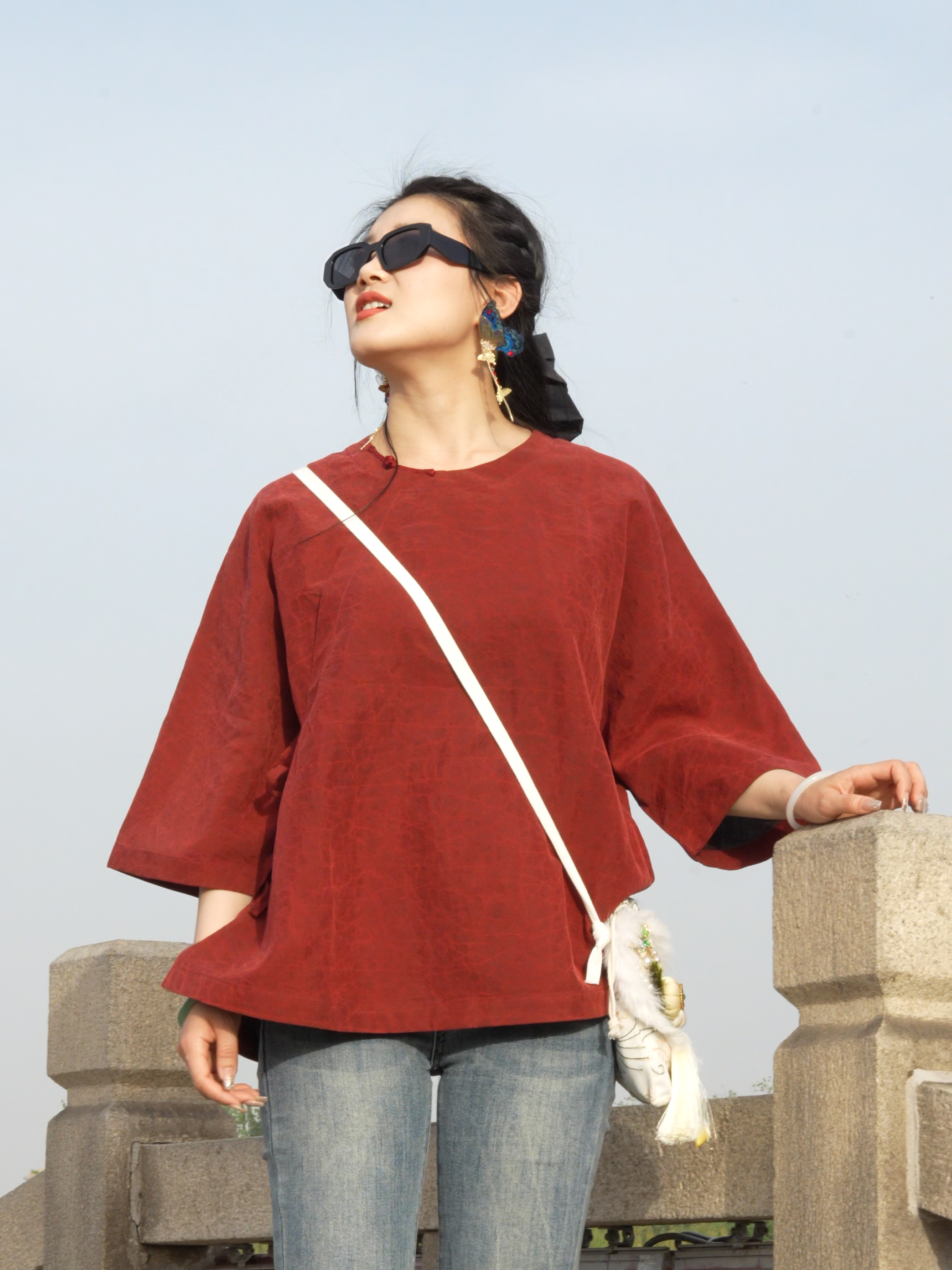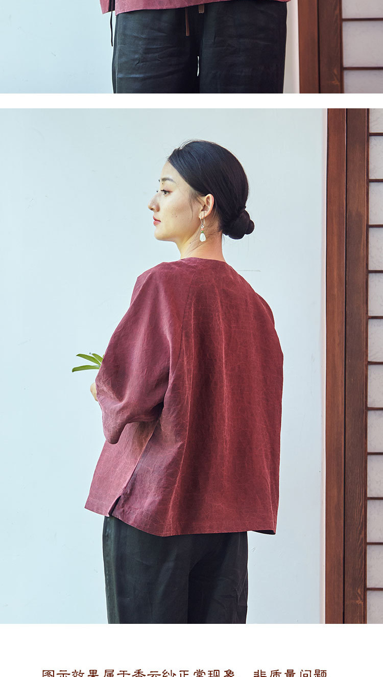 春夏新中式短款斜襟系带龟裂纹香云纱小衫U20326捌 。