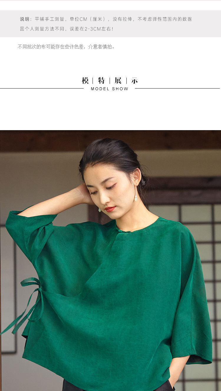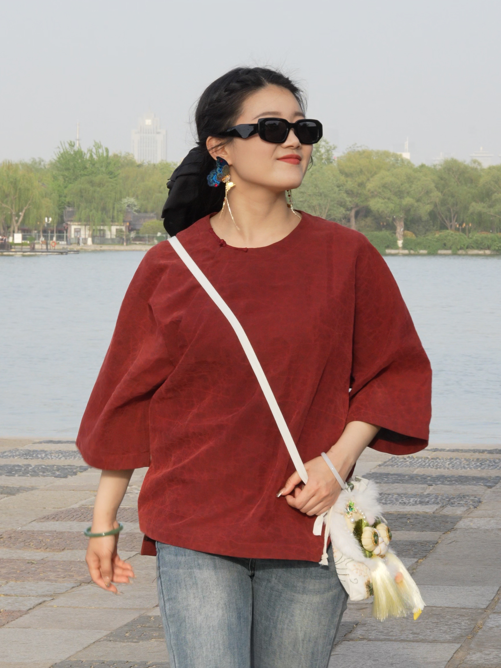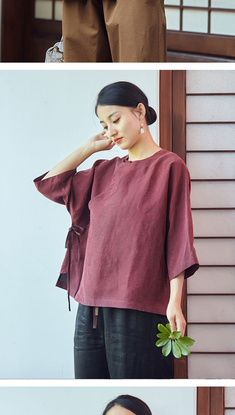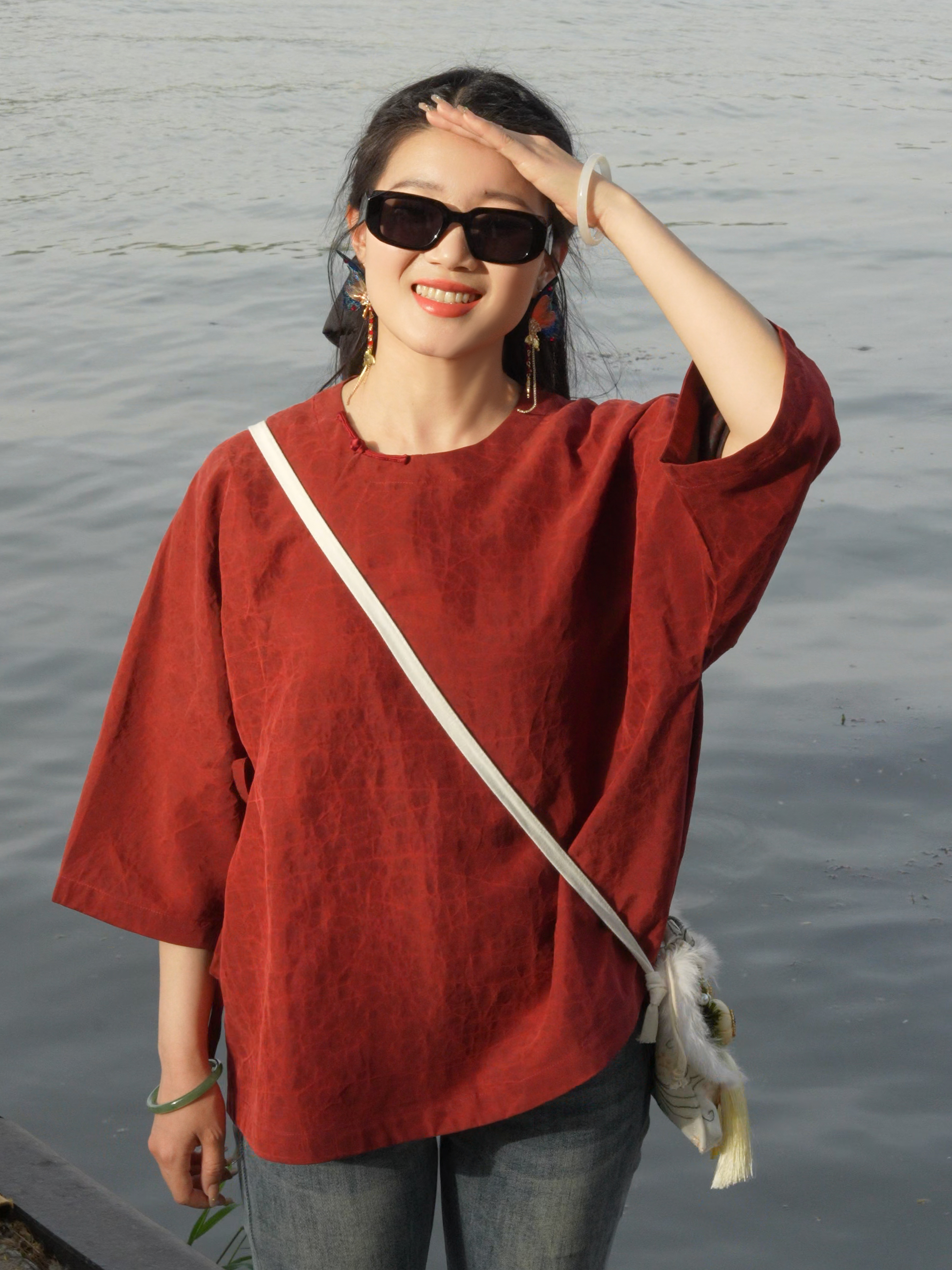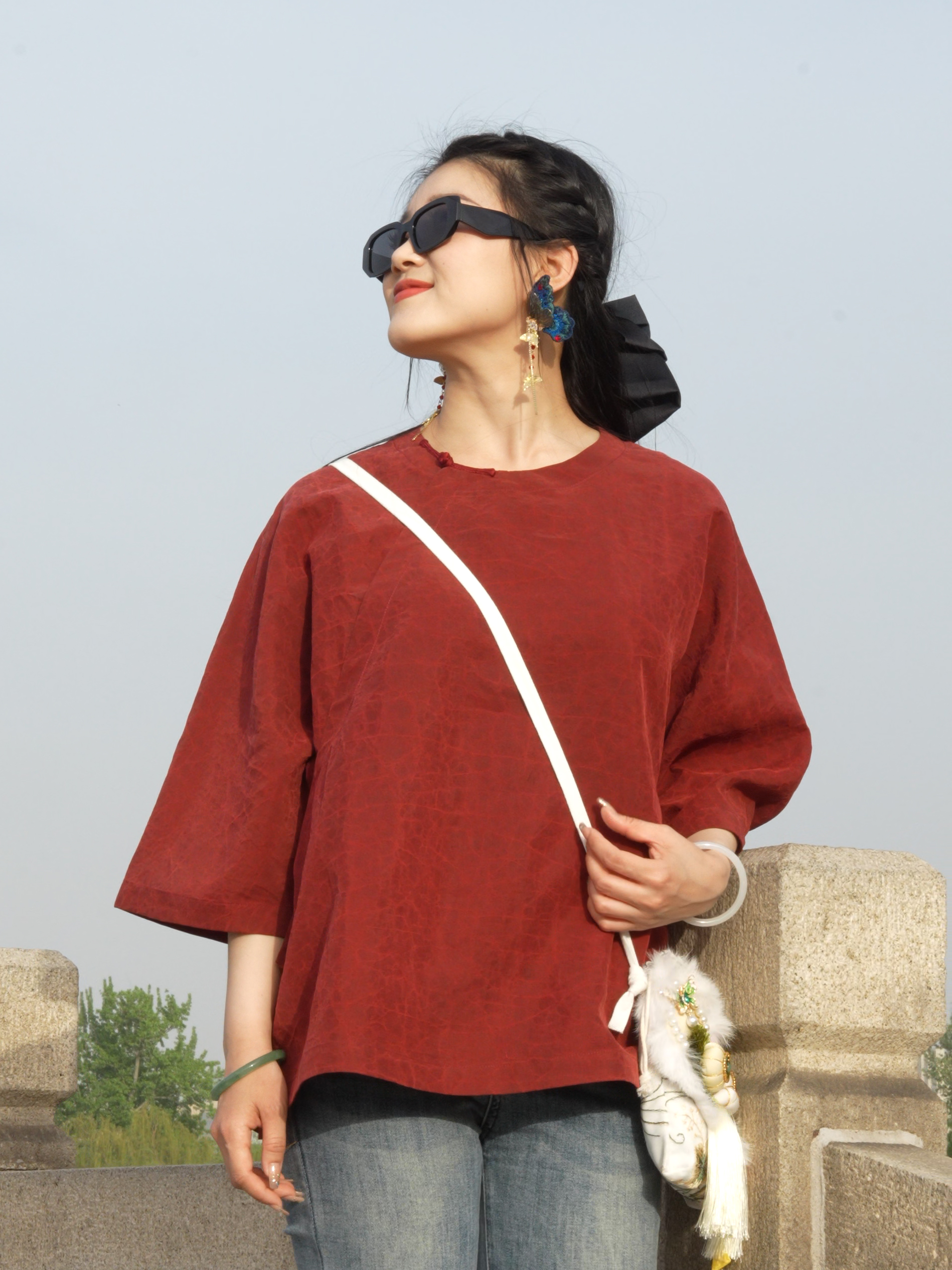 春夏新中式短款斜襟系带龟裂纹香云纱小衫U20326捌 。