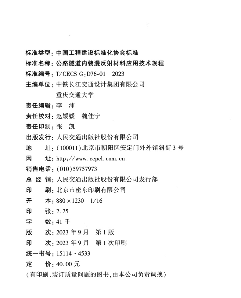 书名:公路隧道内装漫反射材料应用技术规程(T/CECS G:D76-01—2023)