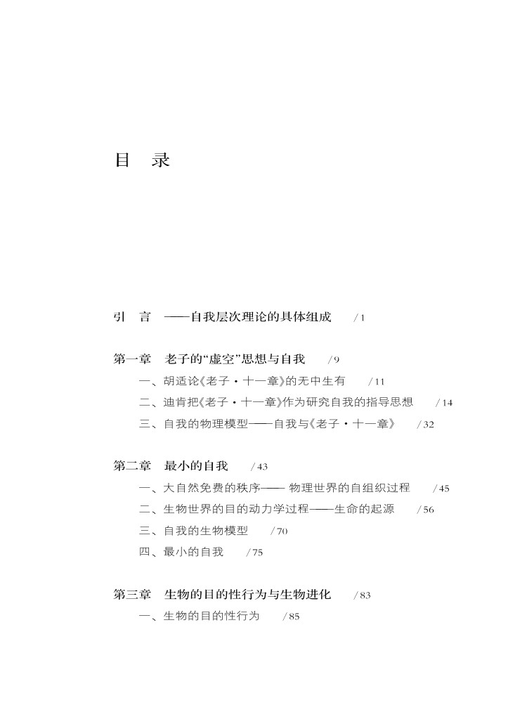 自我到底是怎样从无到有来到这个世界的? 本书从自我层次理论出发,详尽探讨了受老子《道德经》启发所构想的自我观,自我如何从虚空般的无中生有,涌现而出。内容涵盖老子的“虚空”思想,最小的自我,生物的目的性行为与生物进化、身体自我、自我的进化与自我的个体发展、心理自我、自我涌现的逻辑等方面。本书所探讨的自我层次理论实际上代表了近30年来生物学家和心理学家对自我问题的科学探索和贡献,也代表了中国文化对心理学研究的重要贡献。