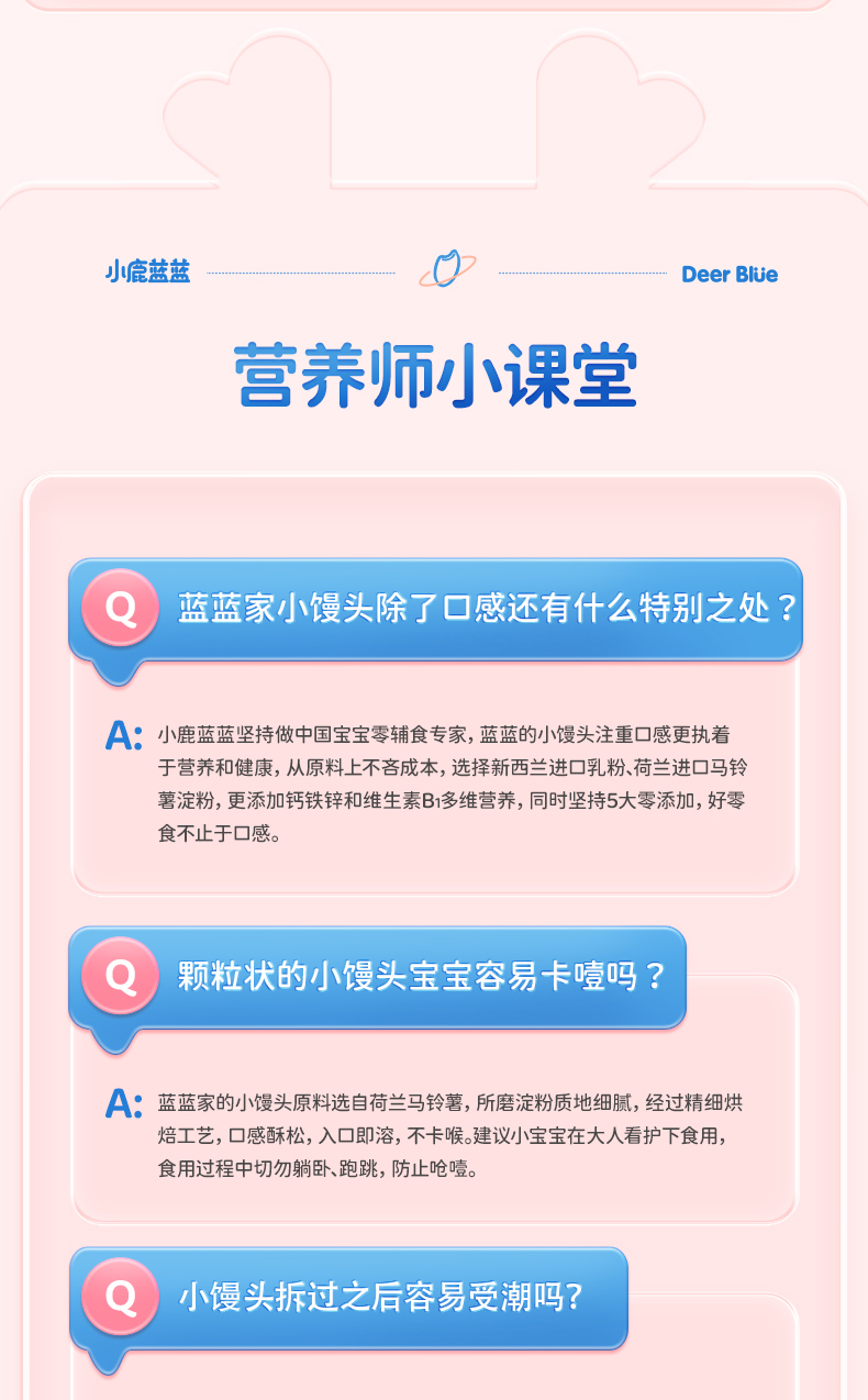 小鹿蓝蓝始终致力于为主人提供更优质、高性价比的产品、服务和体验,共同打造婴童零食生态圈,提升母婴行业的国货自信,守护和陪伴新一代儿童健康、快乐地成长。