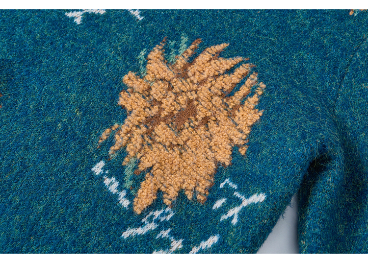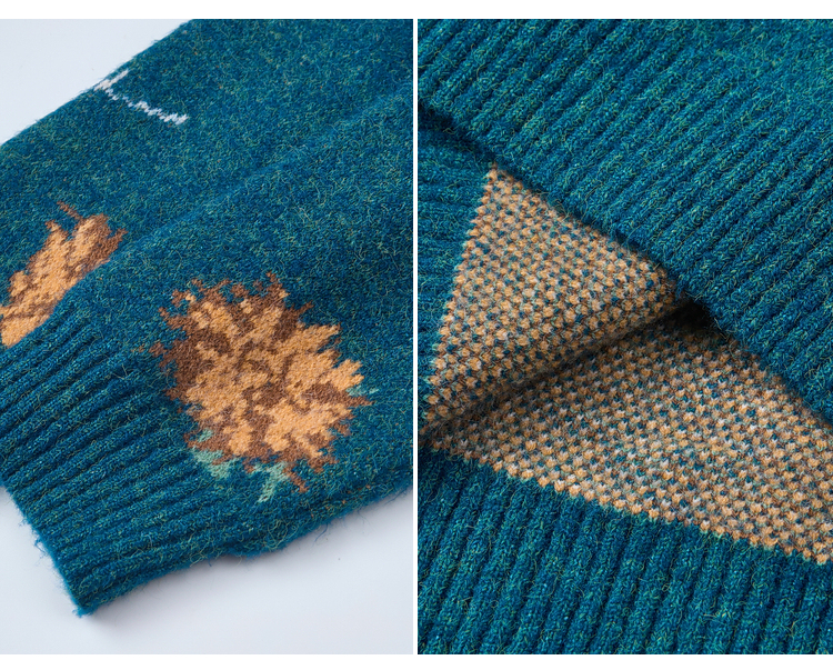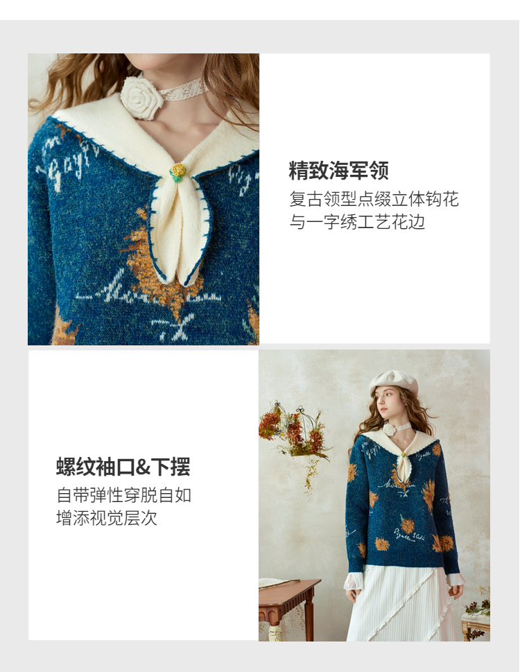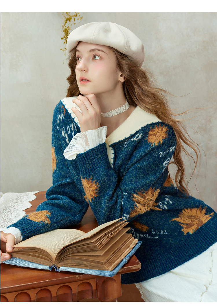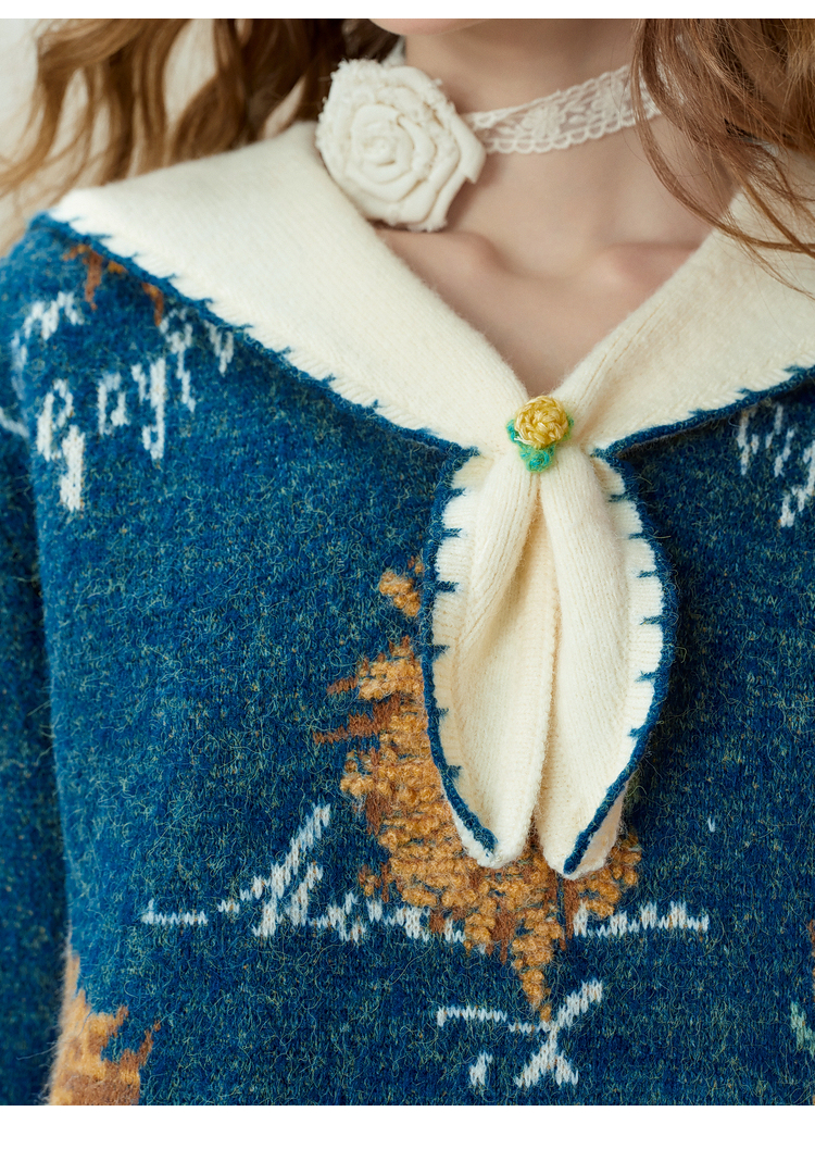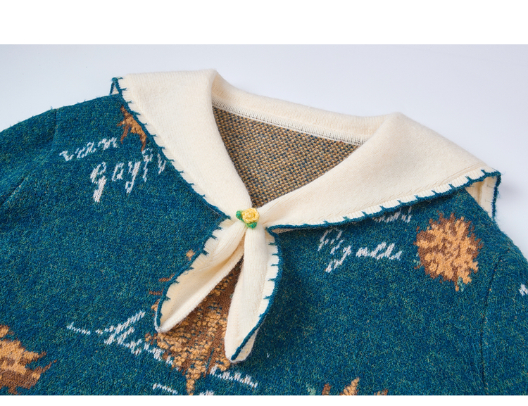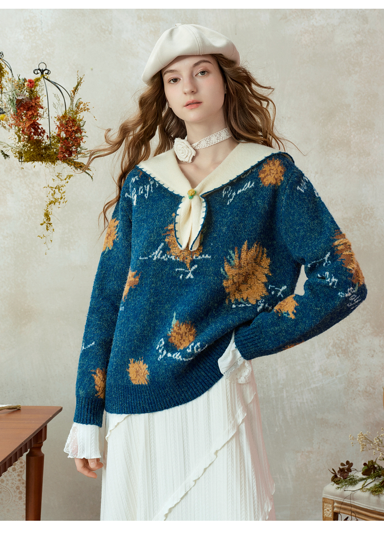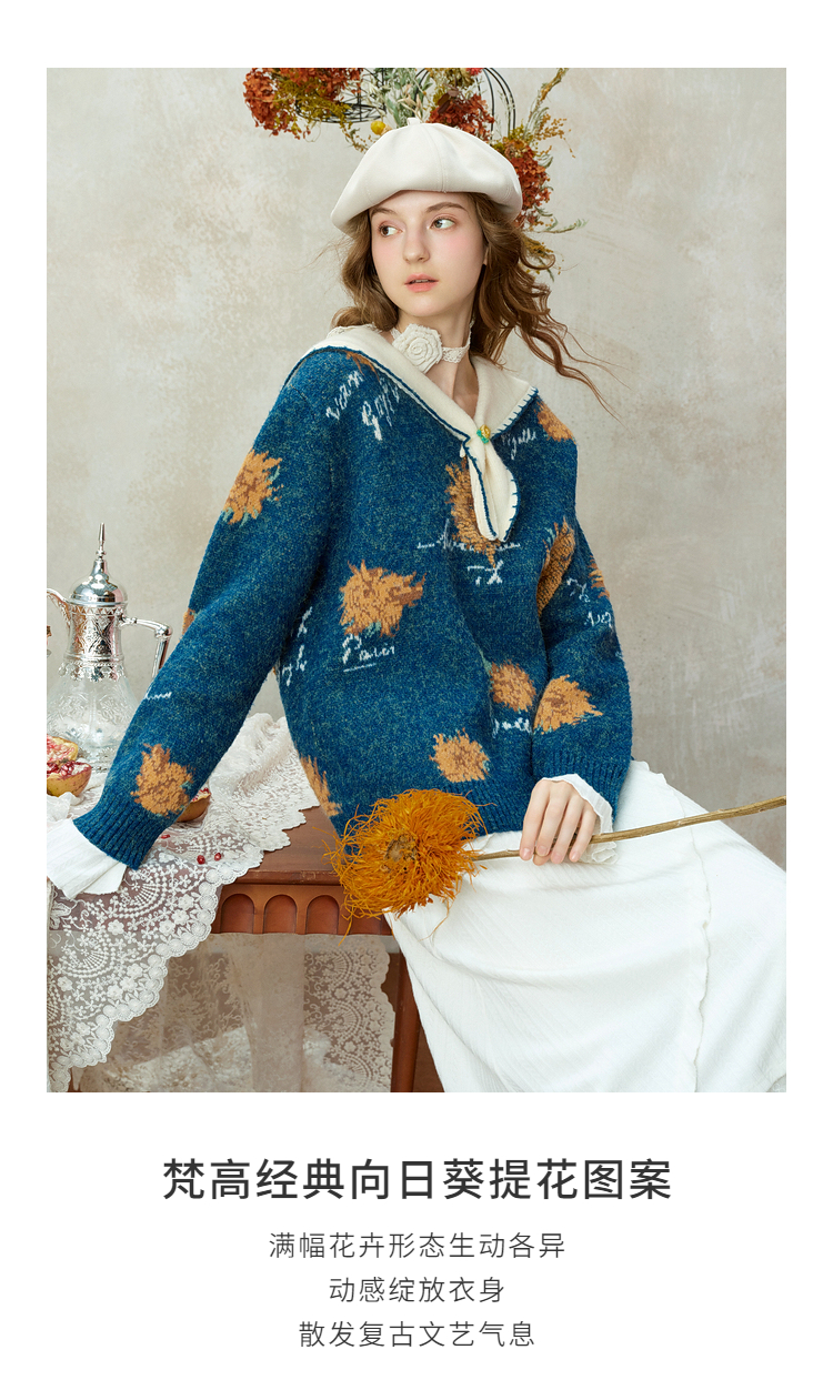 两三事梵高文艺葵与乐章2025冬季新款立体手钩花拼色海军领毛衣女