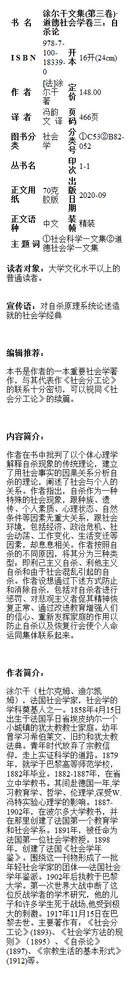 涂尔干文集(第三卷)·道德社会学卷三:自杀论 [法]涂尔干 著 冯韵文 译 商务印书馆