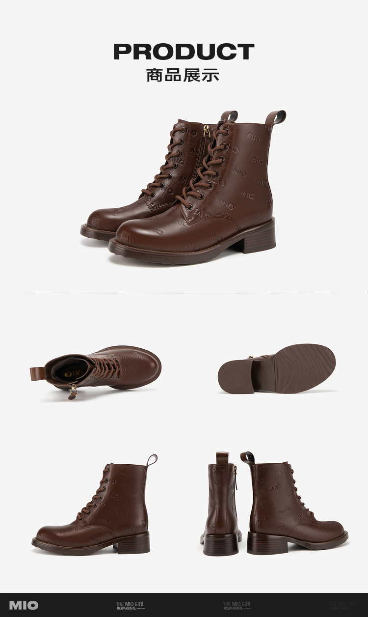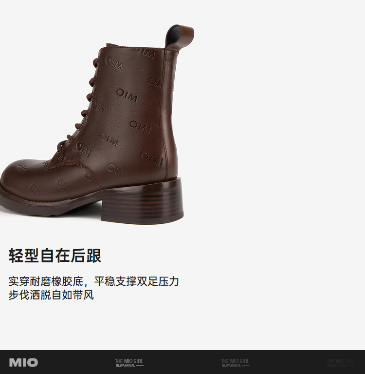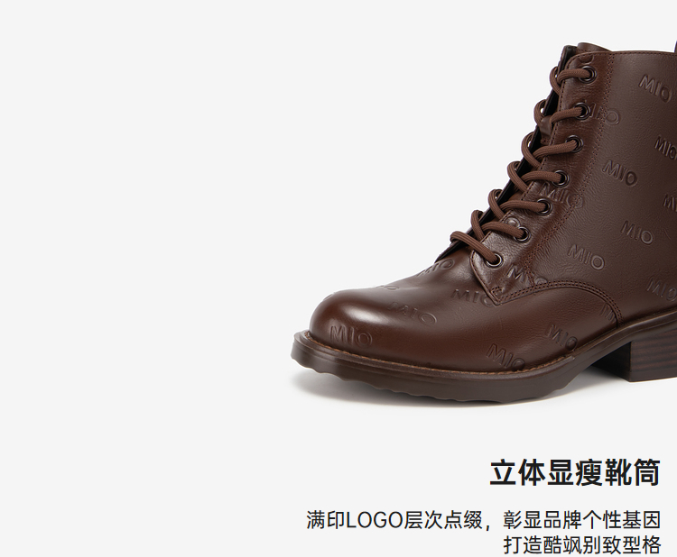 MIO米奥冬季靴子圆头方跟马丁靴中跟短筒牛皮革靴子女M235603805