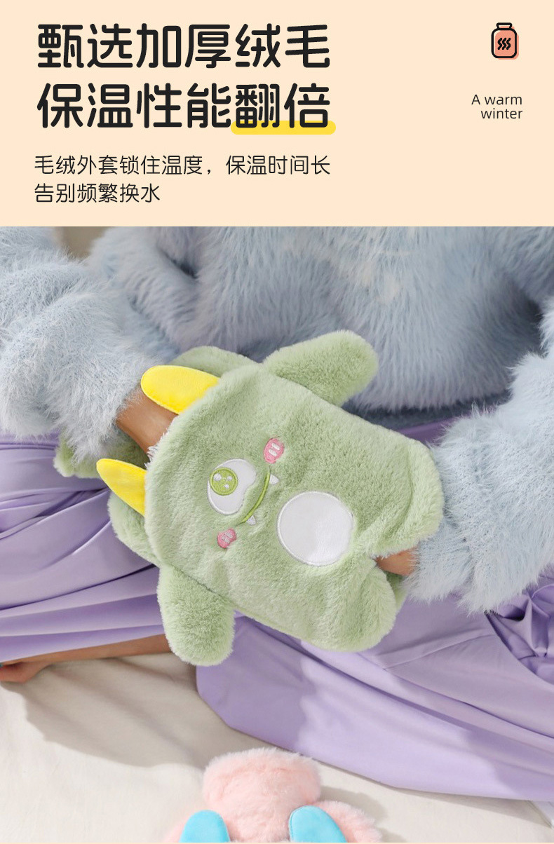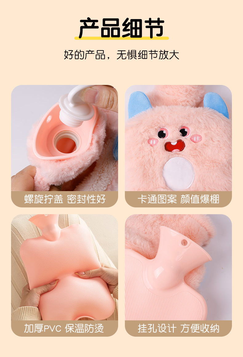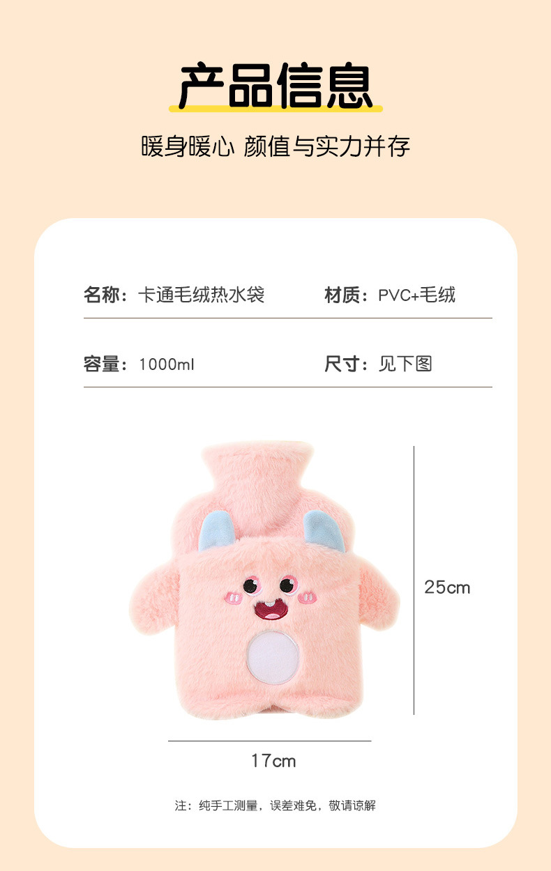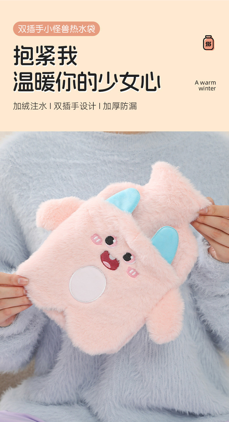 【冬天必备!PVC注水热水袋】毛绒包覆,暖手无忧;流连卡通清新色彩,三点式双插手,怎么换姿势都不怕温度丧失;加厚保温难逃冬日魔爪,经期腹痛神器;轻巧便携,不占空间!