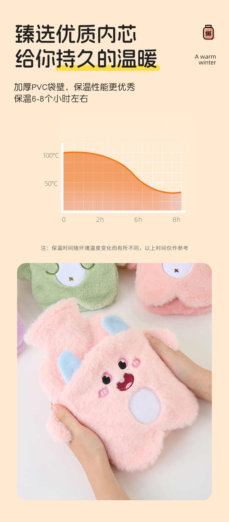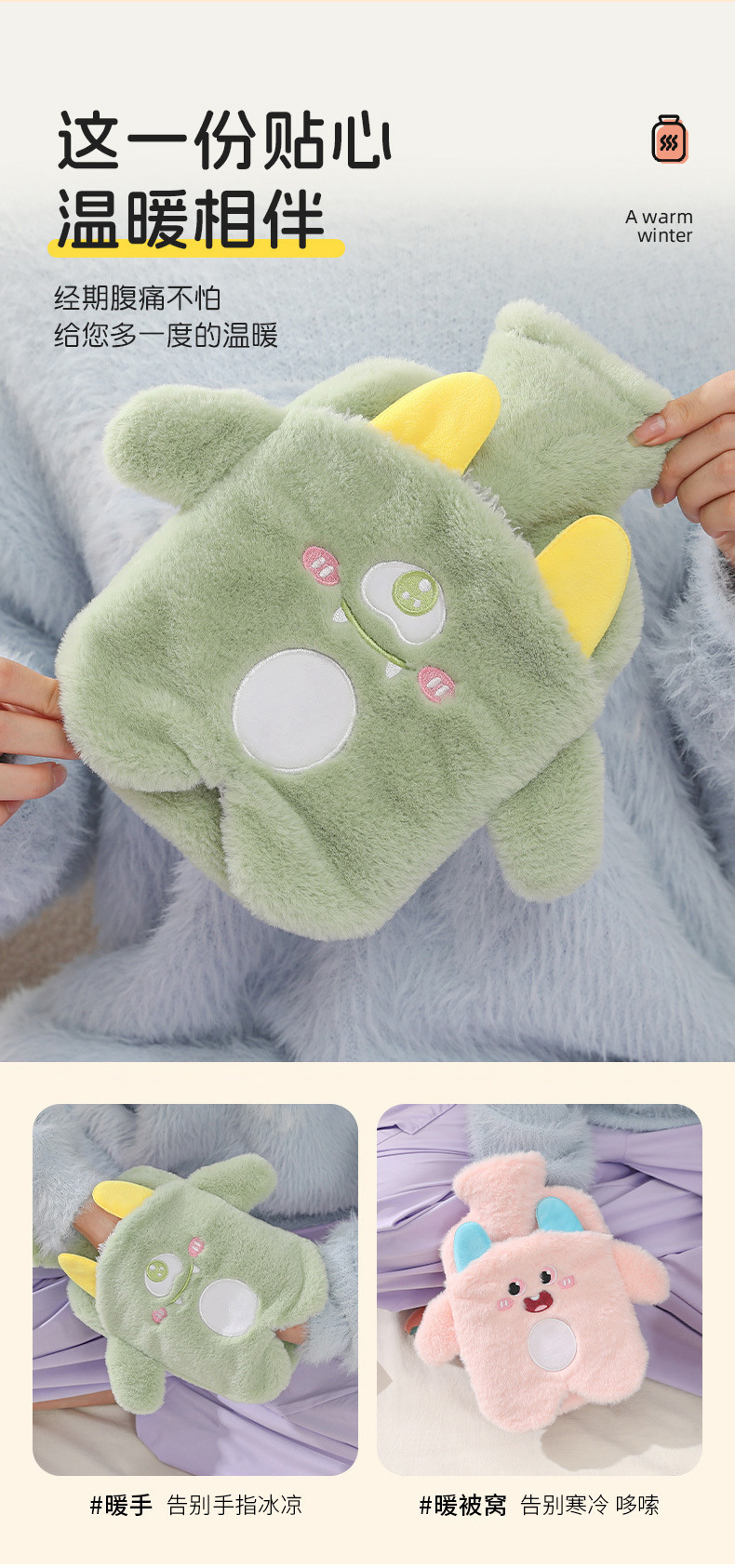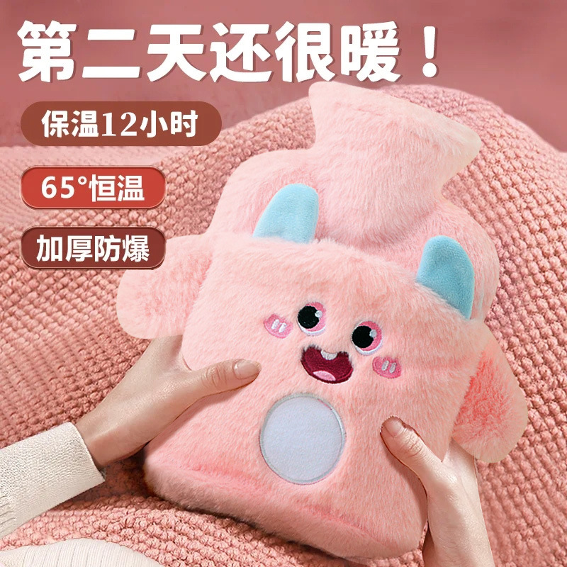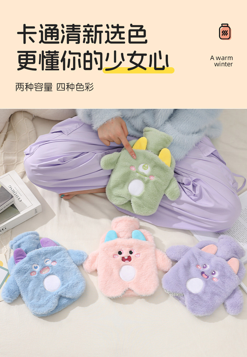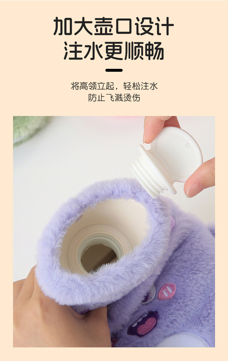 【冬天必备!PVC注水热水袋】毛绒包覆,暖手无忧;流连卡通清新色彩,三点式双插手,怎么换姿势都不怕温度丧失;加厚保温难逃冬日魔爪,经期腹痛神器;轻巧便携,不占空间!