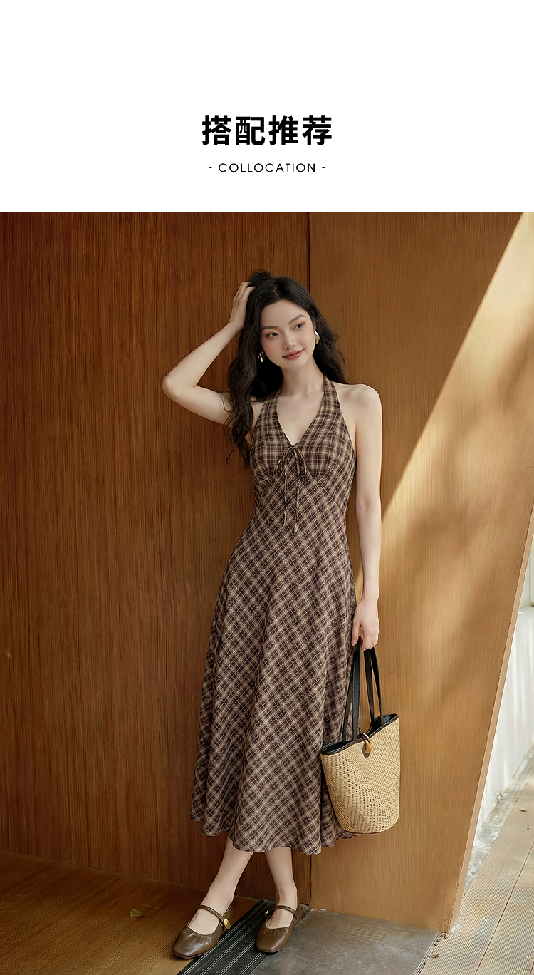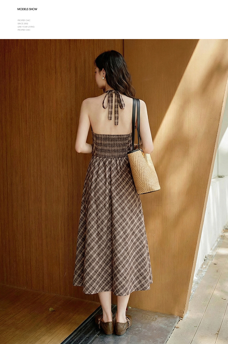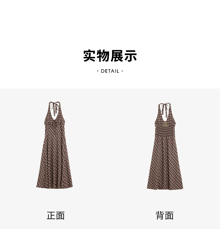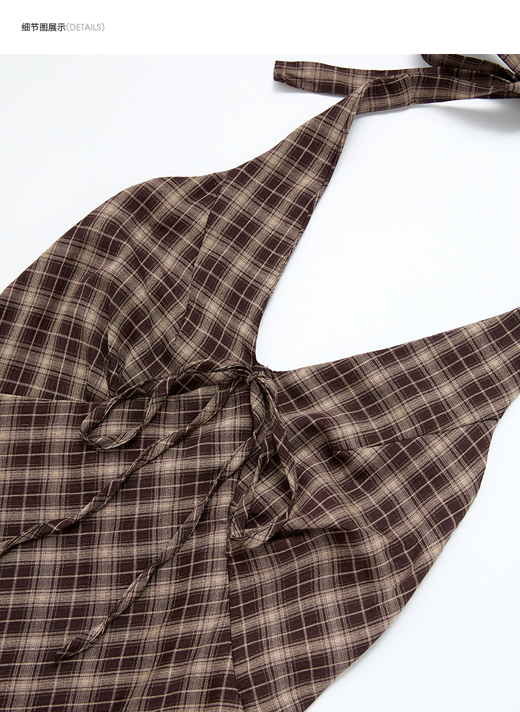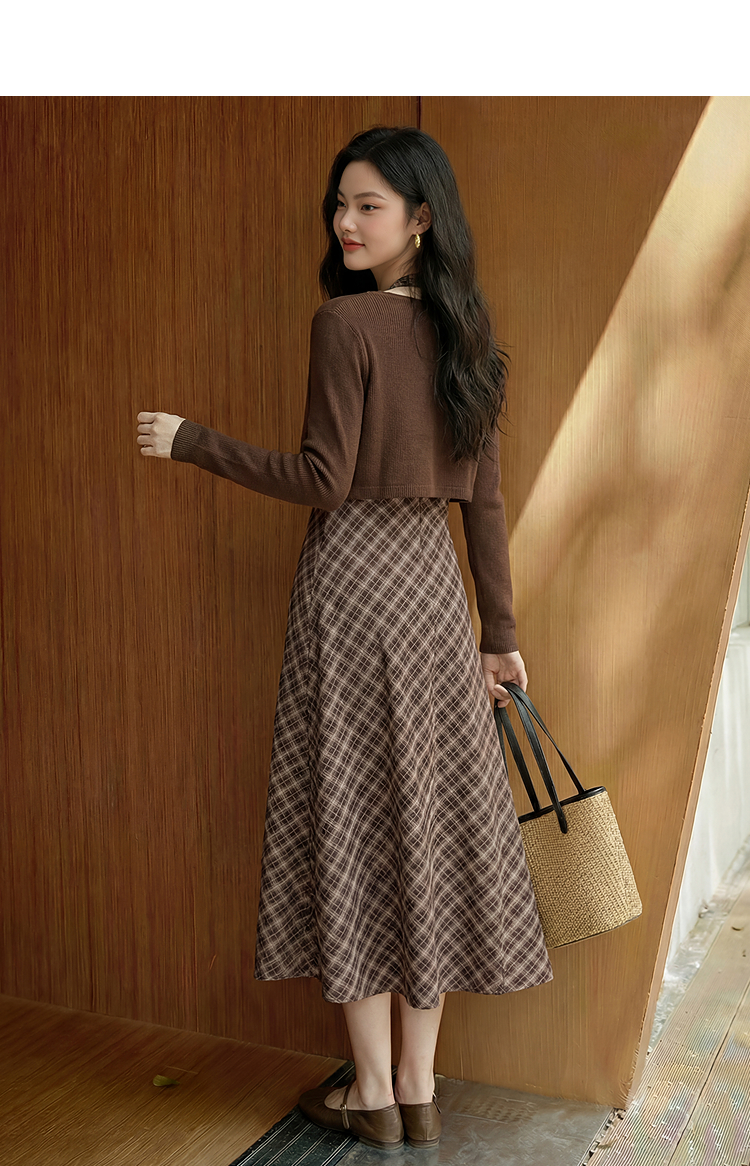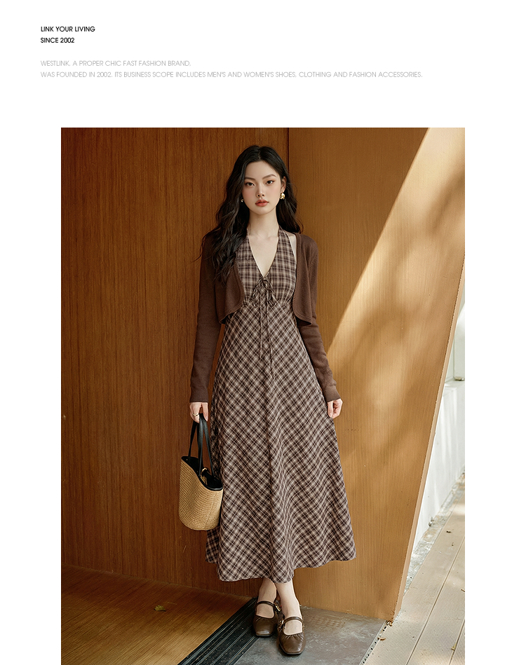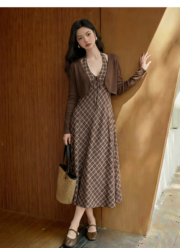 西遇咖色针织开衫套装女2026春季新款格纹挂脖吊带裙配开衫两件套E0060132/E0060133