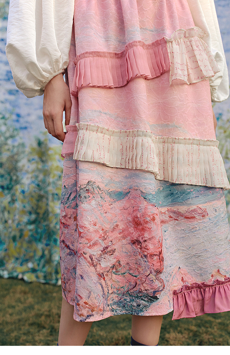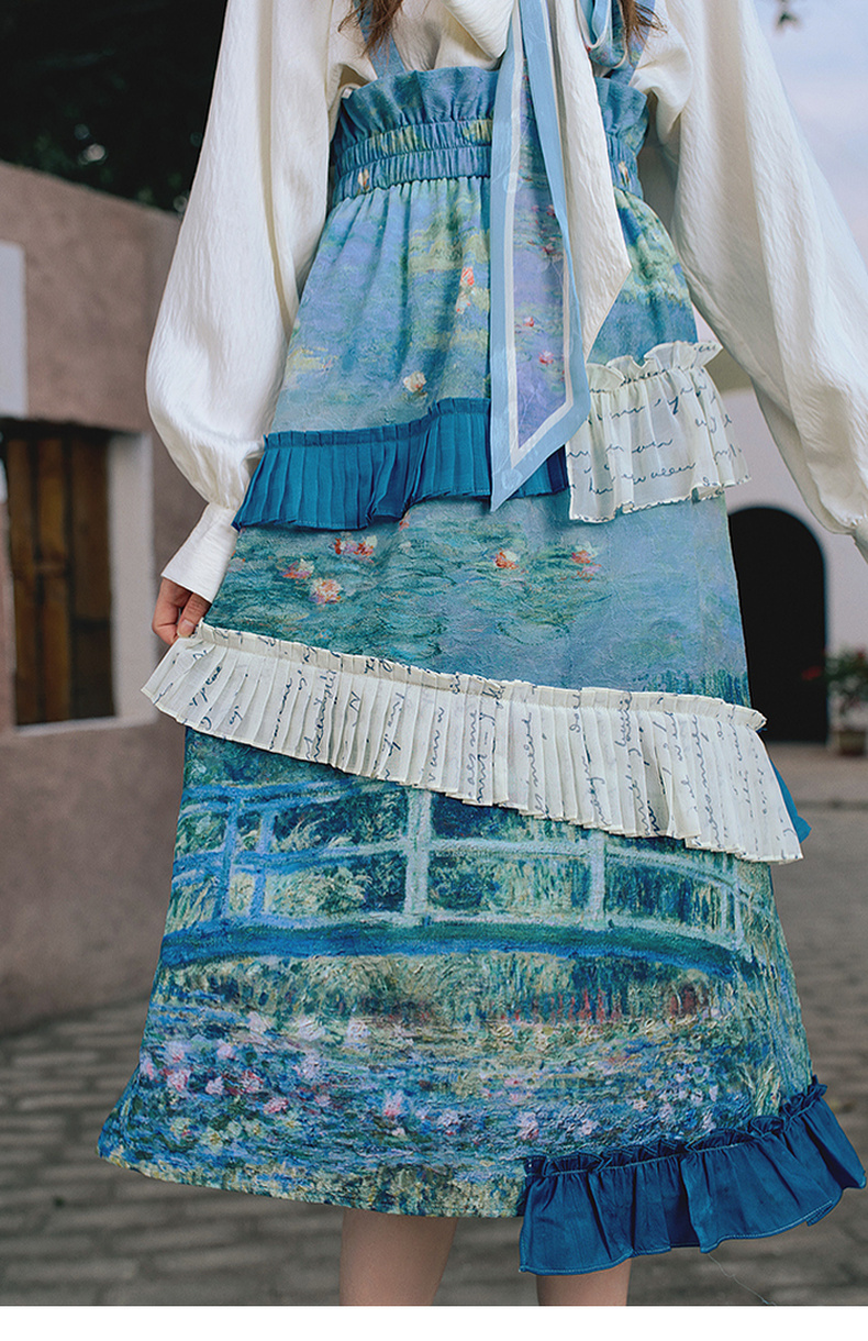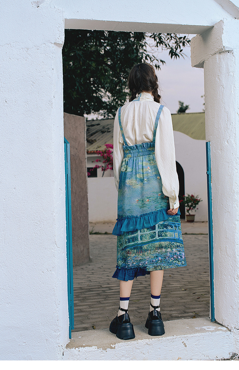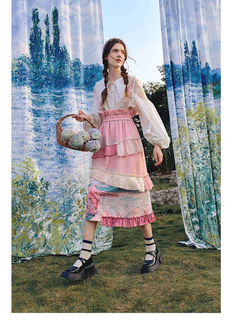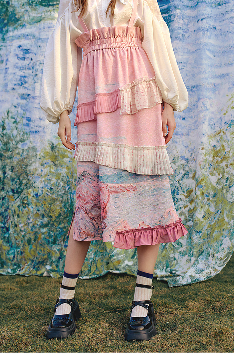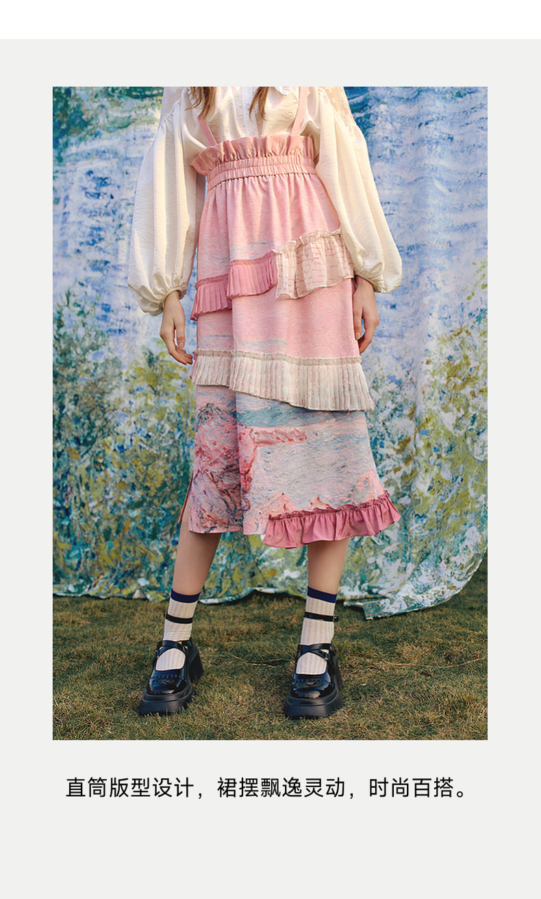 两三事幻世浮生复古油画印花荷叶边压褶拼接背带半身裙