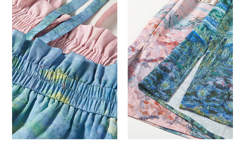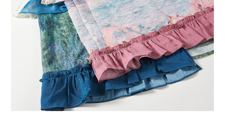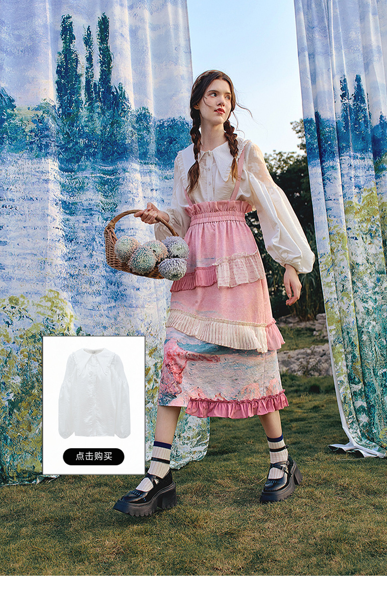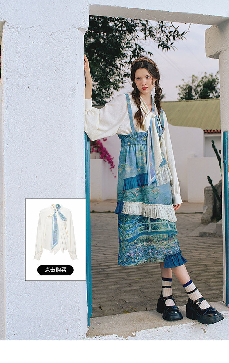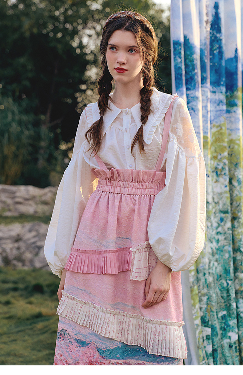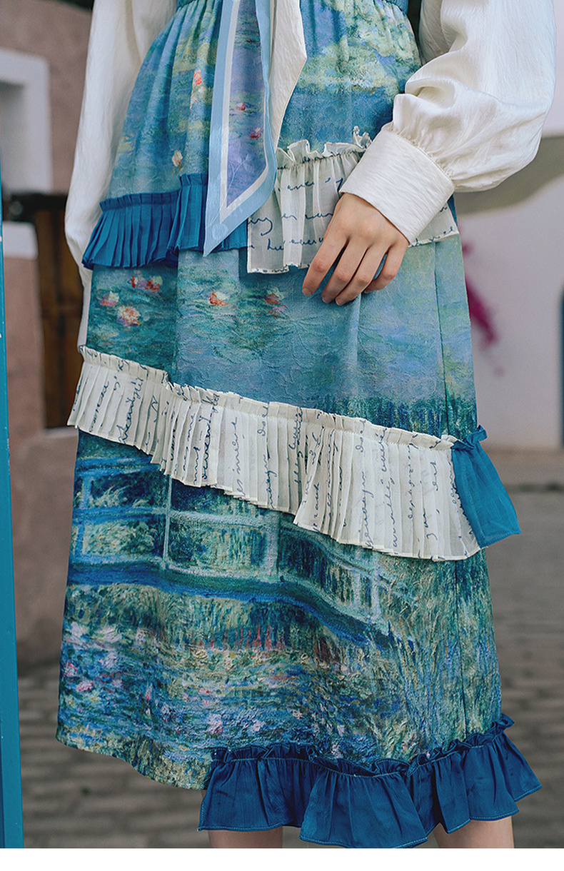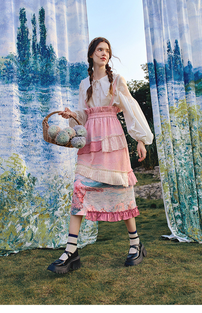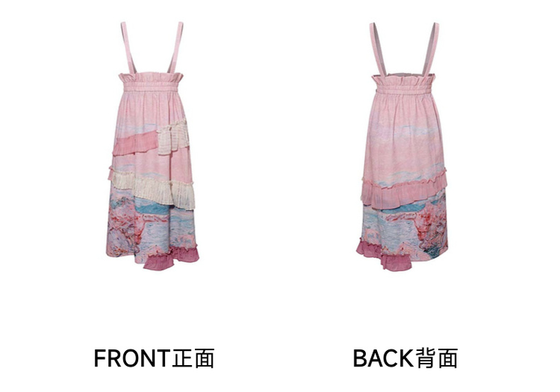 两三事幻世浮生复古油画印花荷叶边压褶拼接背带半身裙