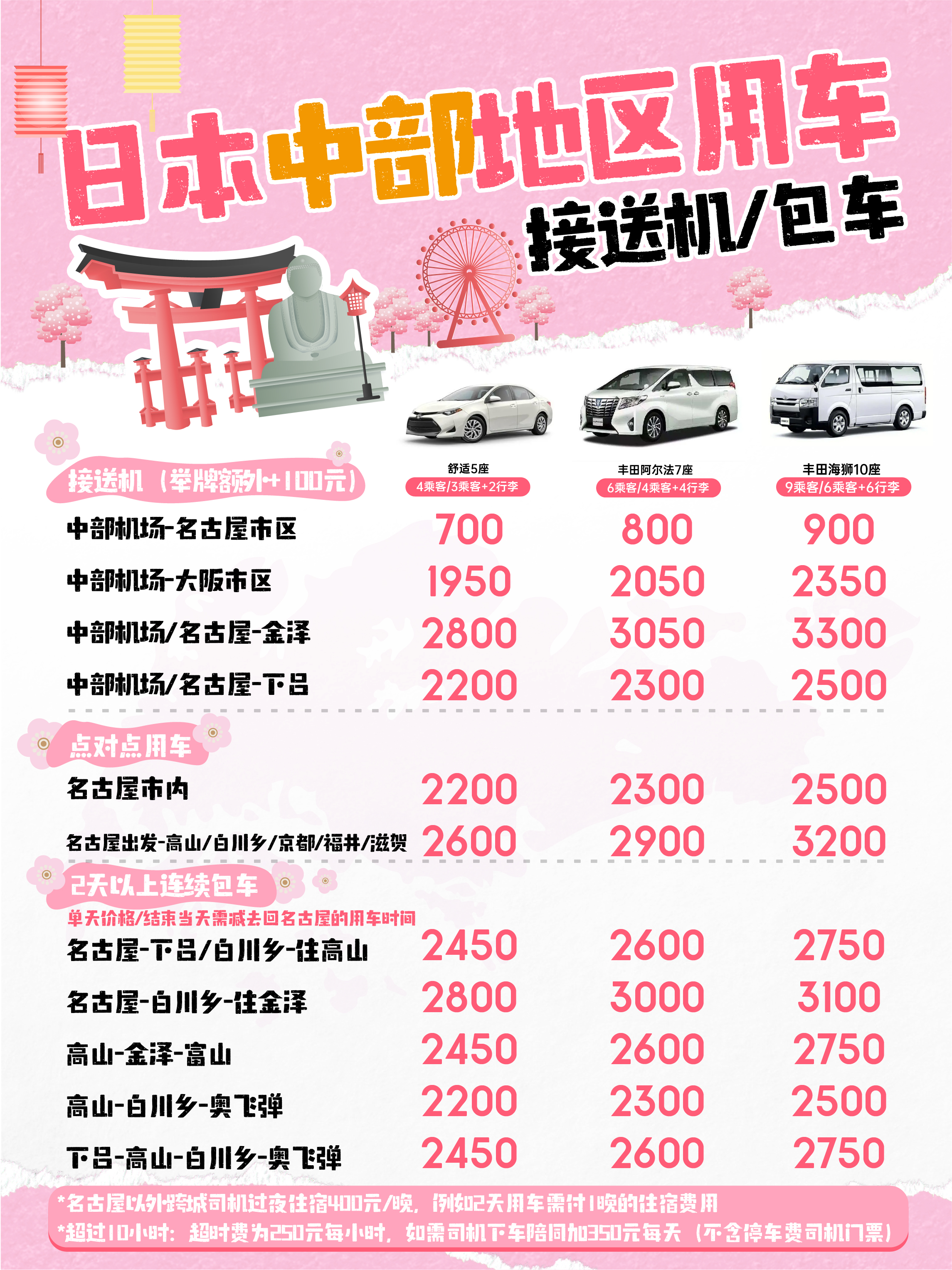 2、2天以上连续包车(单天价格/结束当天需减去回名古屋的用车时间)