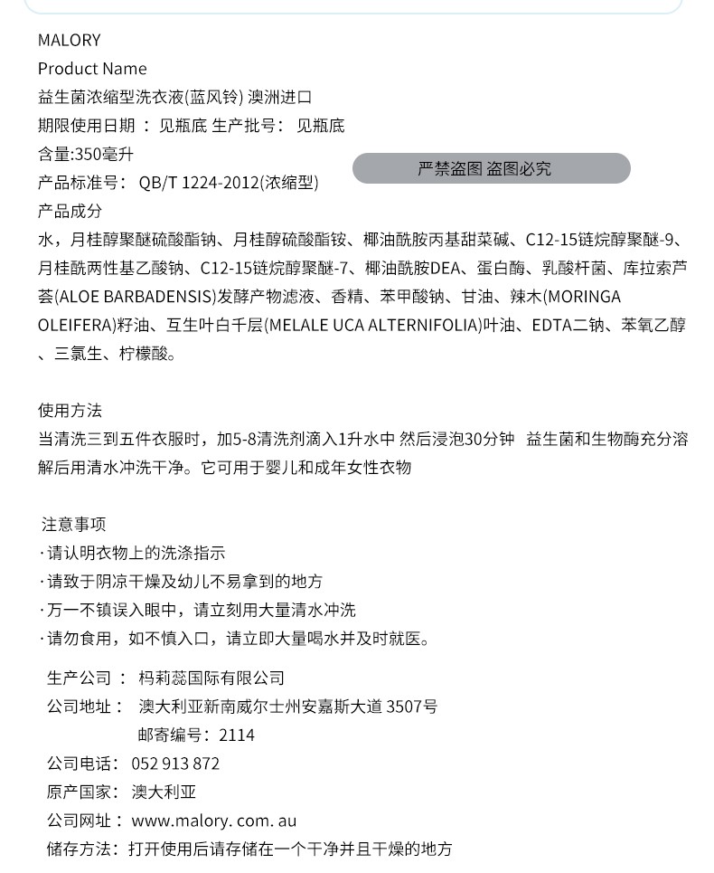 澳洲进口malory益生菌浓缩型内衣内裤清洗液孕妇女士专用抑菌