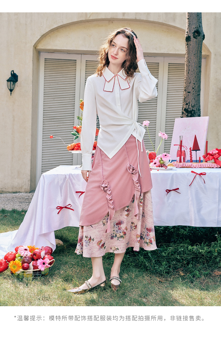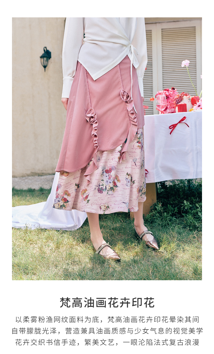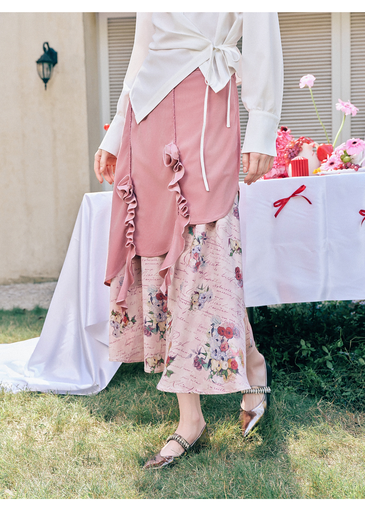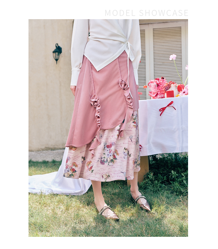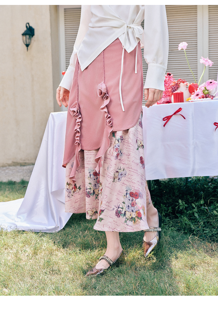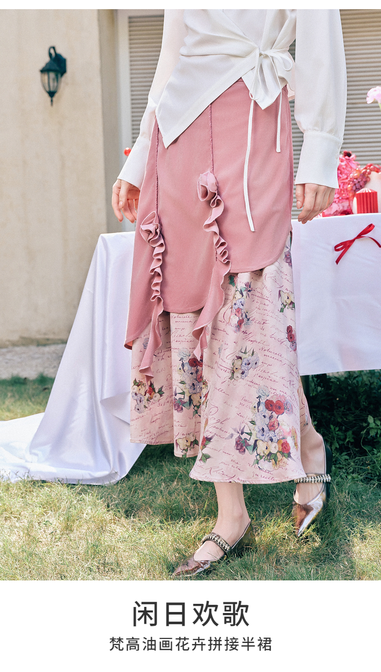 两三事 闲日欢歌 2026春季新款温柔风抽褶花边印花拼接a字半身裙