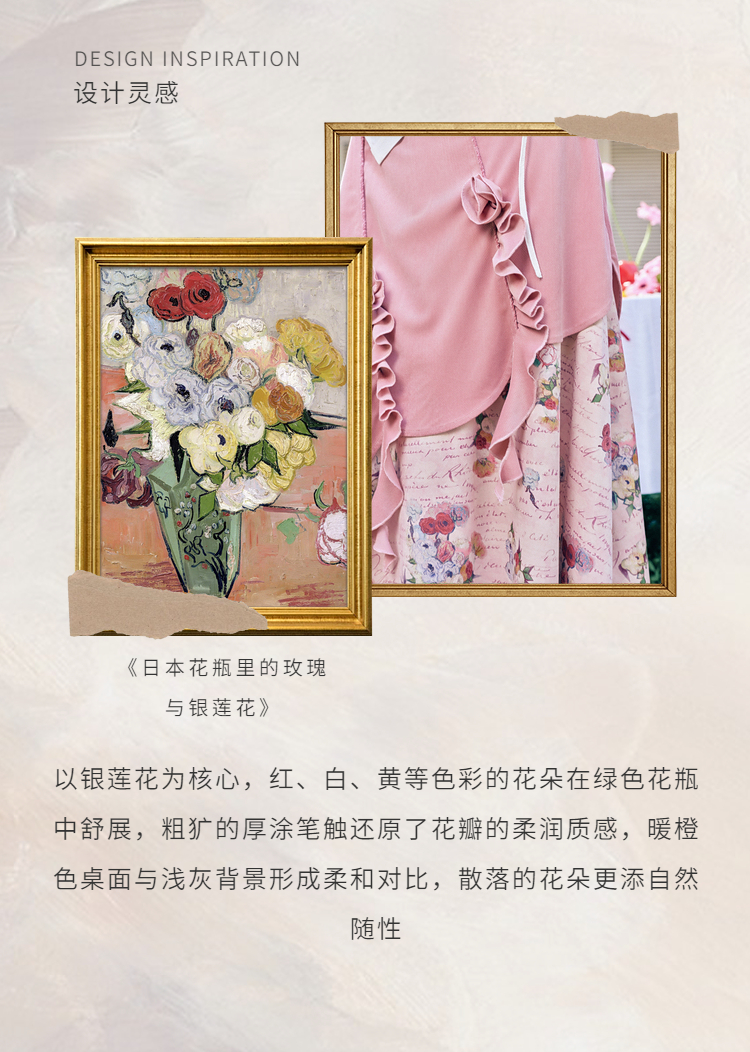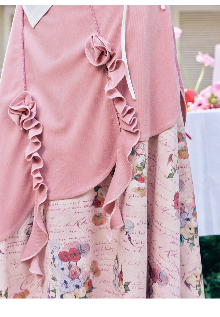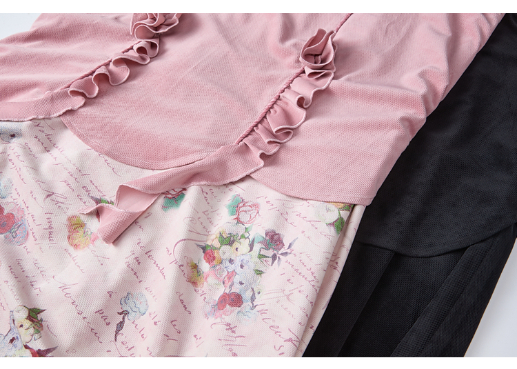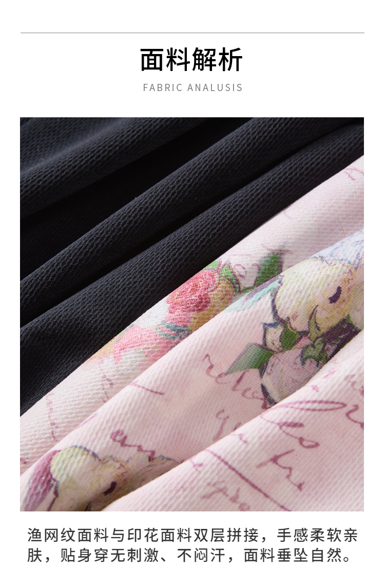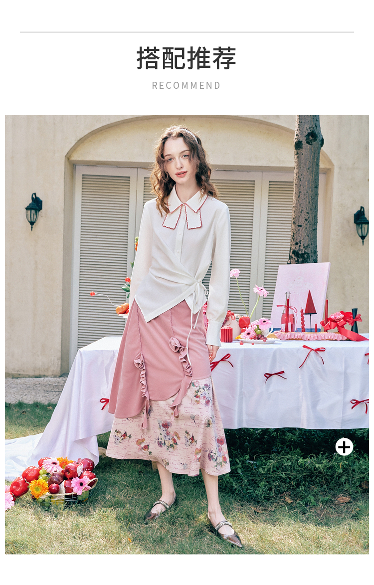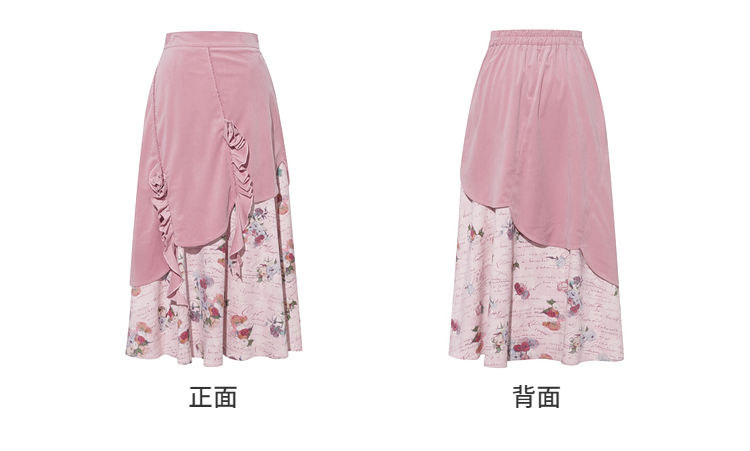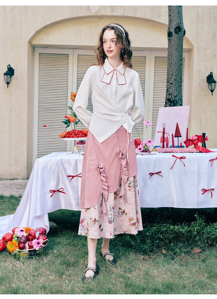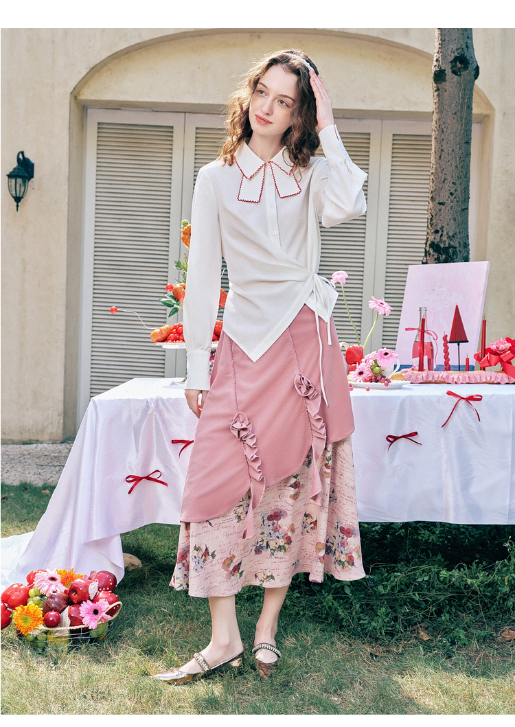 两三事 闲日欢歌 2026春季新款温柔风抽褶花边印花拼接a字半身裙