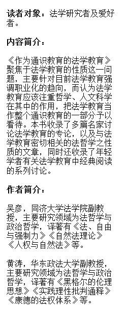 16 在法学教育中培养人性 / 玛莎·C. 努斯鲍姆33 哲学在法学教育中的功用与误用 / 玛莎·C. 努斯鲍姆56 执业律师所需的哲学 / 朗·L. 富勒66 富勒论法律教育 / 罗伯特·萨默斯主题论文二:何谓法哲学?87 哲学法理学的概念 / 迈克尔·欧克肖特120 法哲学是什么? / 约翰·菲尼斯笔谈:“经典阅读”在法学教育和法学研究中的意义137 经典阅读的限度及其可能性 / 丁 轶149 阅读经典与开放的理论生活——当下法学理论发展之反思 / 黄 涛156 经典的非经典问题 / 刘振宇163 法学教研的目的与经典阅读的意义 / 钱一栋182 法学研究应当面向“范式中的经典” / 陆宇峰187 法哲学著作的两种读法 / 沈宏彬196 法学教育何以需要阅读经典 / 周国兴201 法学教育与经典阅读刍议 / 杨立民208 亚里士多德理论和实践的区分对法学教育的影响 / 陈 辉214 经典阅读仍是重要之事 / 杨 建227 法学的实践品格与经典阅读 / 王凌皞233 经典自然法理论对法学研究与教育的意义——以作为德性法制的现代法治为主题展开 / 杨知文238 在变迁的时代读经典 / 朱明哲242 经典阅读对法学院教育的意义 / 姚 远247 实践哲学理论与法理学的研究——以亚里士多德模式为中心 / 叶会成255 法学经典的意义:一个历史视角 / 徐震宇261 经典阅读之于法学 / 王 博268 经典阅读:从知识学习到文明成果的传承 / 王海军272 文明论视域中的经典阅读——从蔡枢衡《中国法理自觉的发展》谈起 / 李燕涛