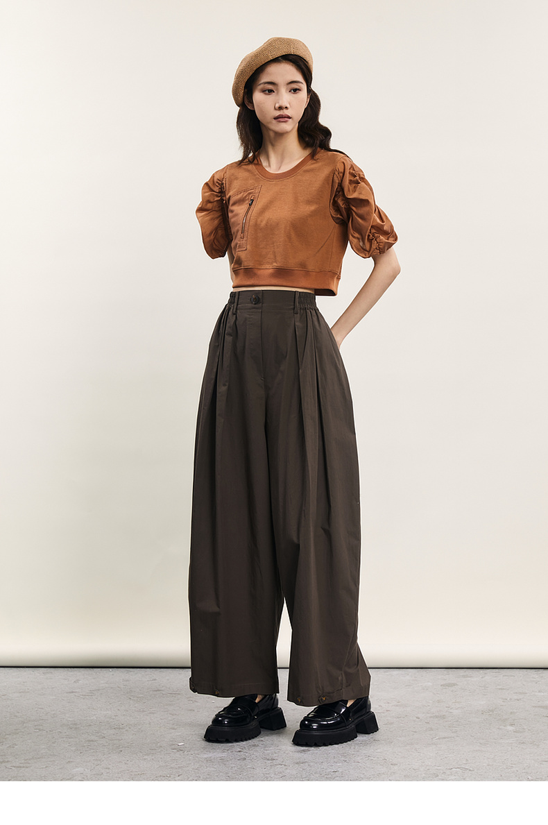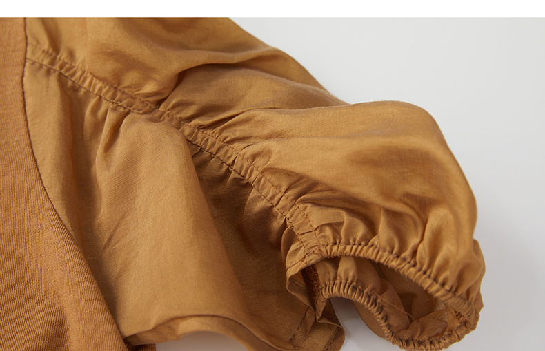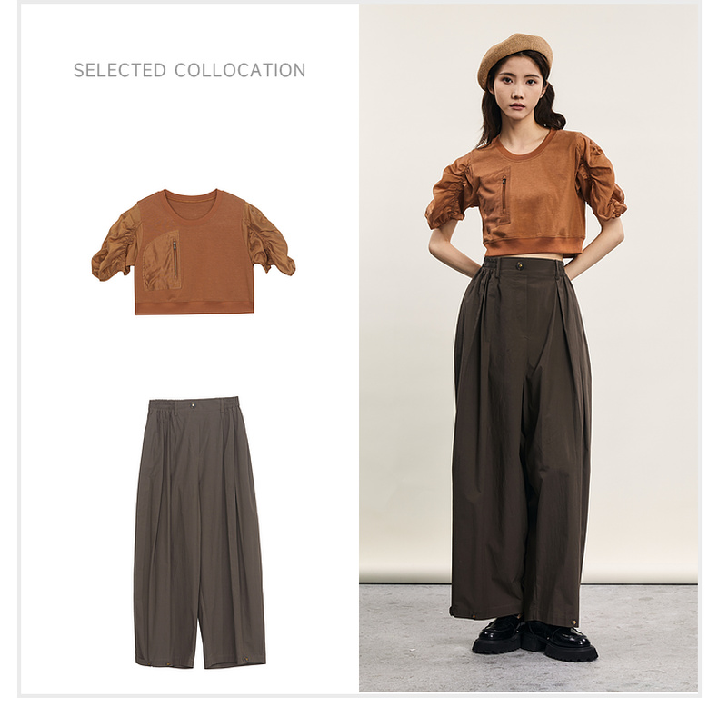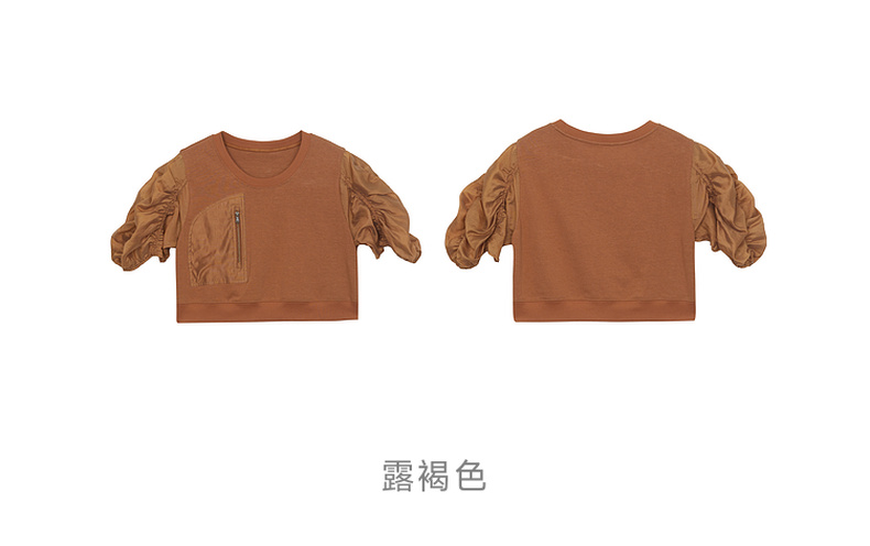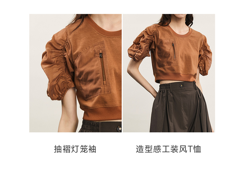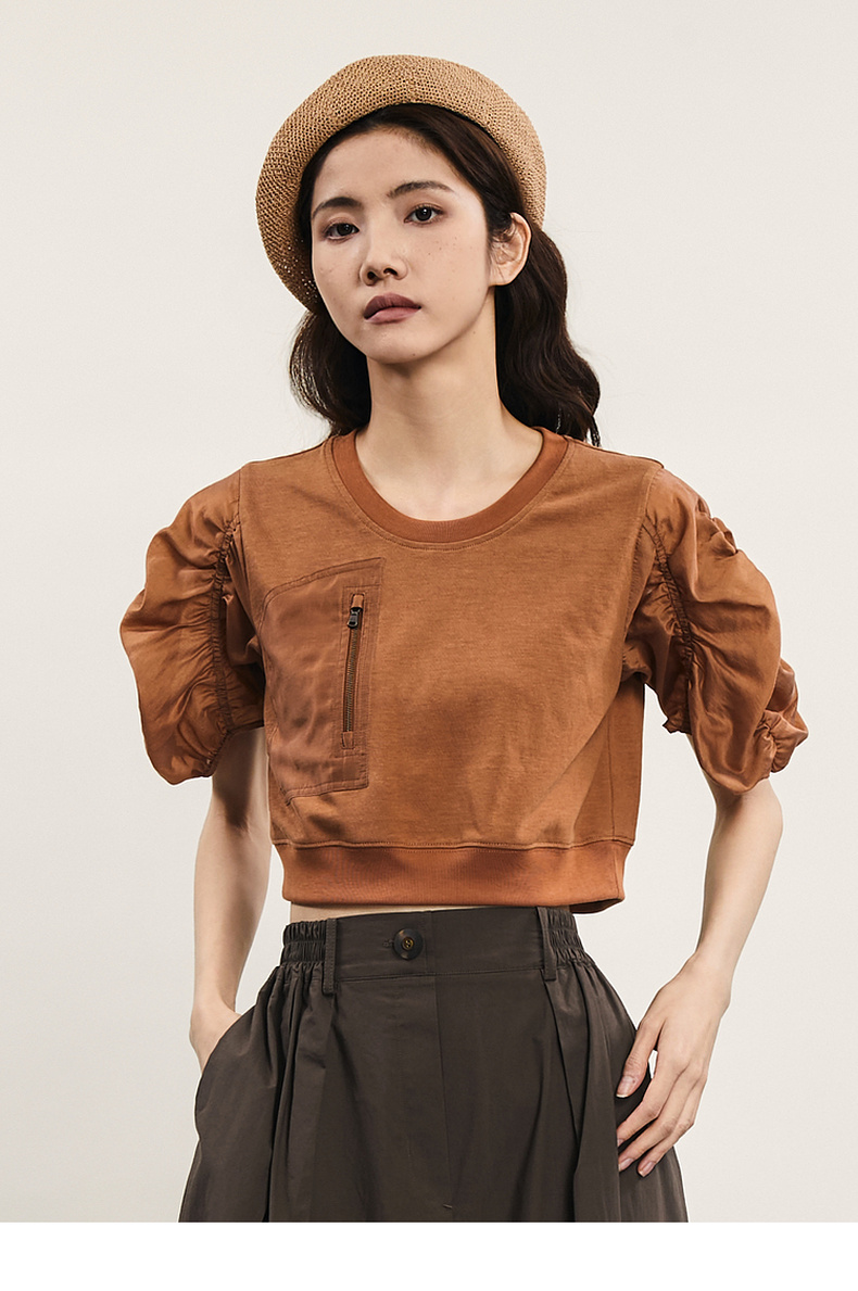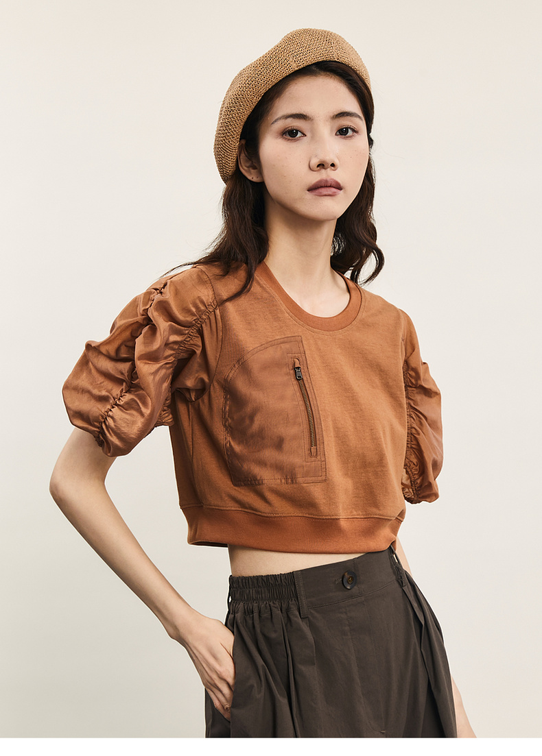 谜底拼接式短款T恤女2024年夏款时尚百搭泡泡袖上衣短袖242MT0567