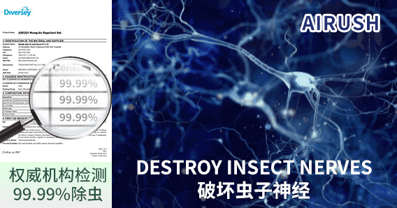 它能触发虫子应激反应、促使逃离并破坏虫子神经、让身体机能停止。经国际权威机构检测:AIRUSH对103种常见虫类,有99.99%的杀灭率!