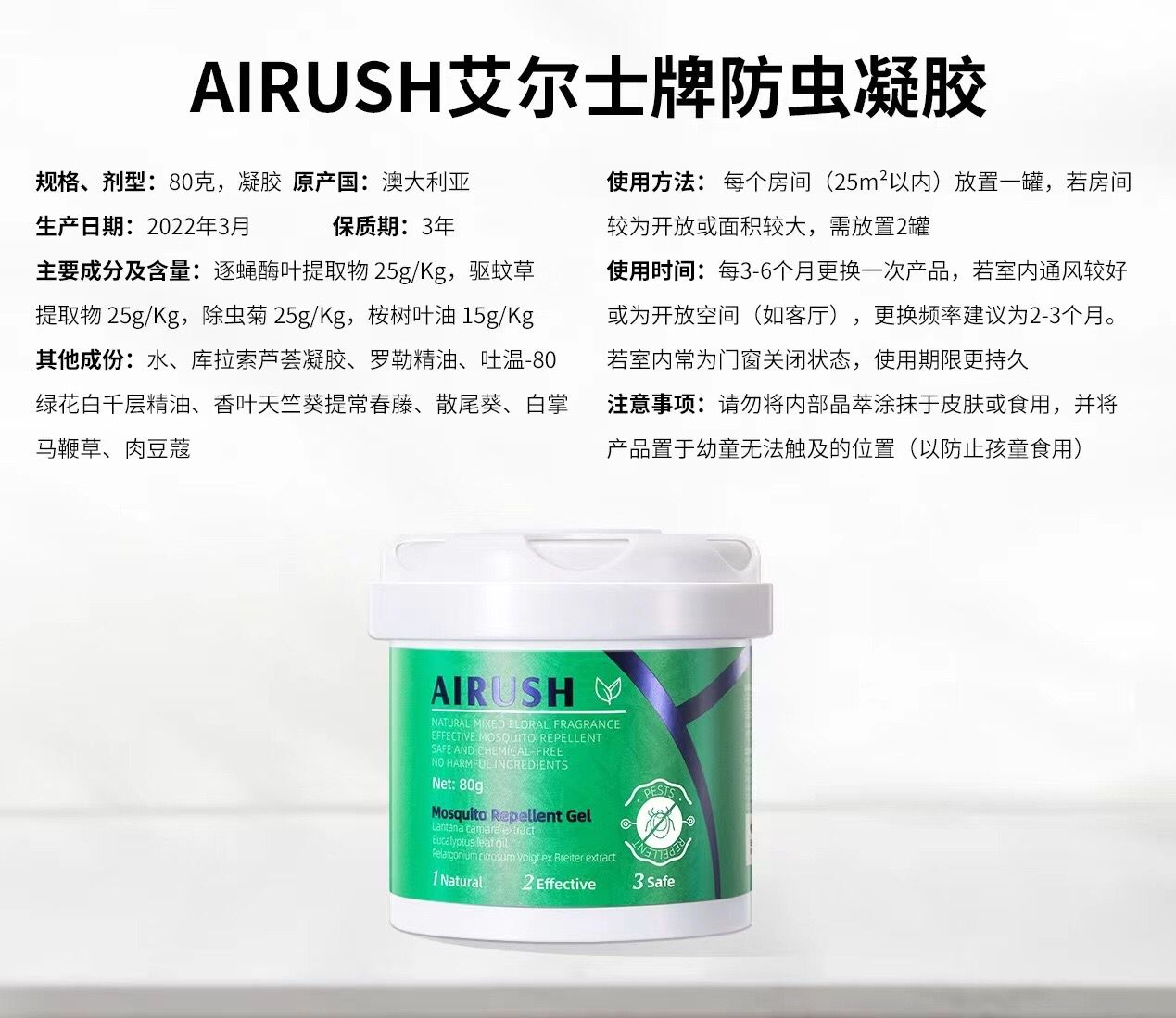 在澳洲,都要15澳元一罐!我们只要59.9元得两罐。AIRUSH防虫凝胶采用专利微分子缓释晶体,效果强,持续时间也非常久!驱虫时效长达6-8个月!花3秒放个它,护你“半年无虫”半年换一次、一罐用半年。