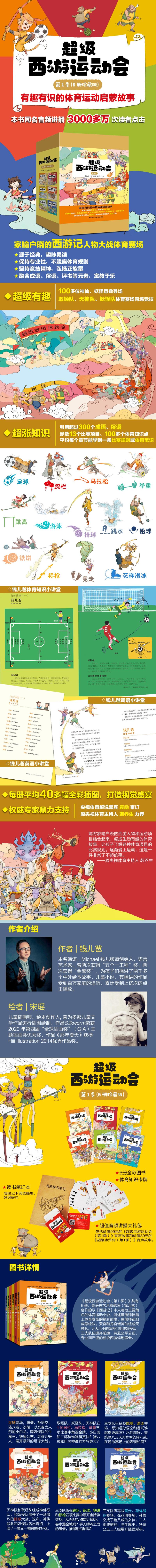 《超级西游运动会(第1 季)》共有6 册,是语言艺术家韩涛(钱儿爸)创作的以《西游记》中人物为主要角色的体育运动小说,讲述唐僧师徒踏上体育赛场的精彩故事。唐僧师徒组成取经队,天宫和龙宫诸神仙组成天神队,大大小小的妖怪们组成妖怪队,三支队伍摒弃前嫌,共赴公平公正、专业而严谨的超级西游运动盛会。