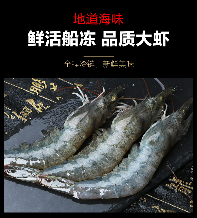 3、纯净海域鲜活直供,从青岛新鲜捕捞上来的大虾,一上船,就立即冲洗、除杂、活冻,并采取“盐冻”保鲜措施;