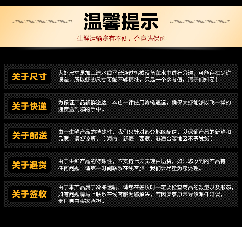 3.由于捕捞季节不同,冷冻温度不同,可能会造成虾的颜色稍有不同,不售后;