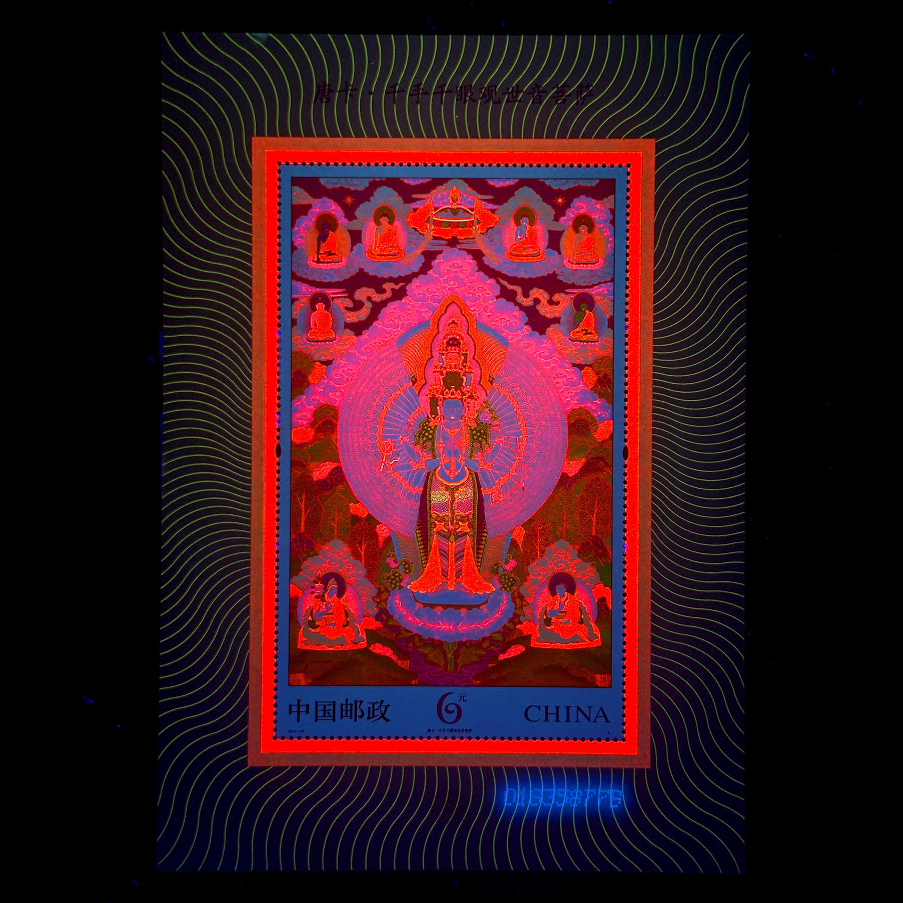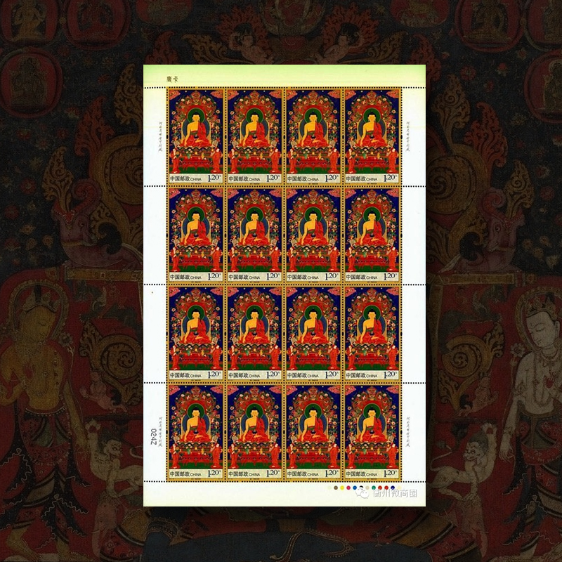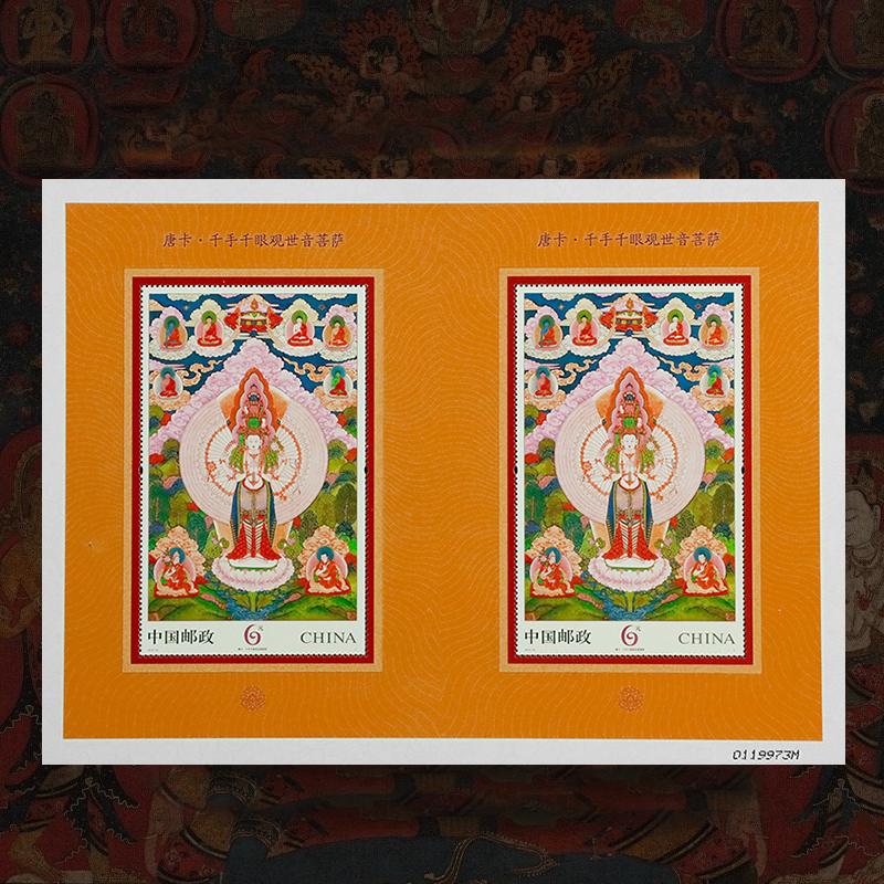 4枚邮票图案分别为:释迦牟尼佛、无量寿佛、绿度母、白度母,还有1 枚千手千眼观世音菩萨小型张。