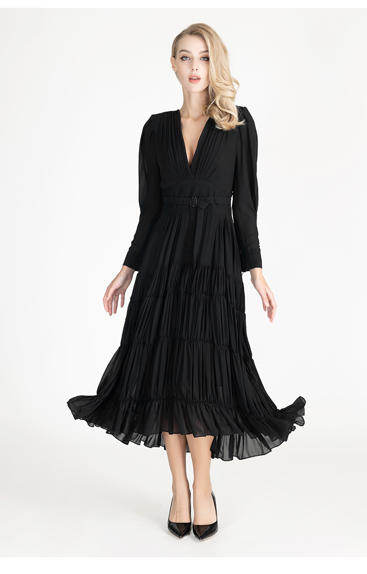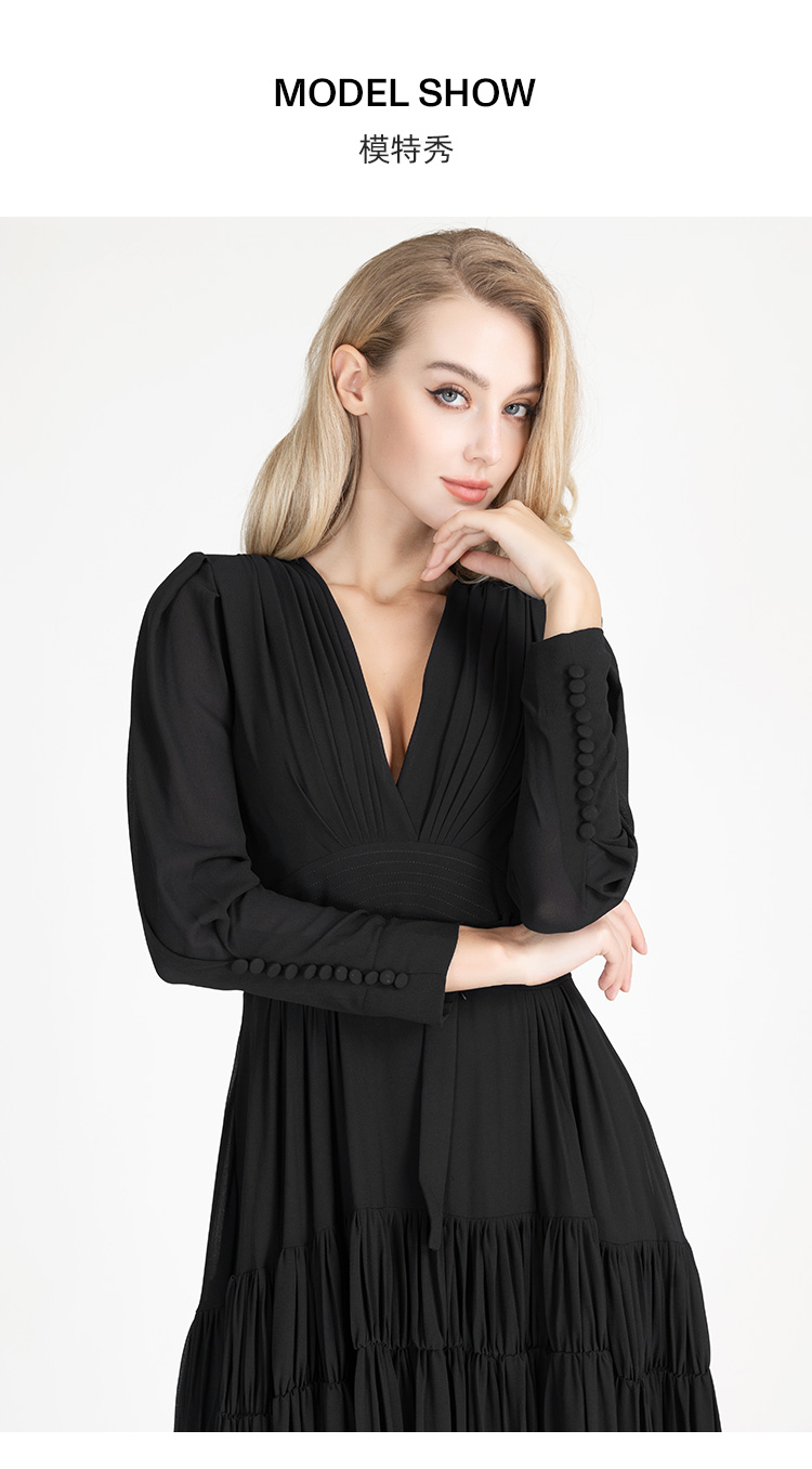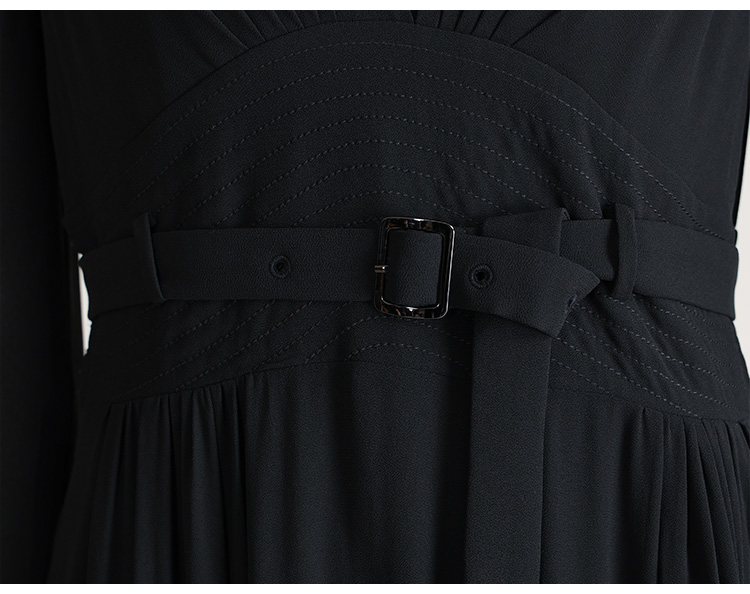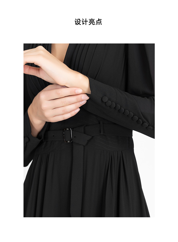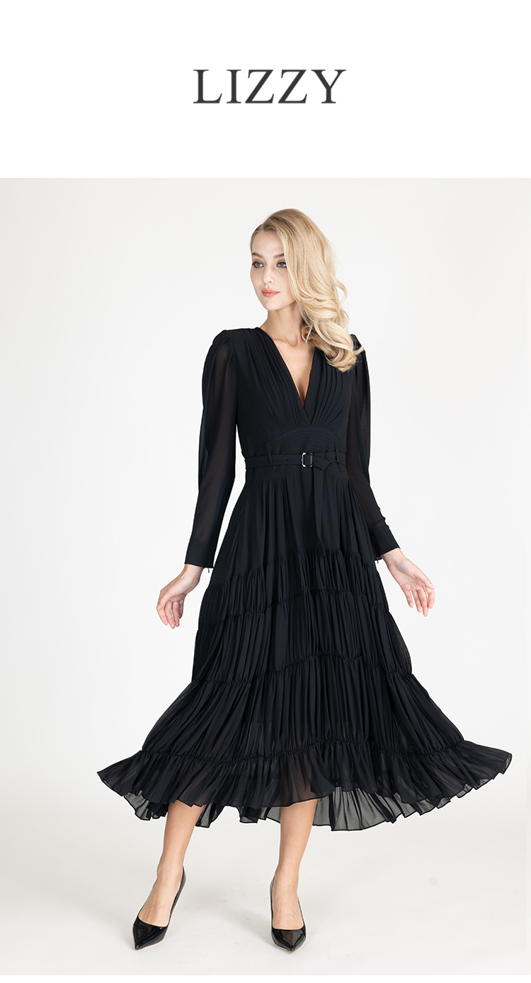LIZZY早秋优雅文艺精致V领收腰大摆小黑裙长袖连衣裙配腰带