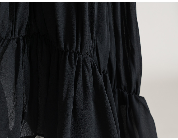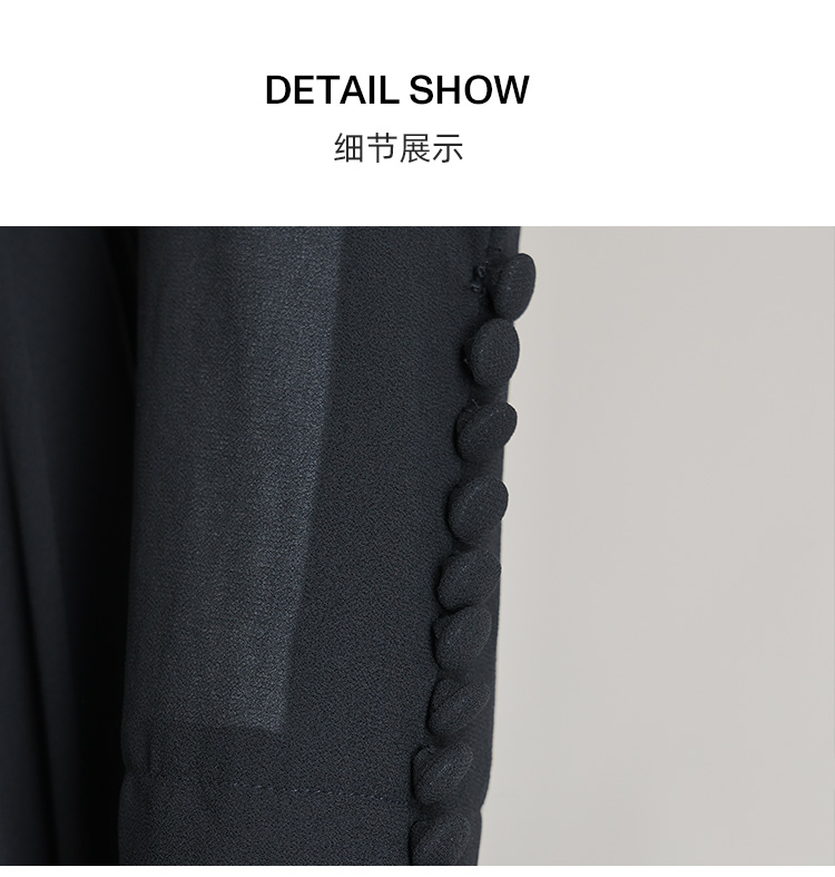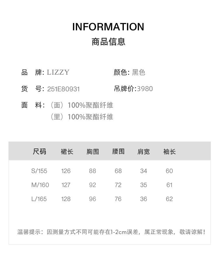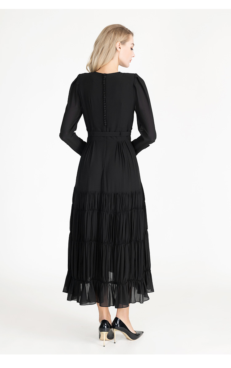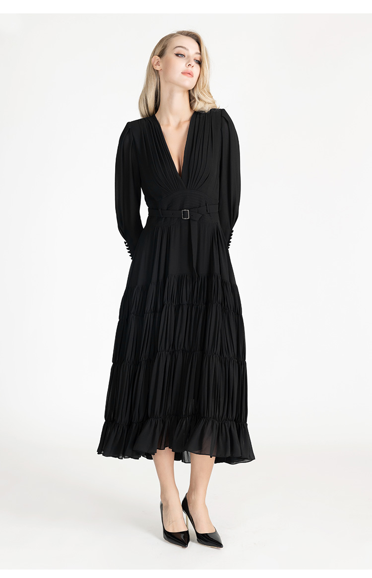 LIZZY早秋优雅文艺精致V领收腰大摆小黑裙长袖连衣裙配腰带