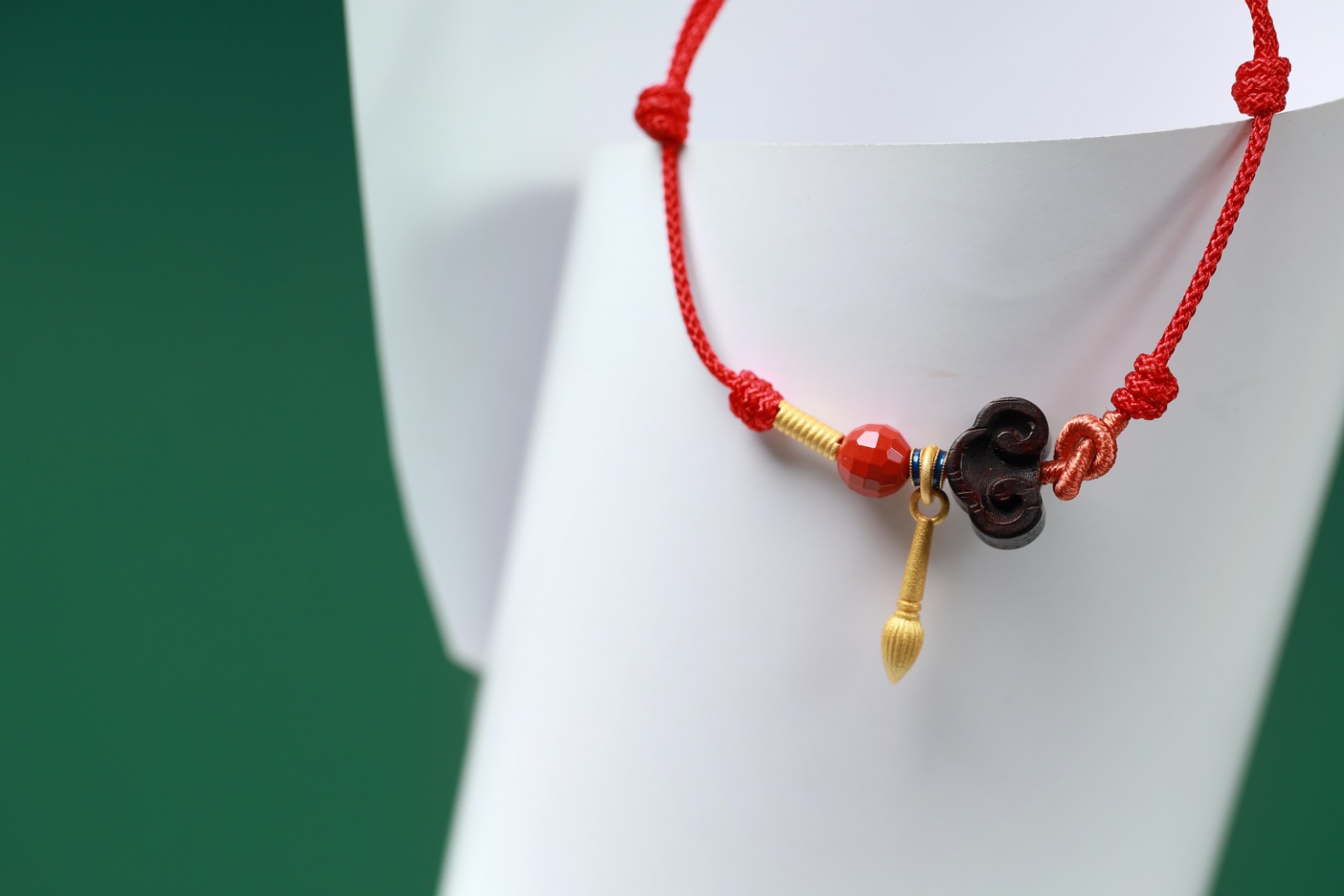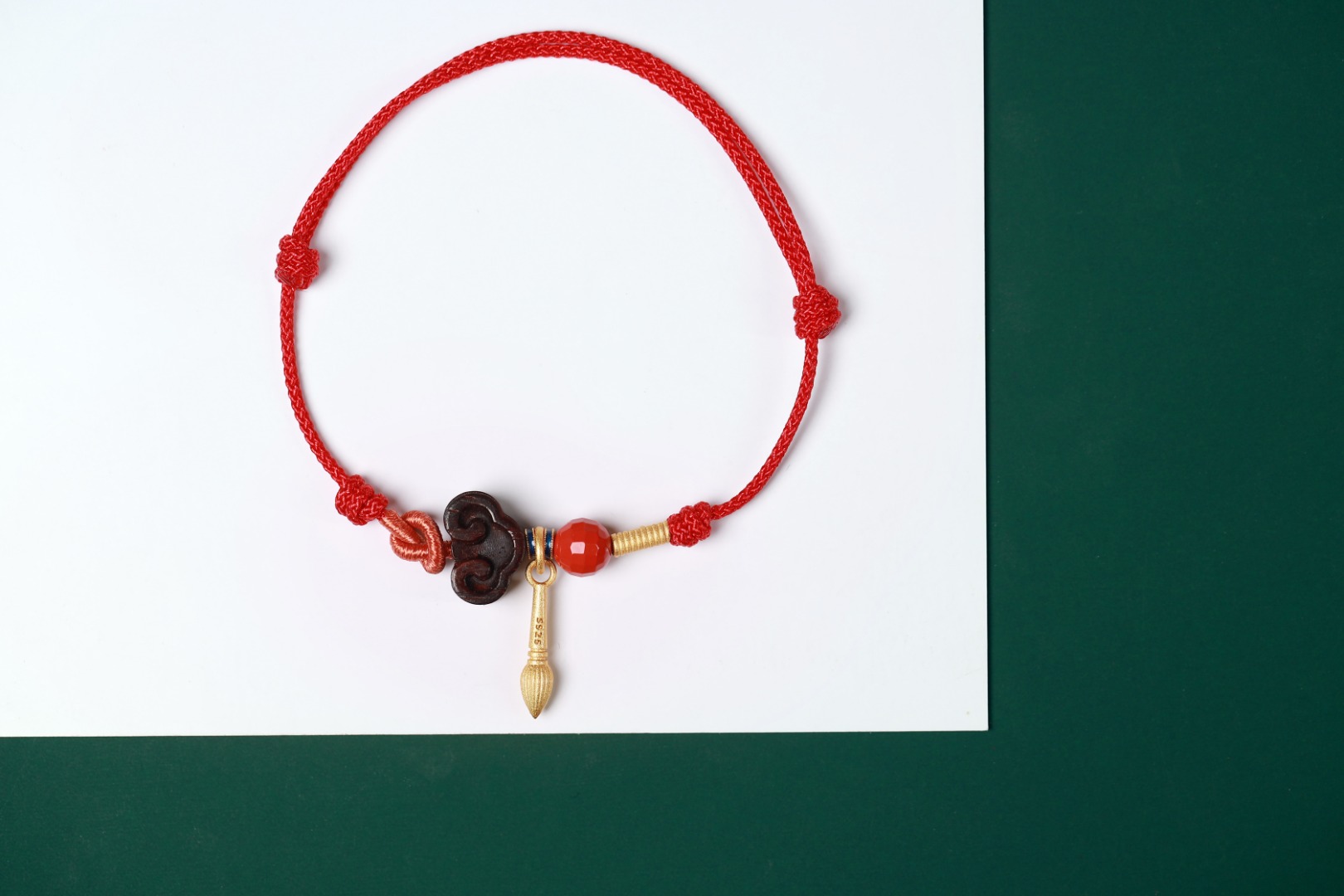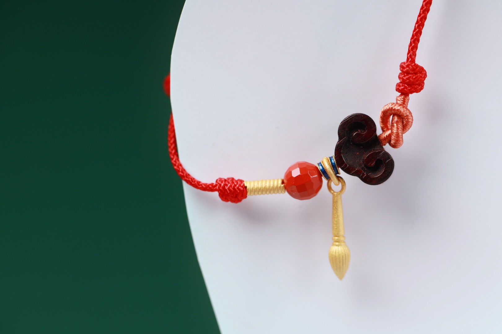朱砂切面珠/紫檀四种云/烧蓝隔珠/银镀24K:文昌笔/小长柱