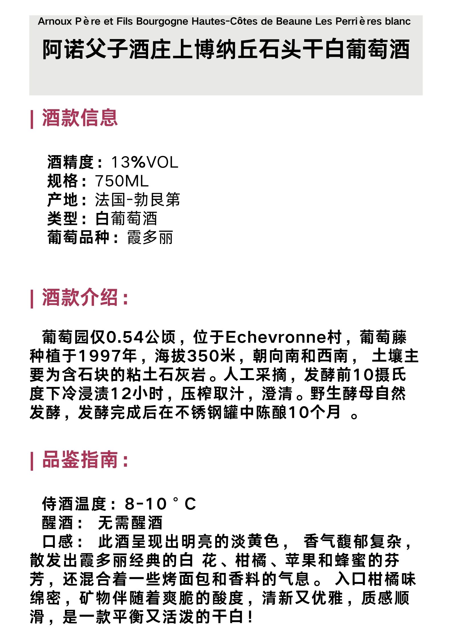 阿诺父子酒庄上博纳丘石头干白葡萄酒 Arnoux Père et Fils Bourgogne Hautes-Côtes de Beaune Les Perrières blanc