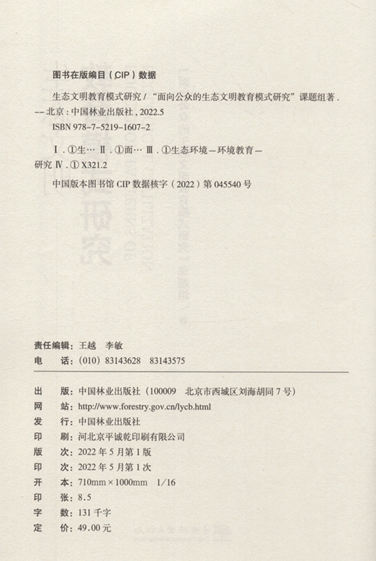 生态文明教育模式研究 面向公众的生态文明教育模式研究课题组 1607 中国林业出版社