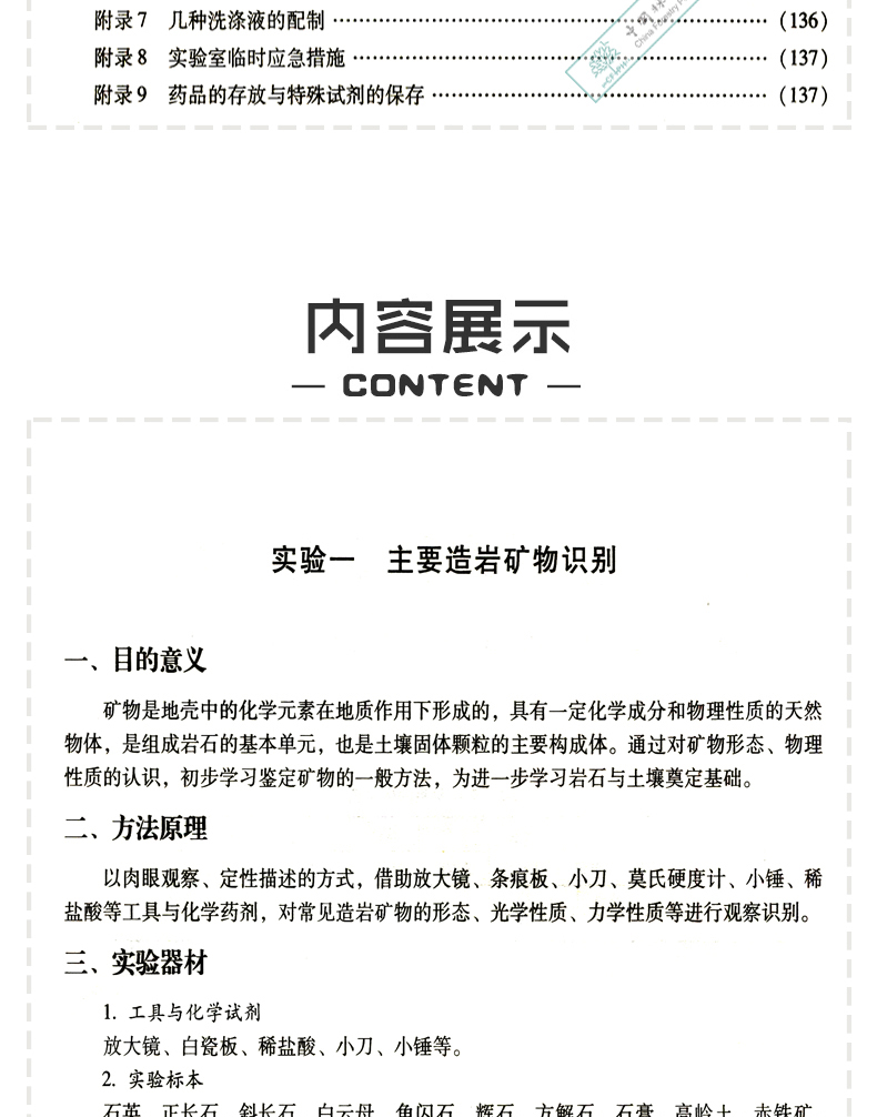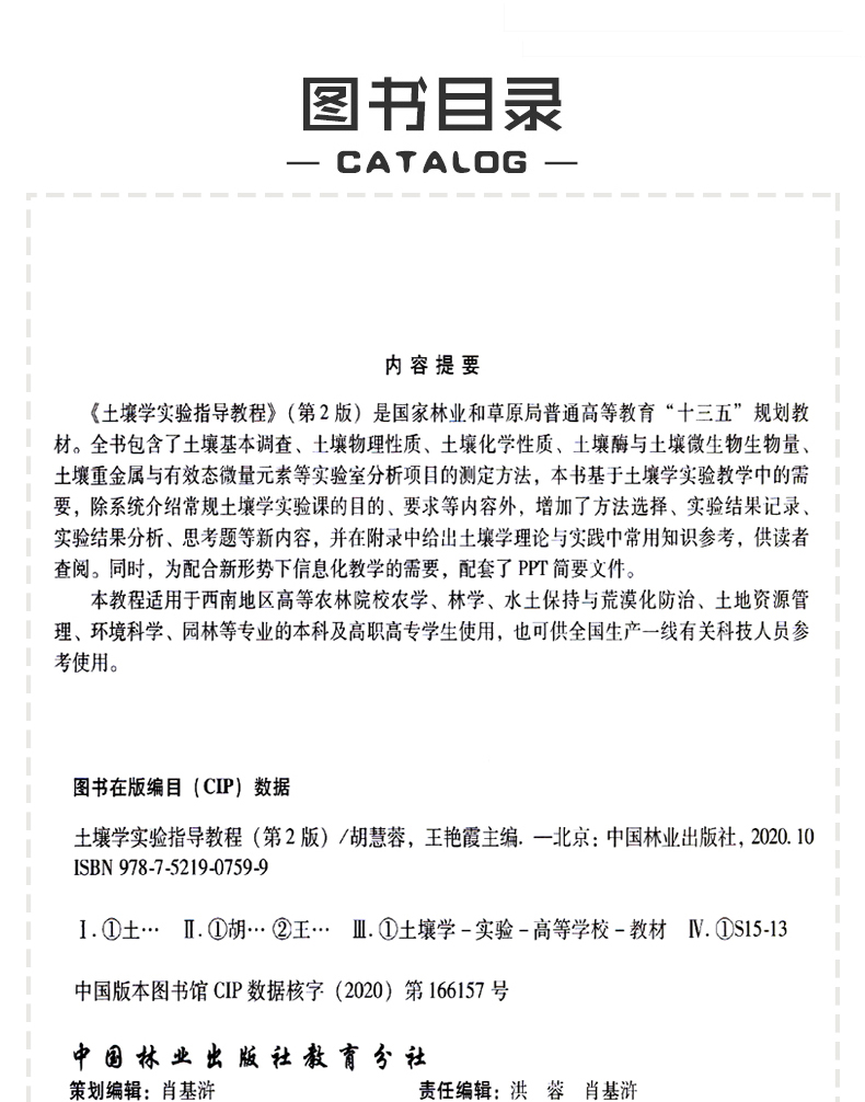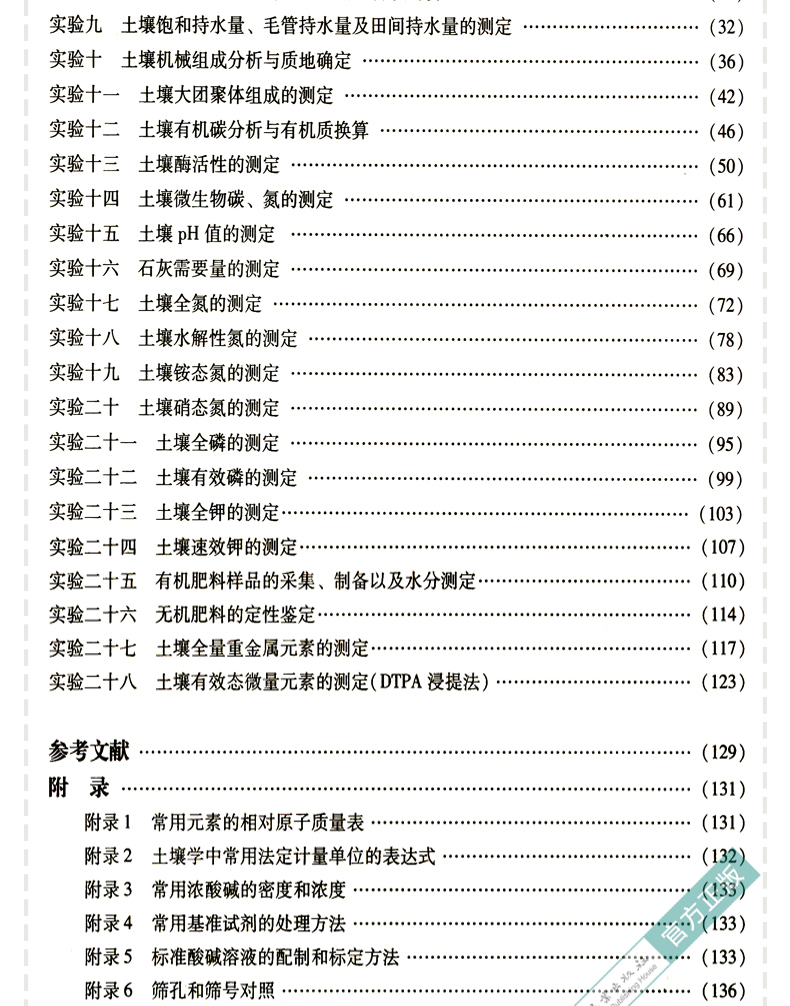 《土壤学实验指导教程》(第2版)是国家林业和草原局普通高等教育“十三五”规划教材。全书包含了土壤基本调查、土壤物理性质、土壤化学性质、土壤酶与土壤微生物生物量、土壤重金属与有效态微量元素等实验室分析项目的测定方法,本书基于土壤学实验教学中的需要,除系统介绍常规土壤学实验课的目的、要求等内容外,增加了方法选择、实验结果记录、实验结果分析、思考题等新内容,并在附录中给出土壤学理论与实践中常用知识参考,供读者查阅。同时,为配合新形势下信息化教学的需要,配套了PPT简要文件。 本教程适用于西南地区高等农林院校农学、林学、水土保持与荒漠化防治、土地资源管理、环境科学、园林等专业的本科及高职高专学生使用,也可供全国生产一线有关科技人员参考使用。