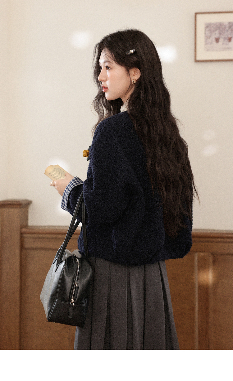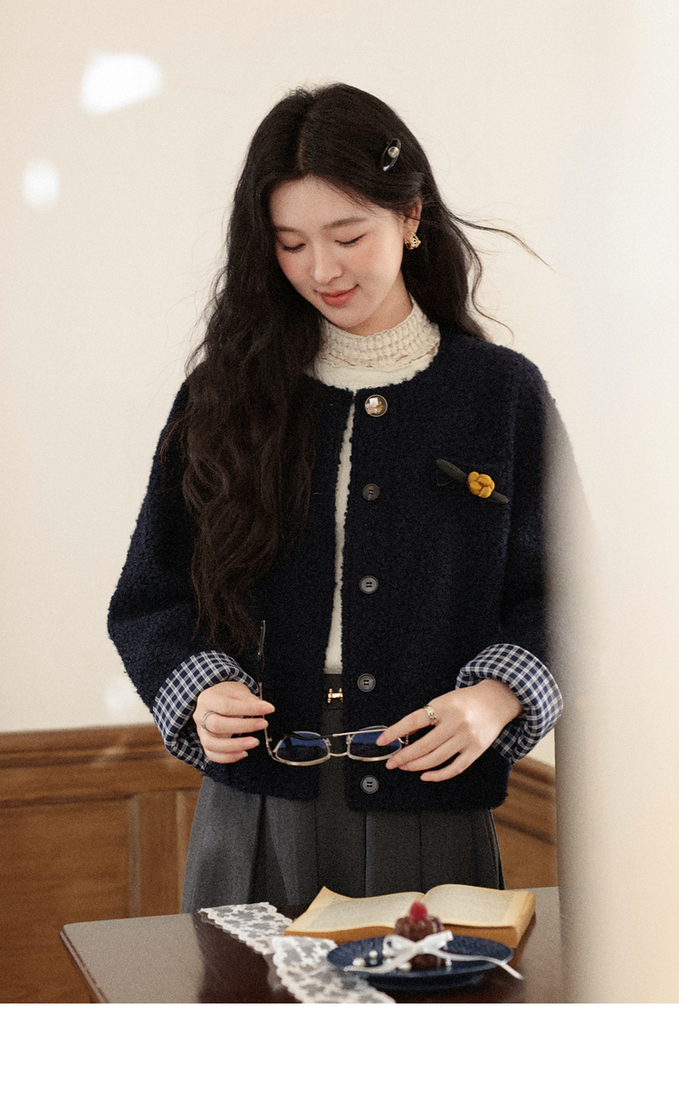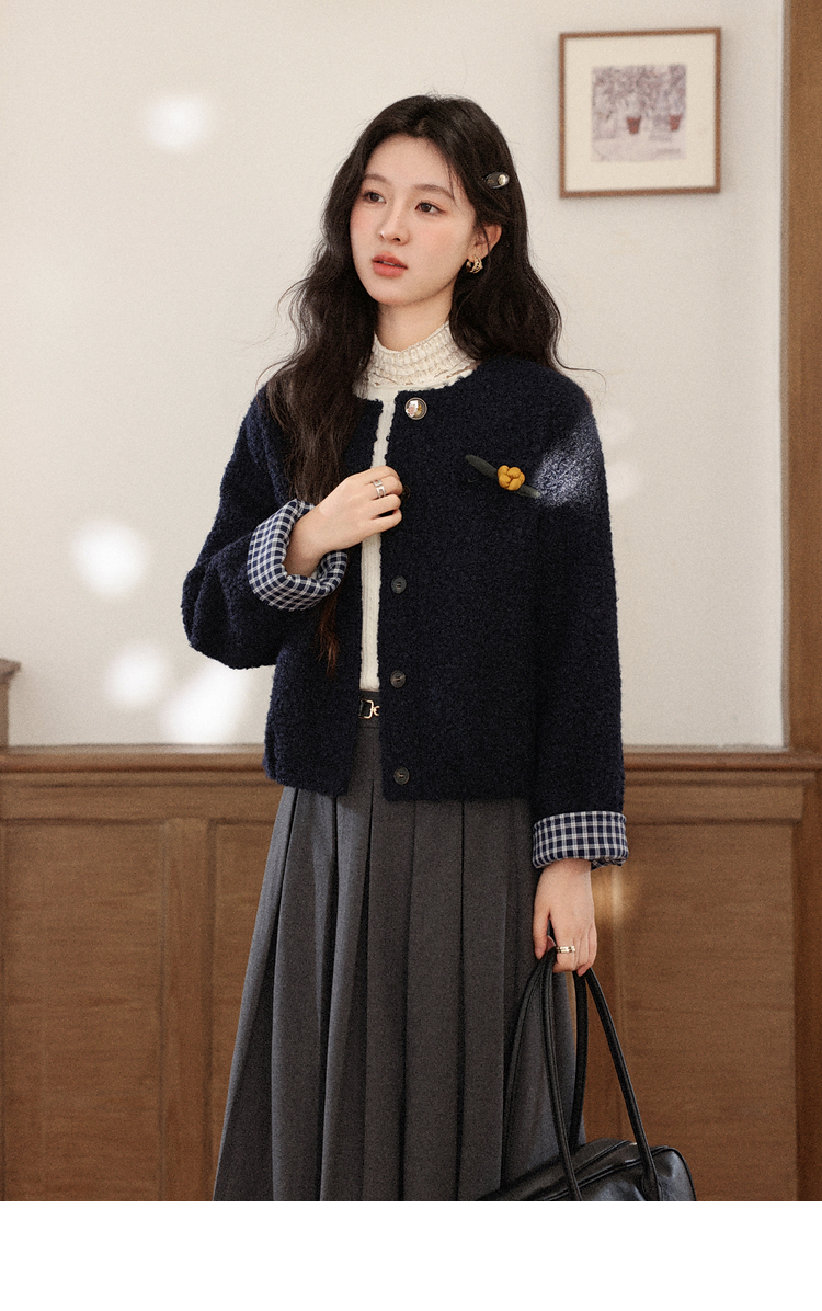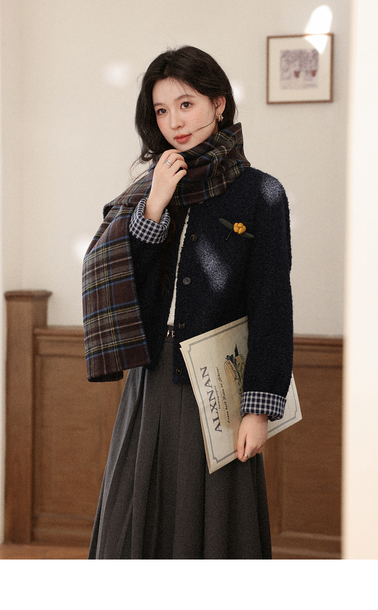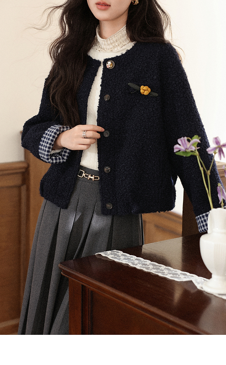 鹿向南「冬日恋岛」小个子藏蓝色短外套女秋冬高级小香风开衫上衣