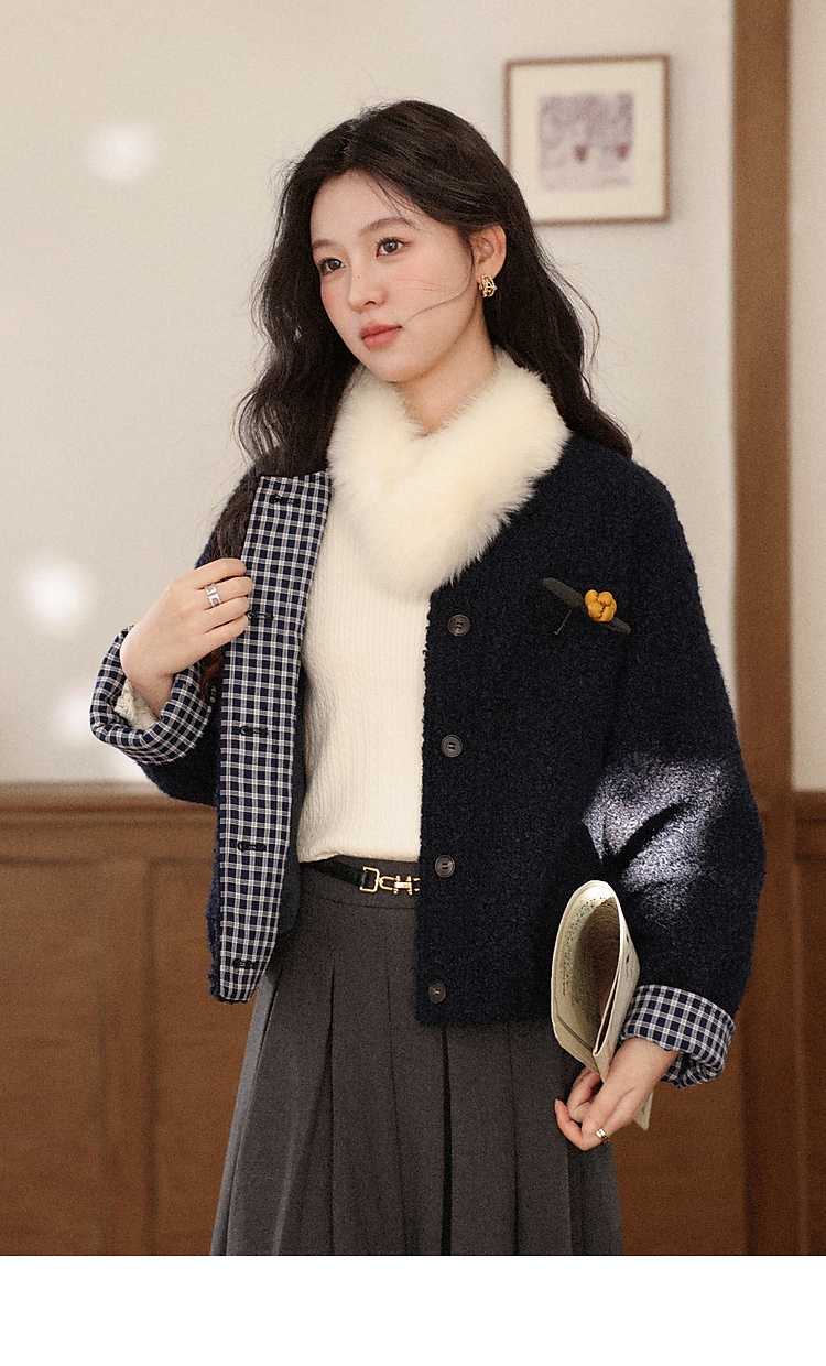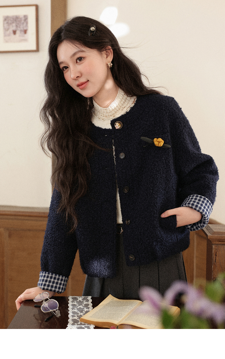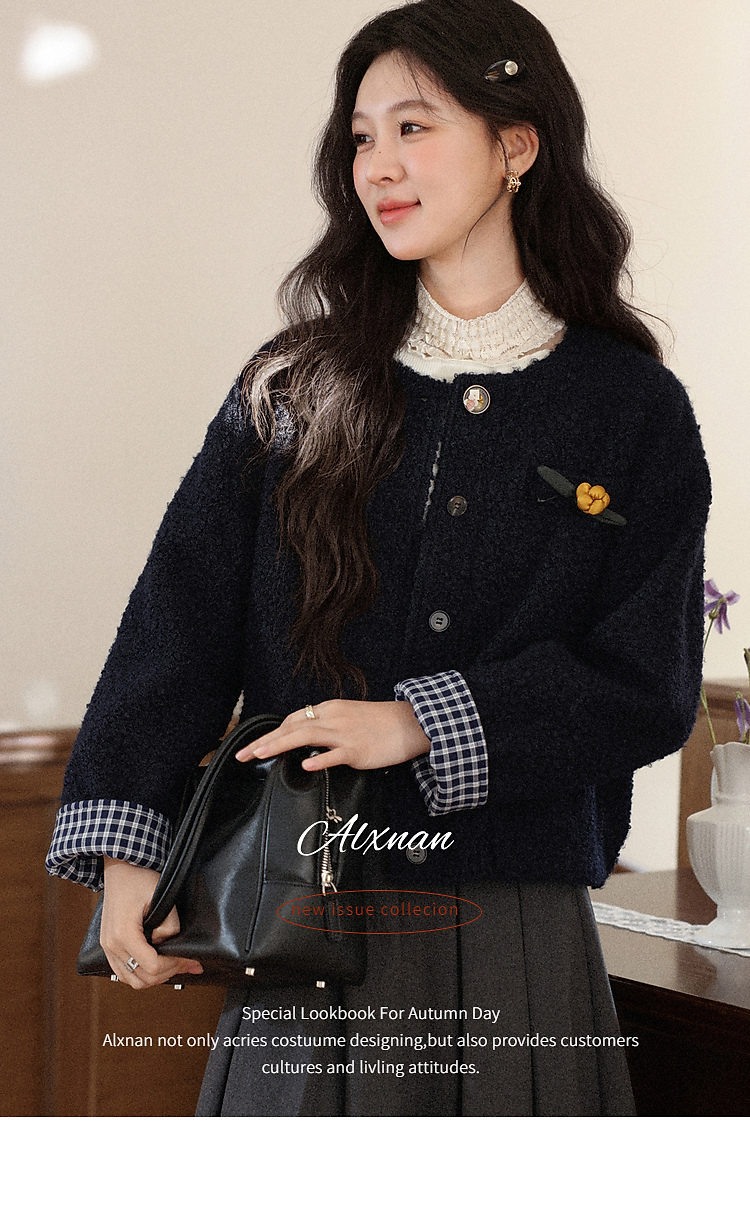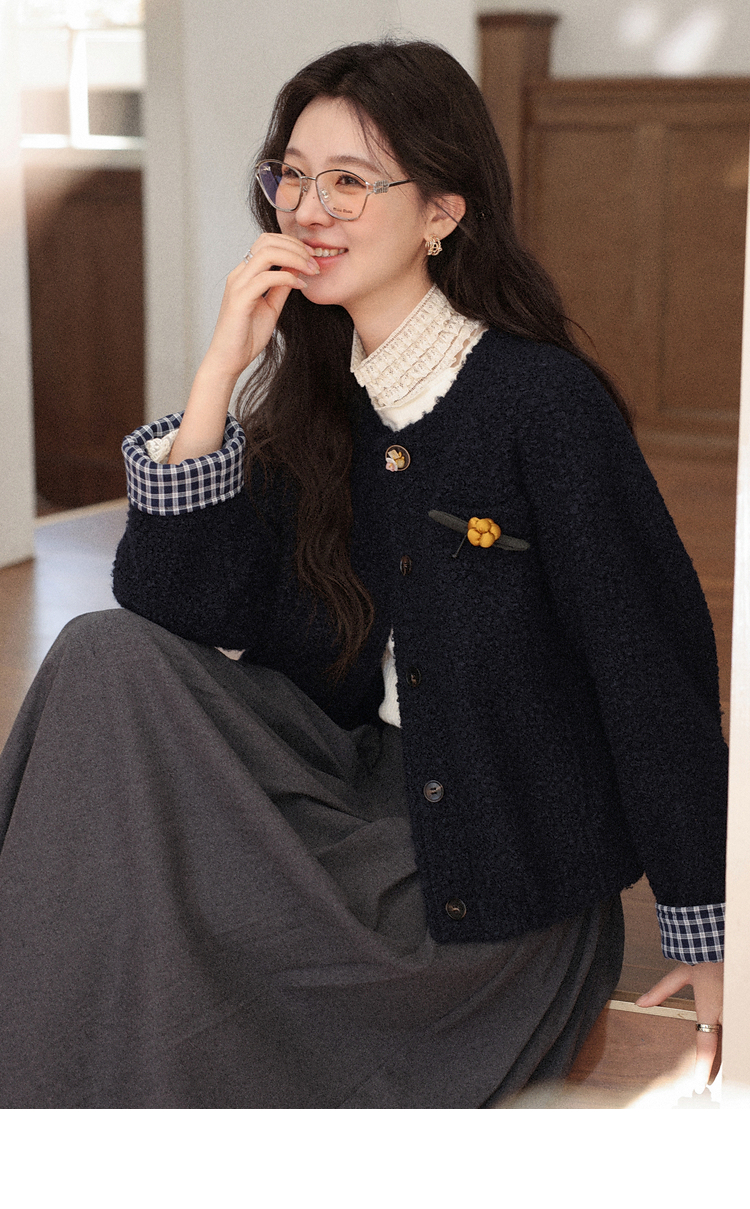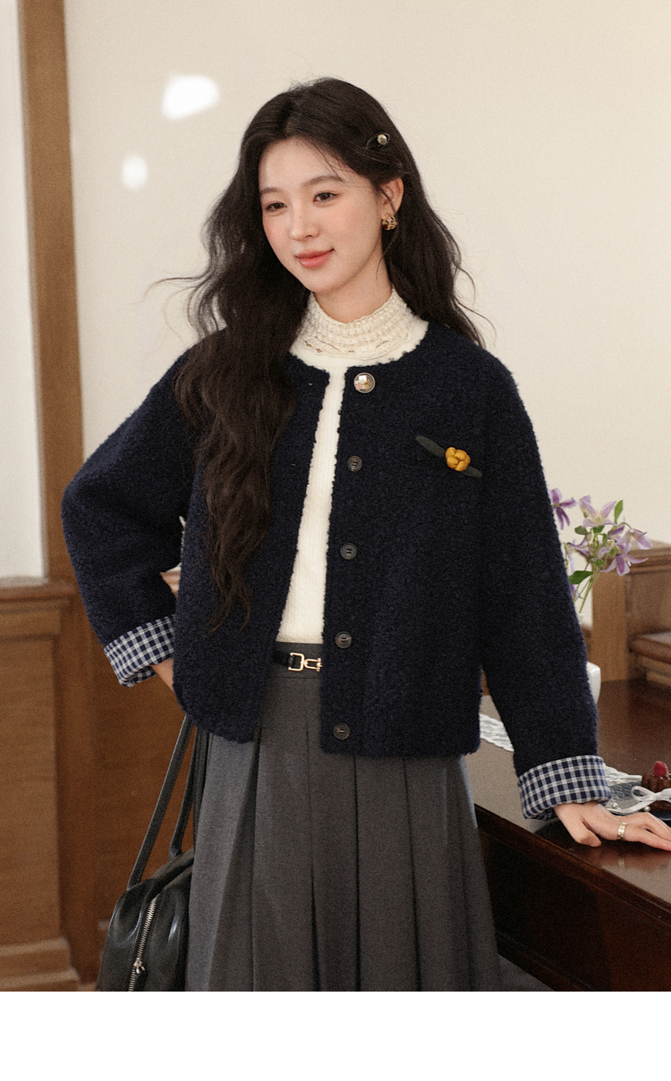 鹿向南「冬日恋岛」小个子藏蓝色短外套女秋冬高级小香风开衫上衣