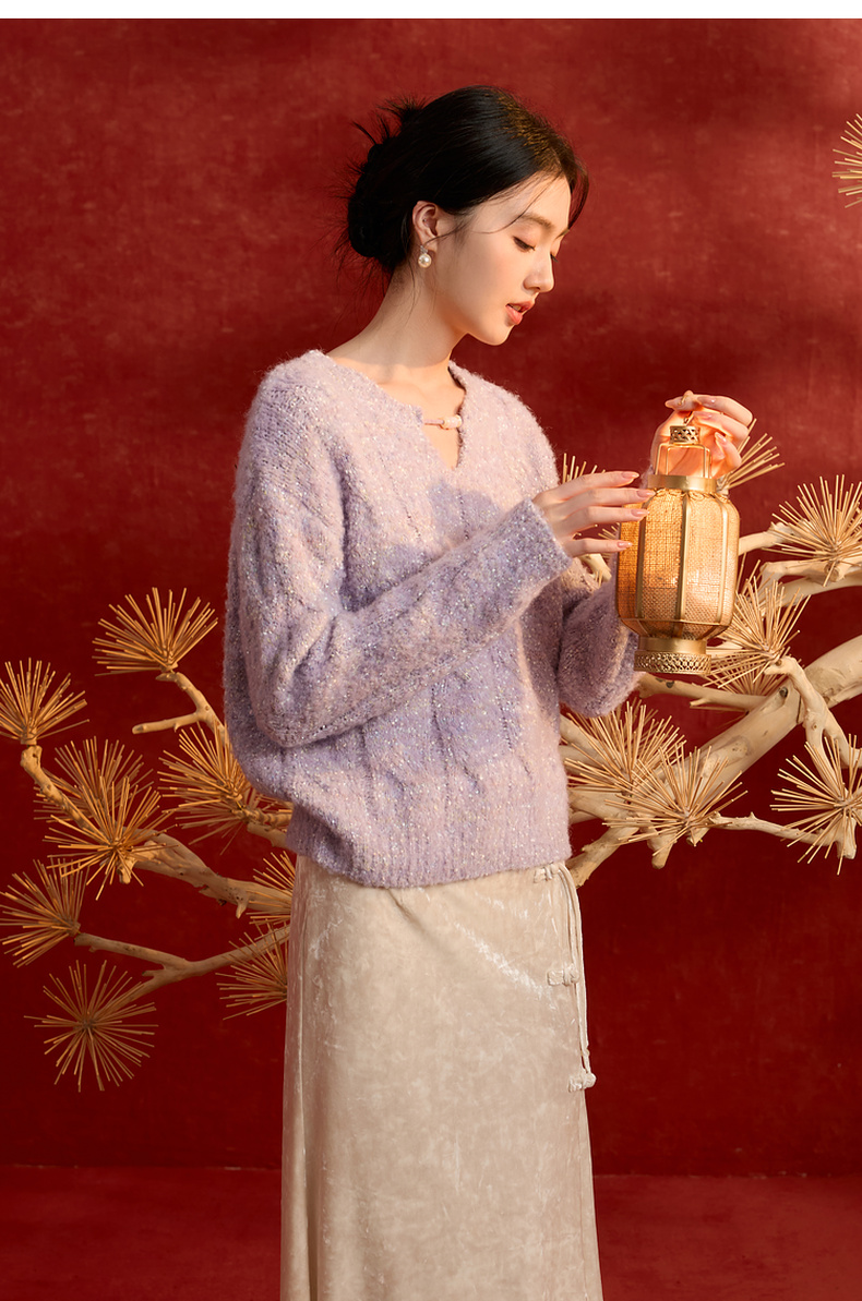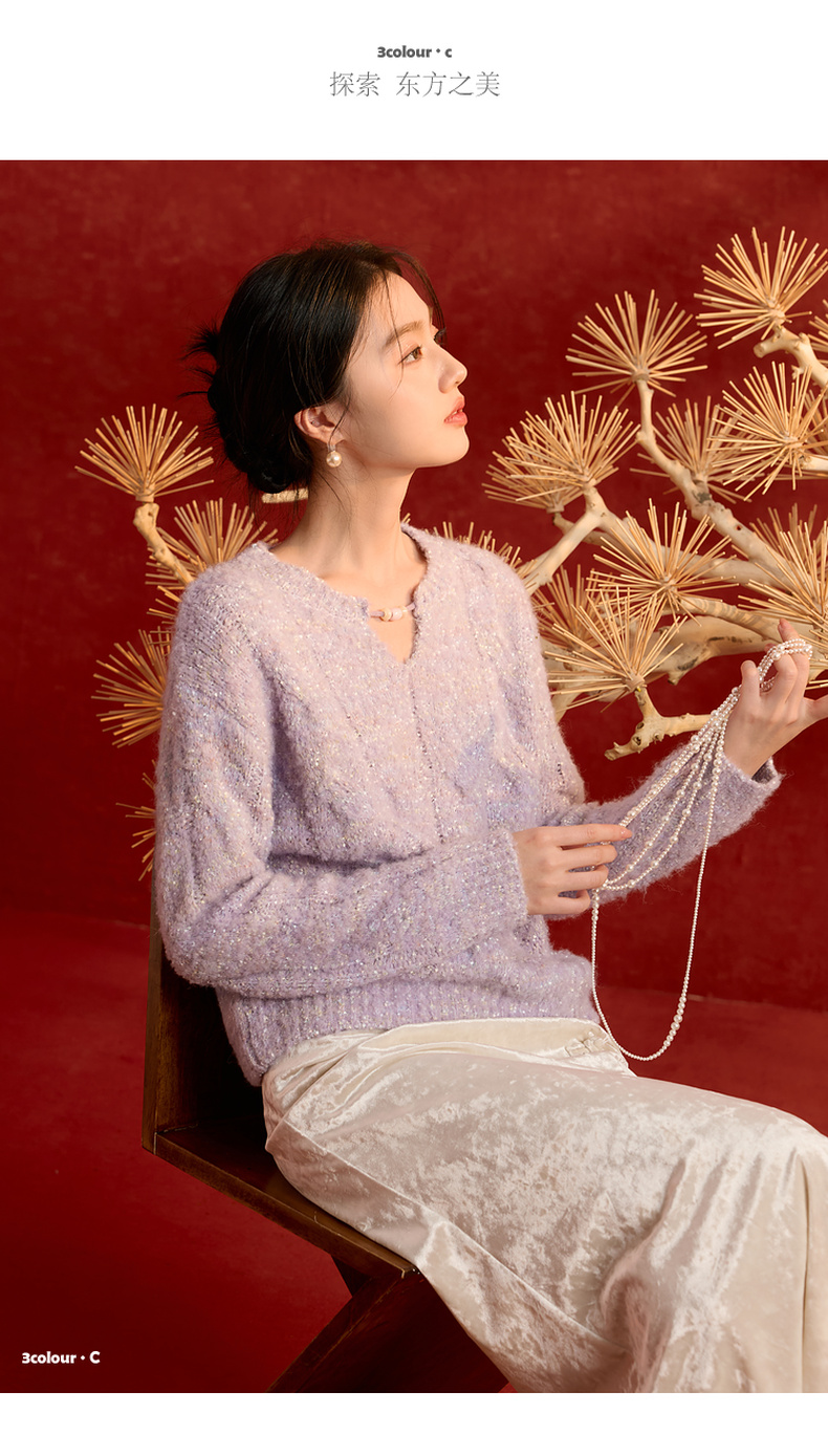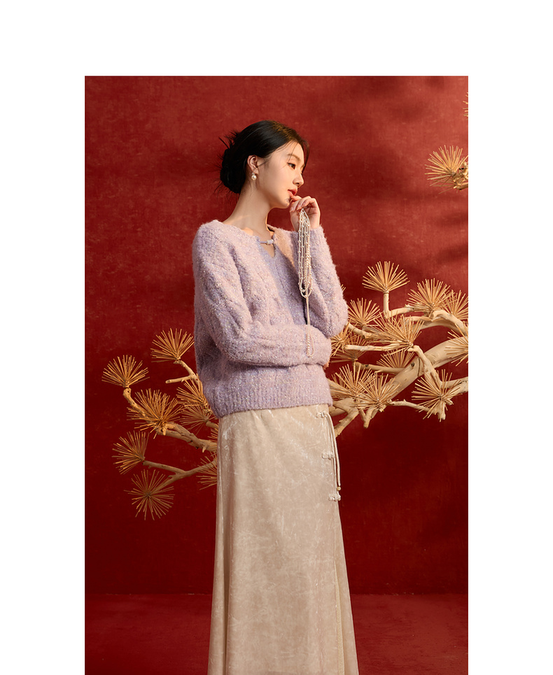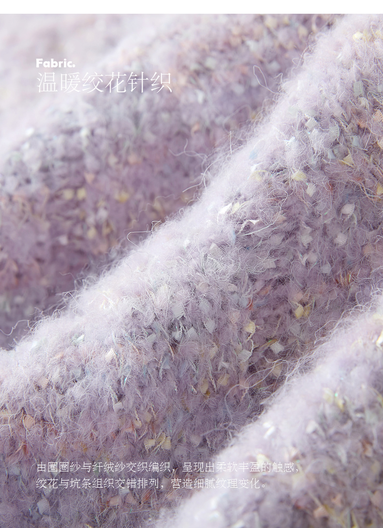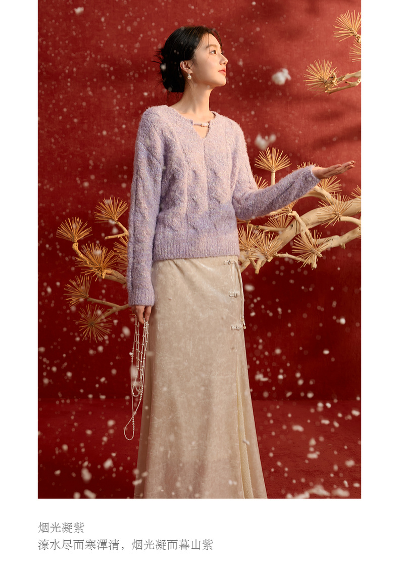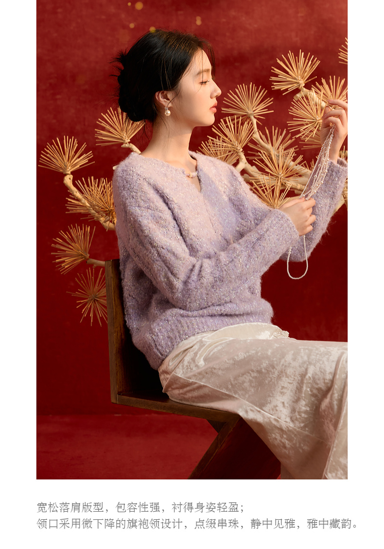 三彩【烟光凝紫】2025冬季新款新中式针织衫宽松落肩袖毛衫套头C