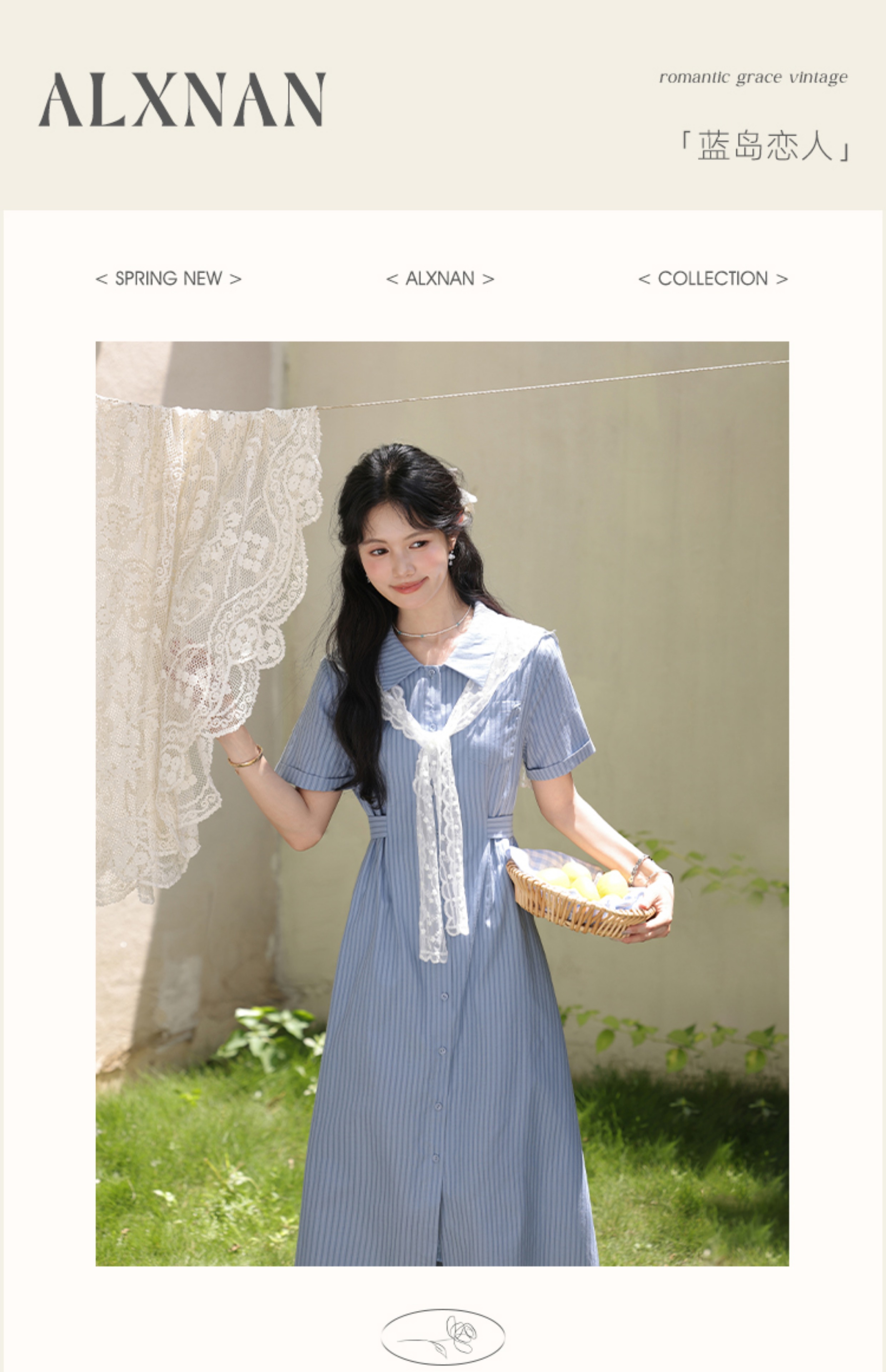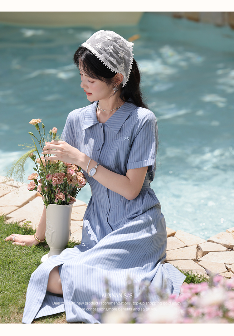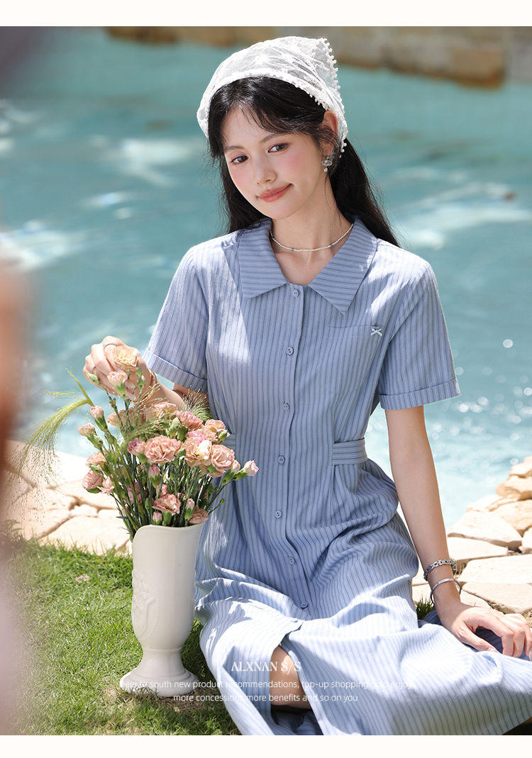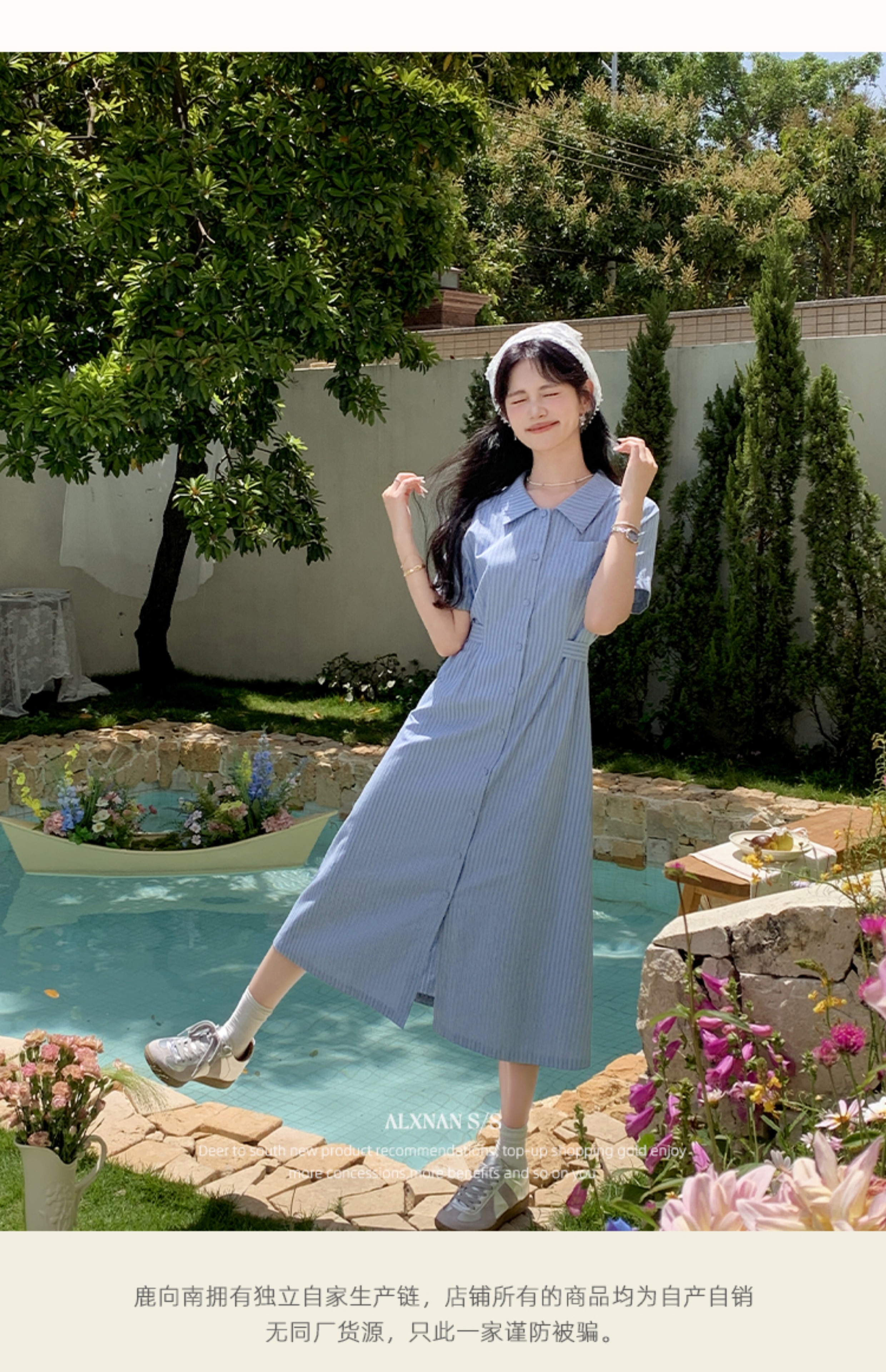 鹿向南「蓝岛恋人」法式气质蓝色条纹短袖翻领连衣裙女夏A字长裙