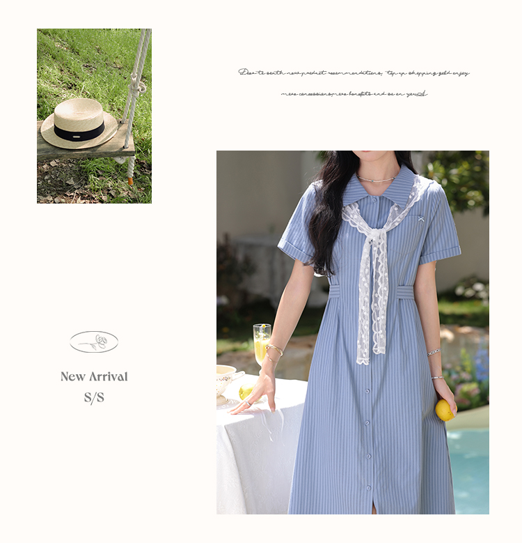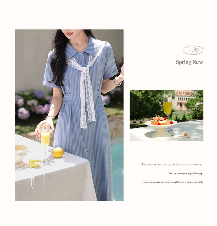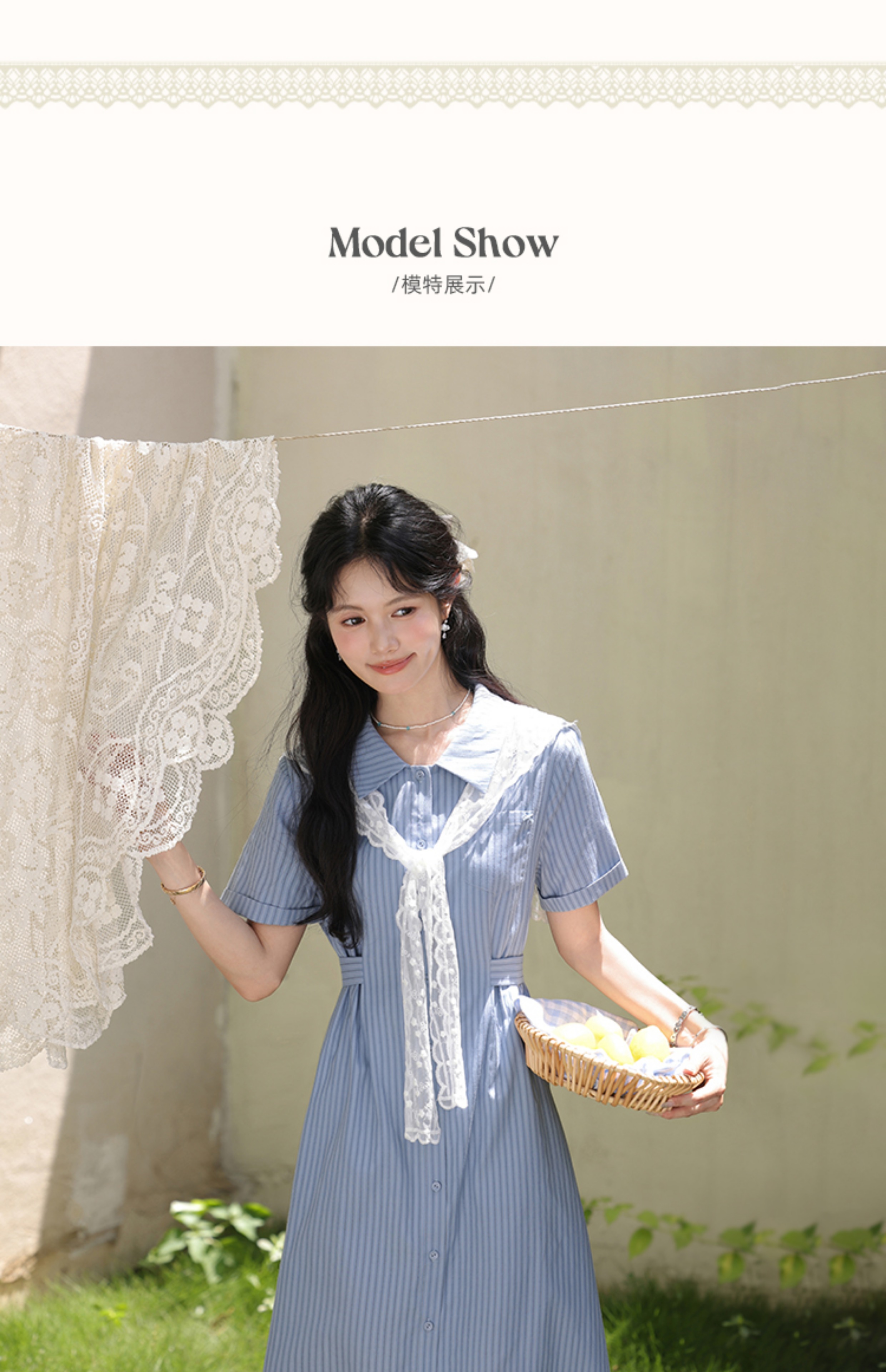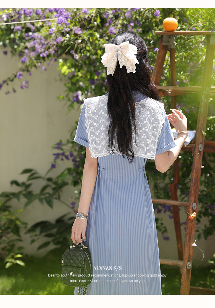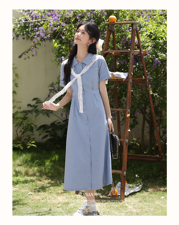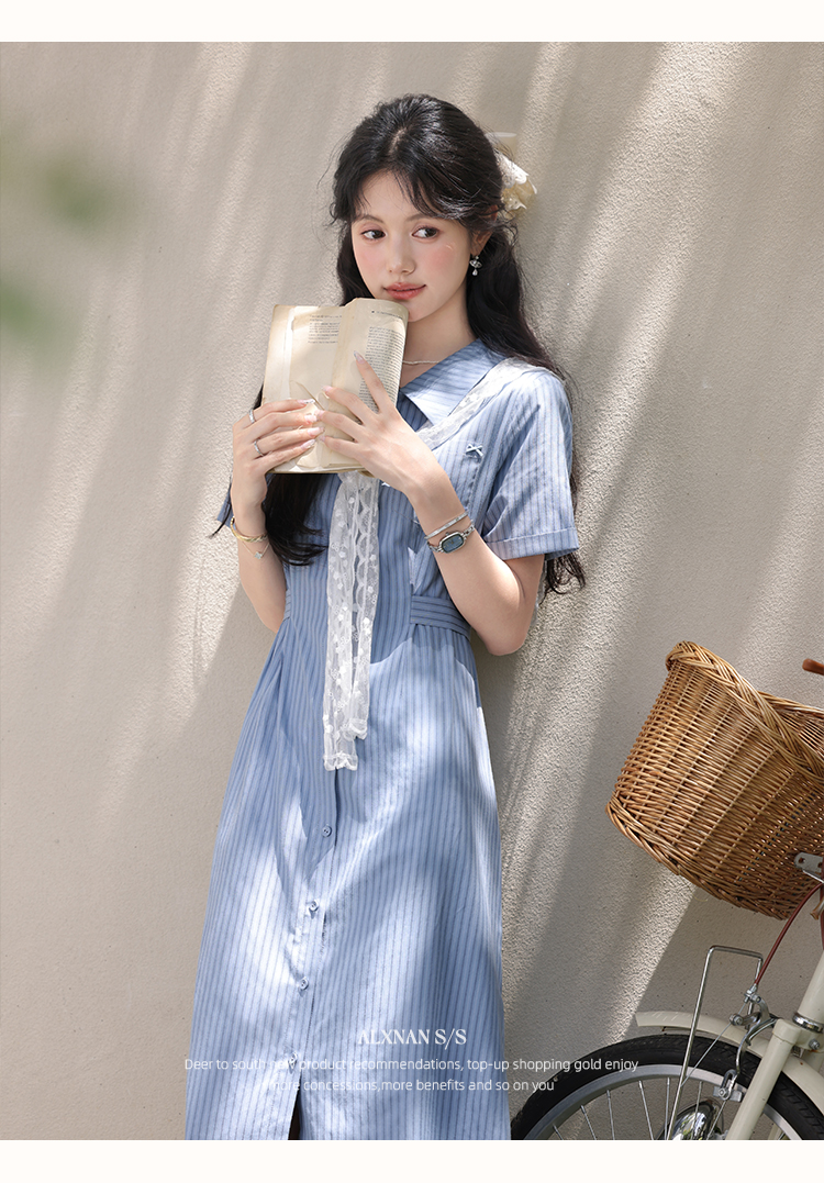 鹿向南「蓝岛恋人」法式气质蓝色条纹短袖翻领连衣裙女夏A字长裙