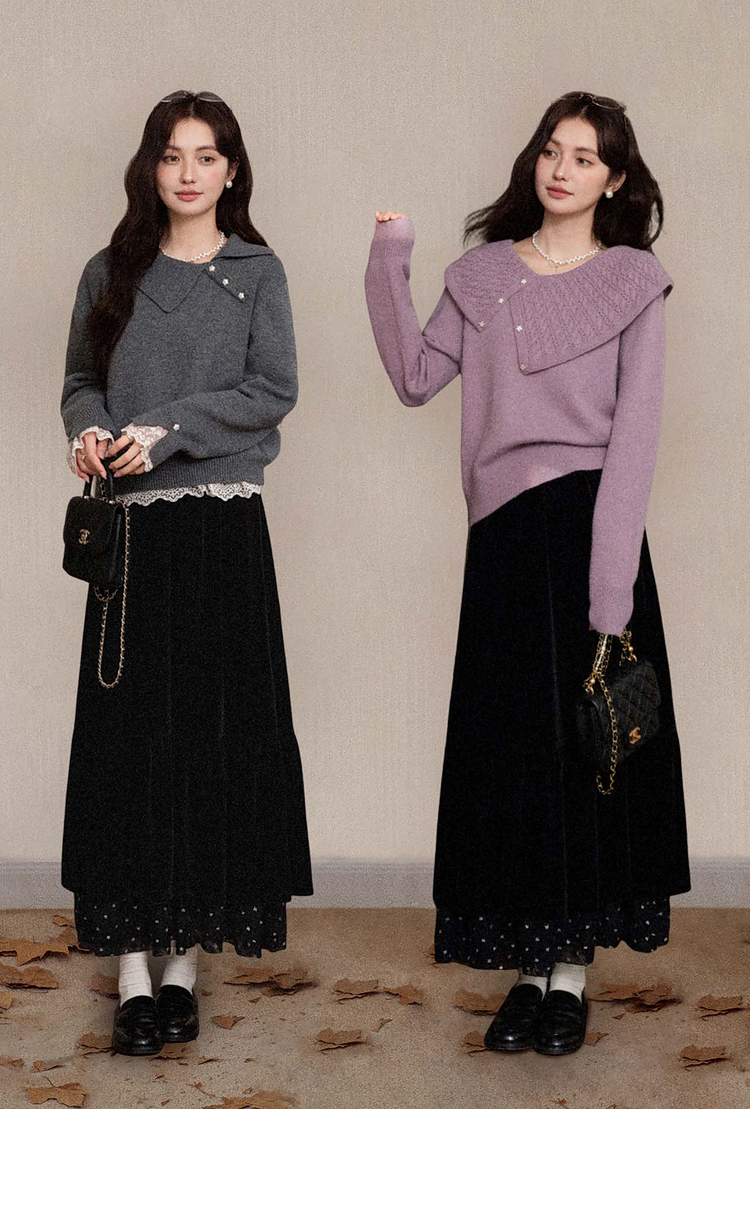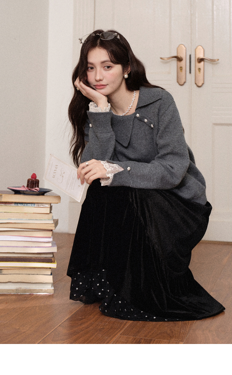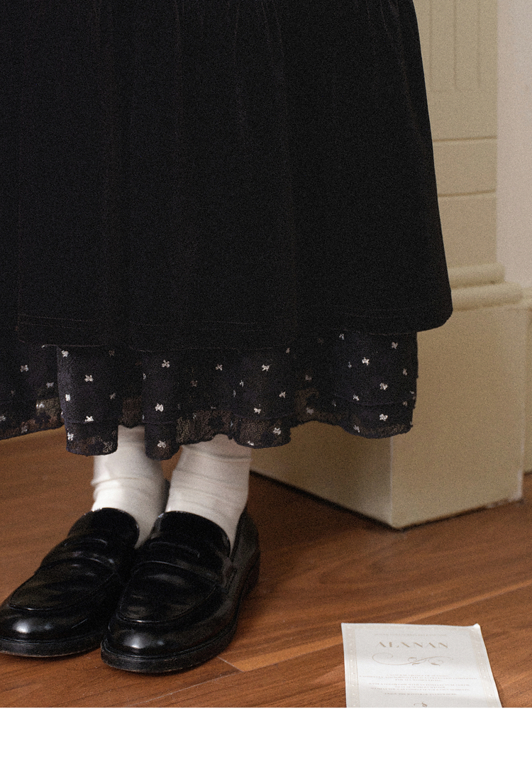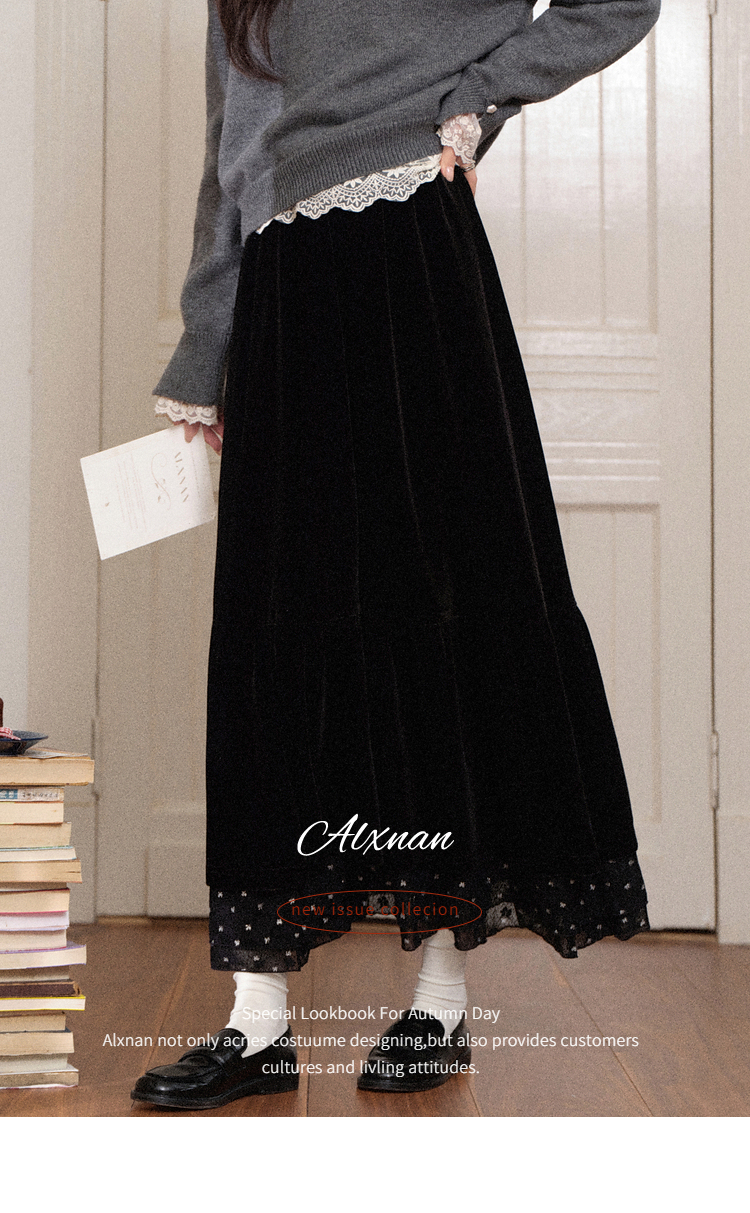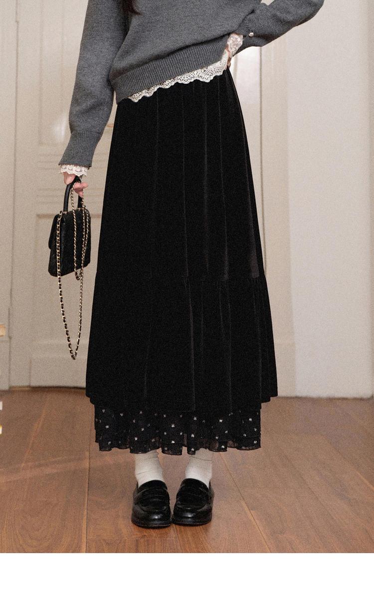 鹿向南「烁烁夜幕」黑色丝绒半身裙女冬拼接蕾丝小个子高腰长裙