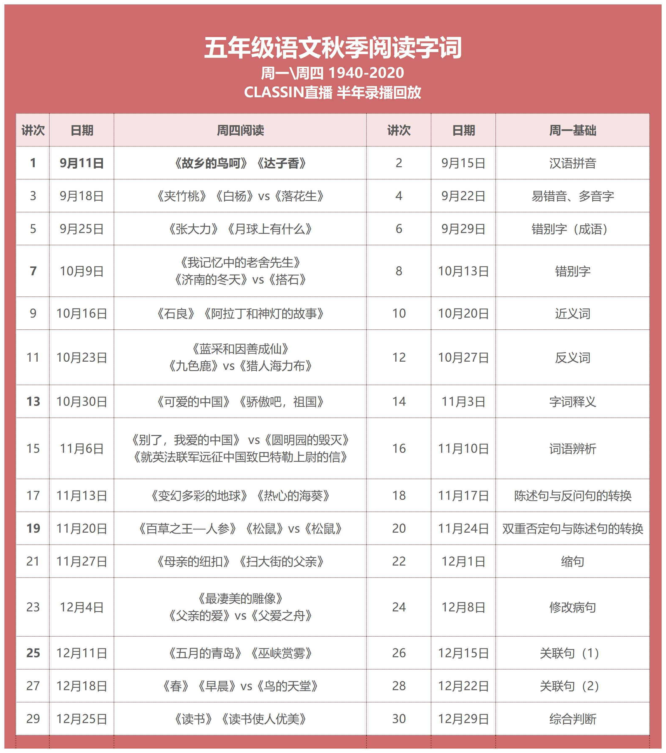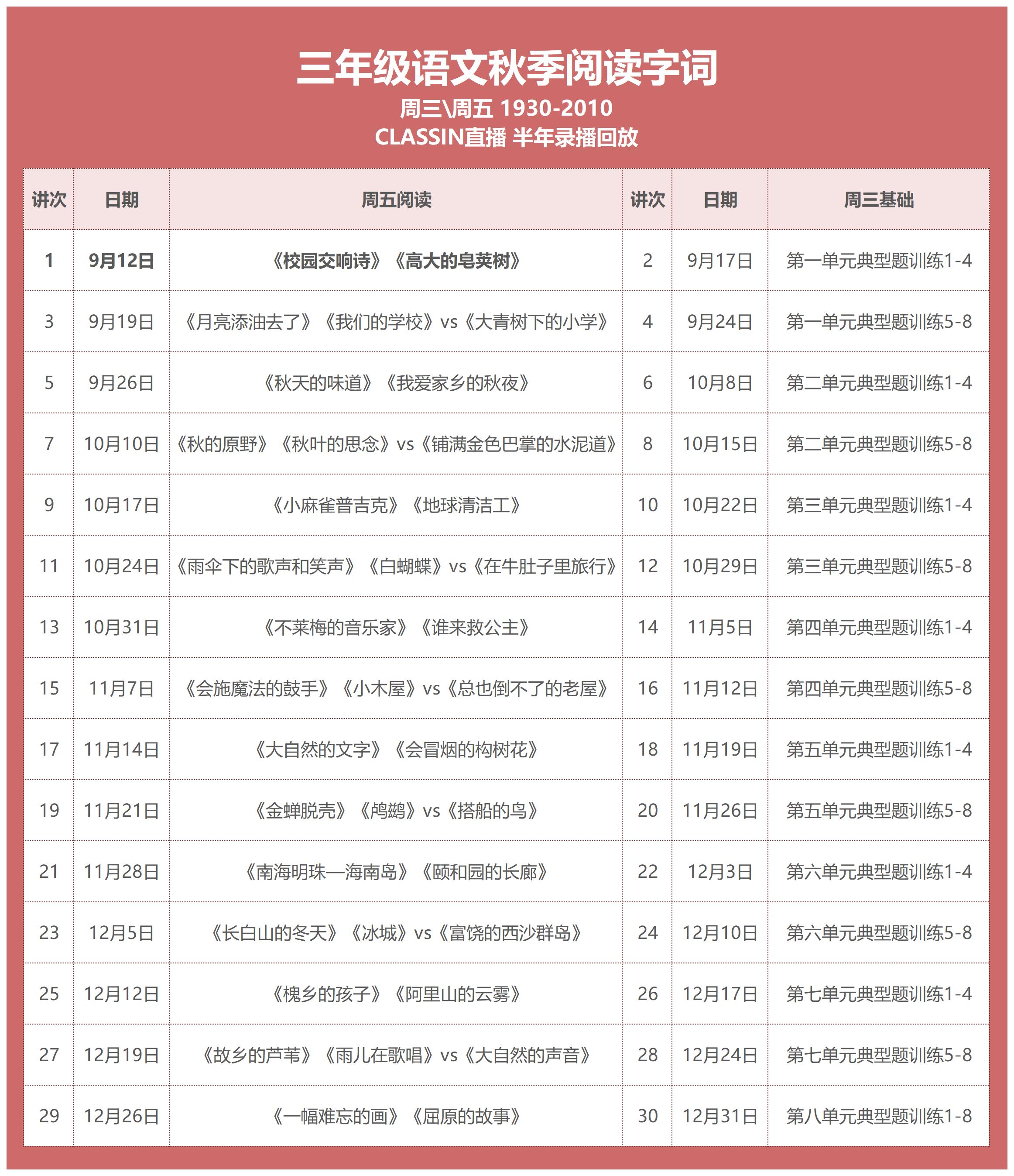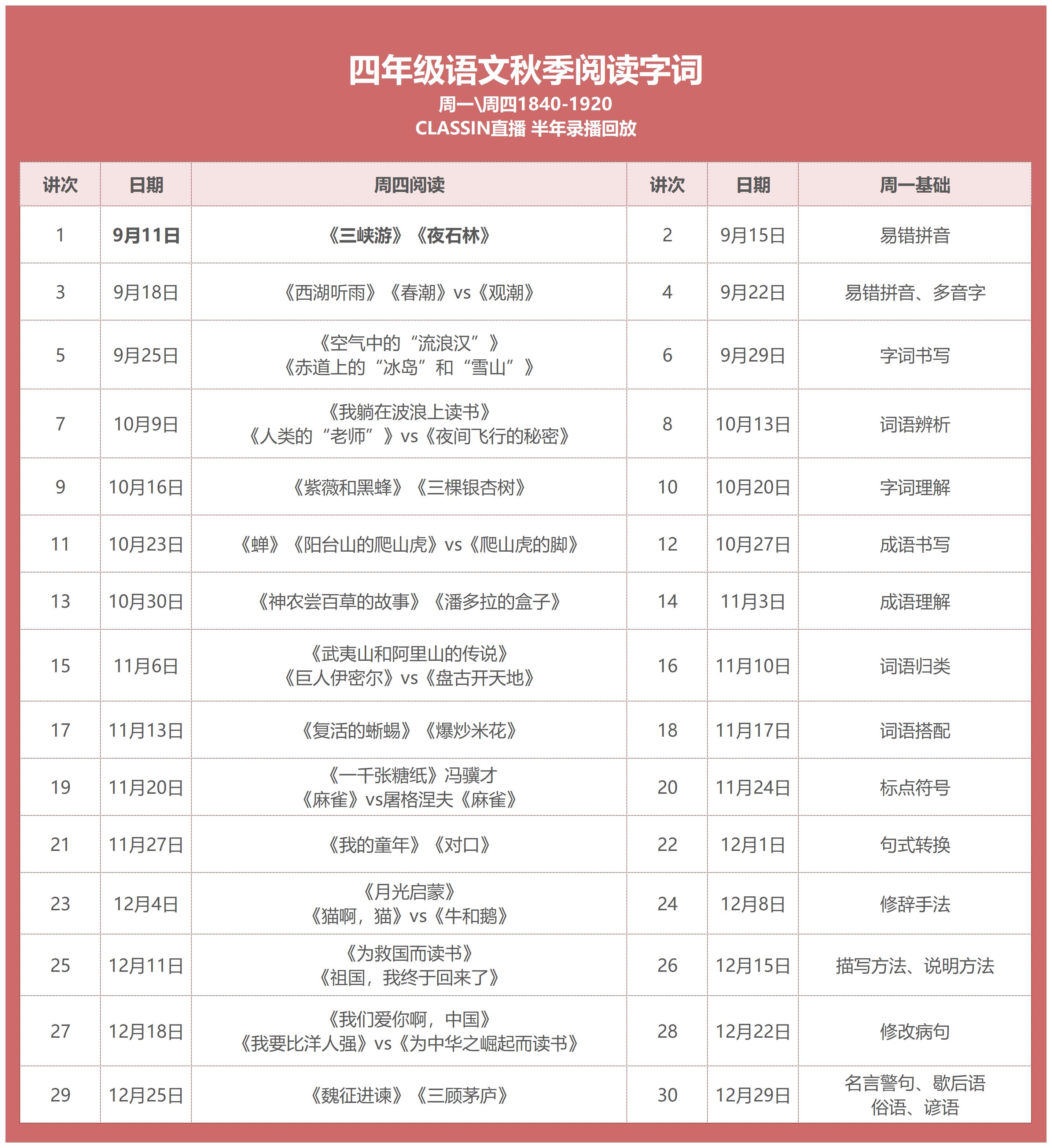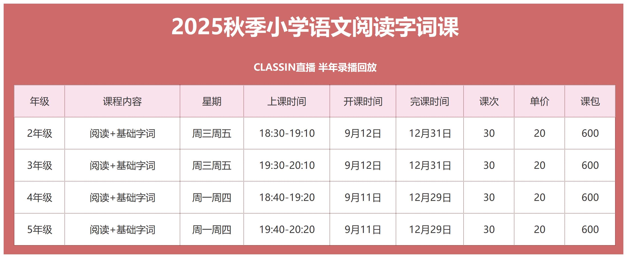 课程每周2次 一次阅读,一次基础字词